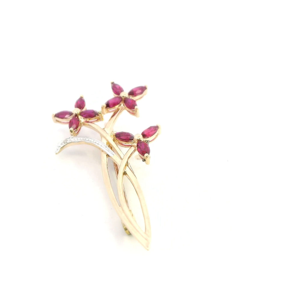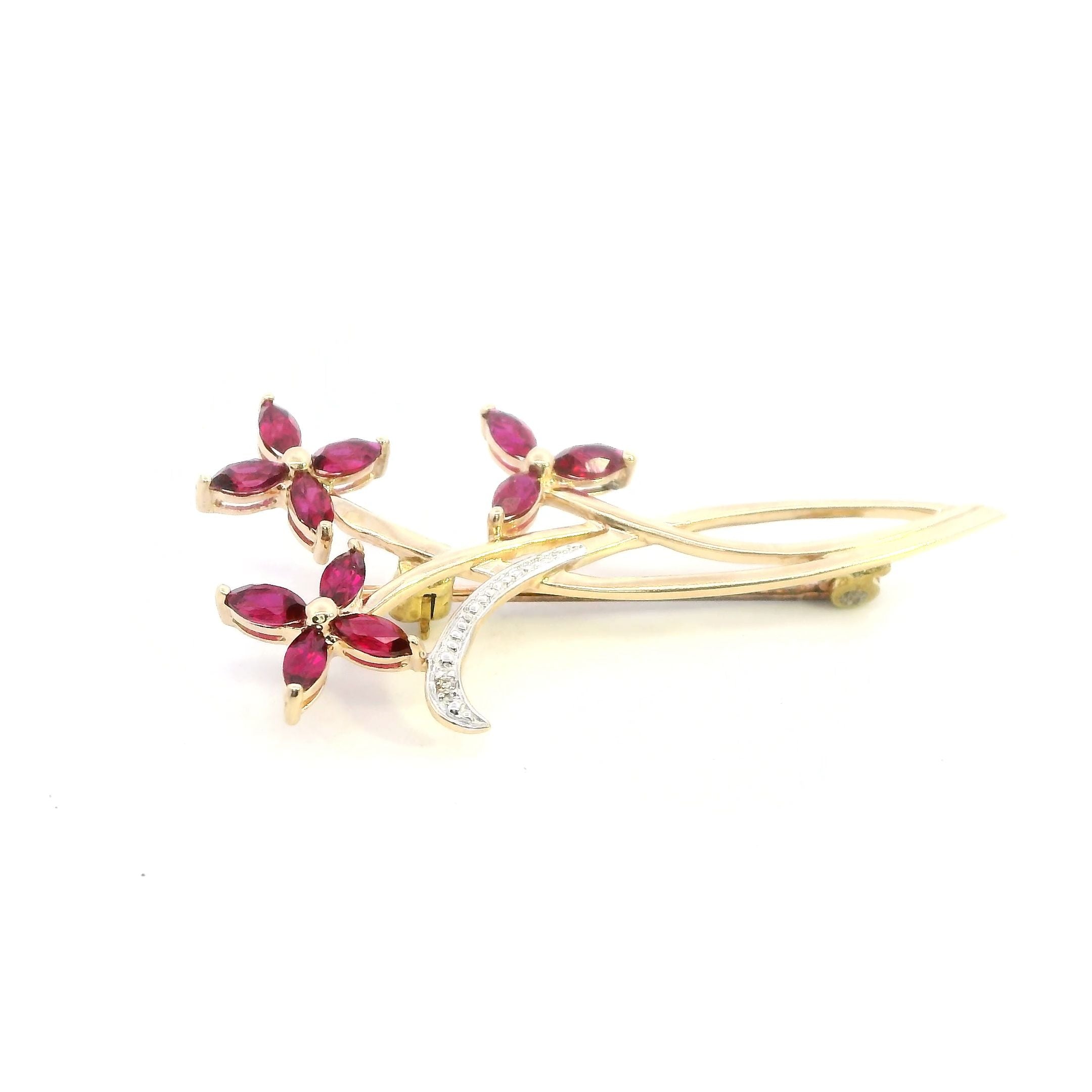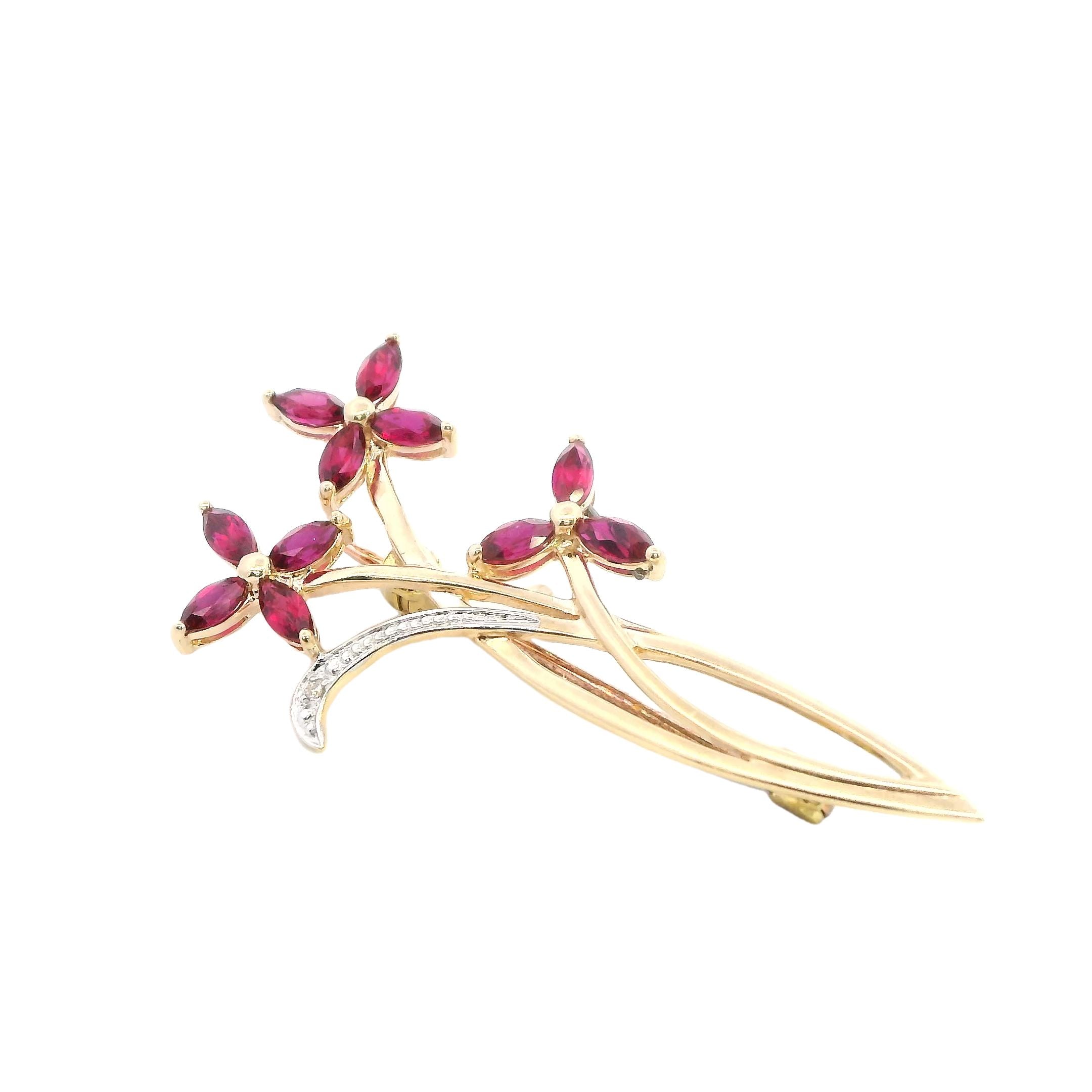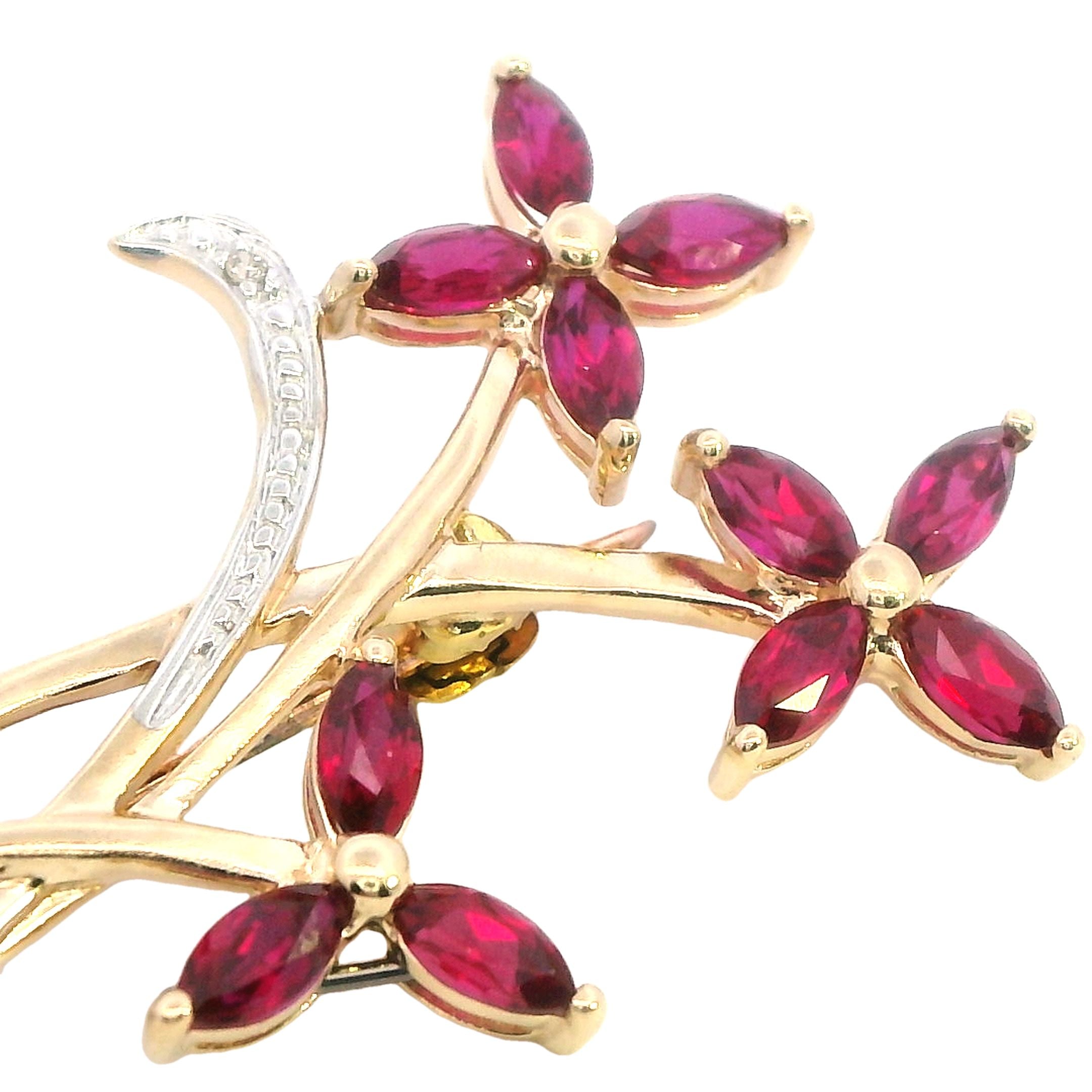 This stunning 9ct yellow gold brooch features a beautiful arrangement of synthetic rubies and a diamond, adding a touch of elegance and sophistication to any outfit. Perfect for special occasions or as a unique gift, this brooch is a timeless piece of jewellery that will be cherished for years to come.