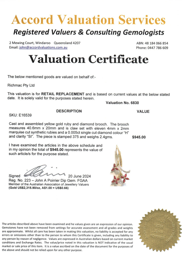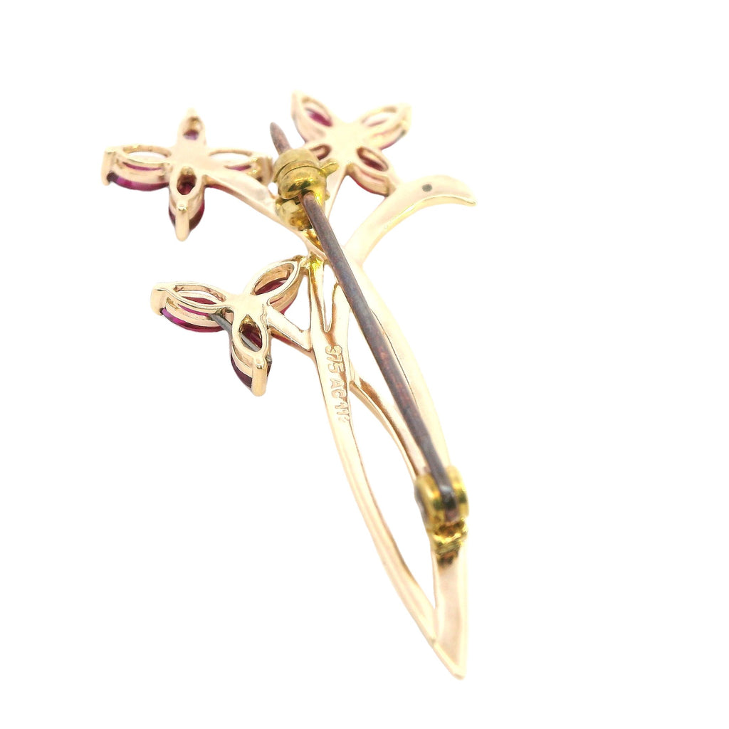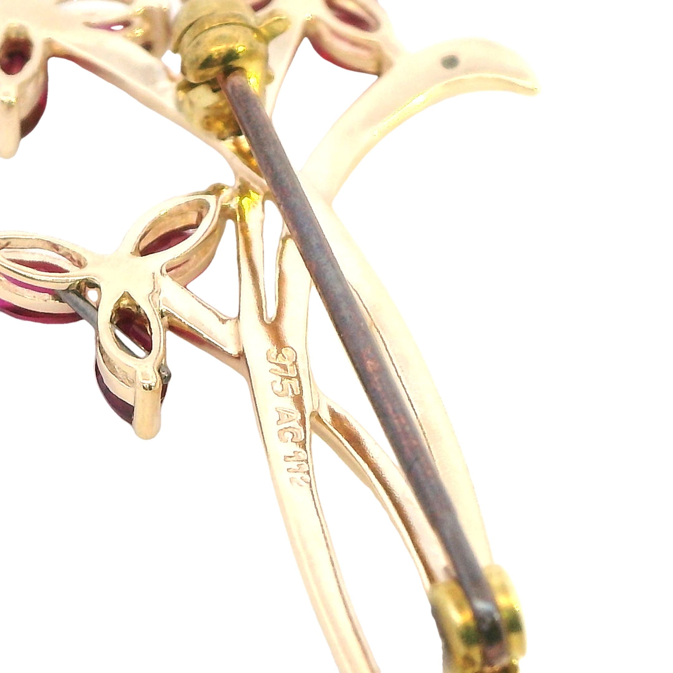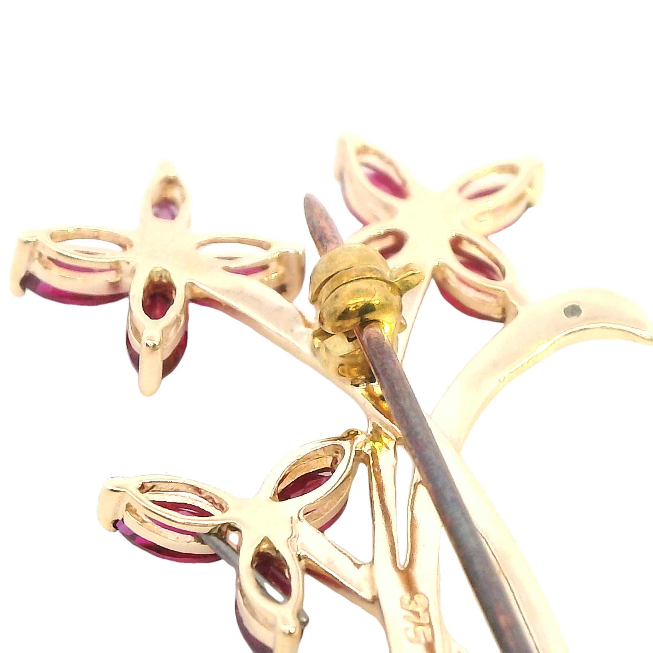 This stunning 9ct yellow gold brooch features a beautiful arrangement of synthetic rubies and a diamond, adding a touch of elegance and sophistication to any outfit. Perfect for special occasions or as a unique gift, this brooch is a timeless piece of jewellery that will be cherished for years to come.