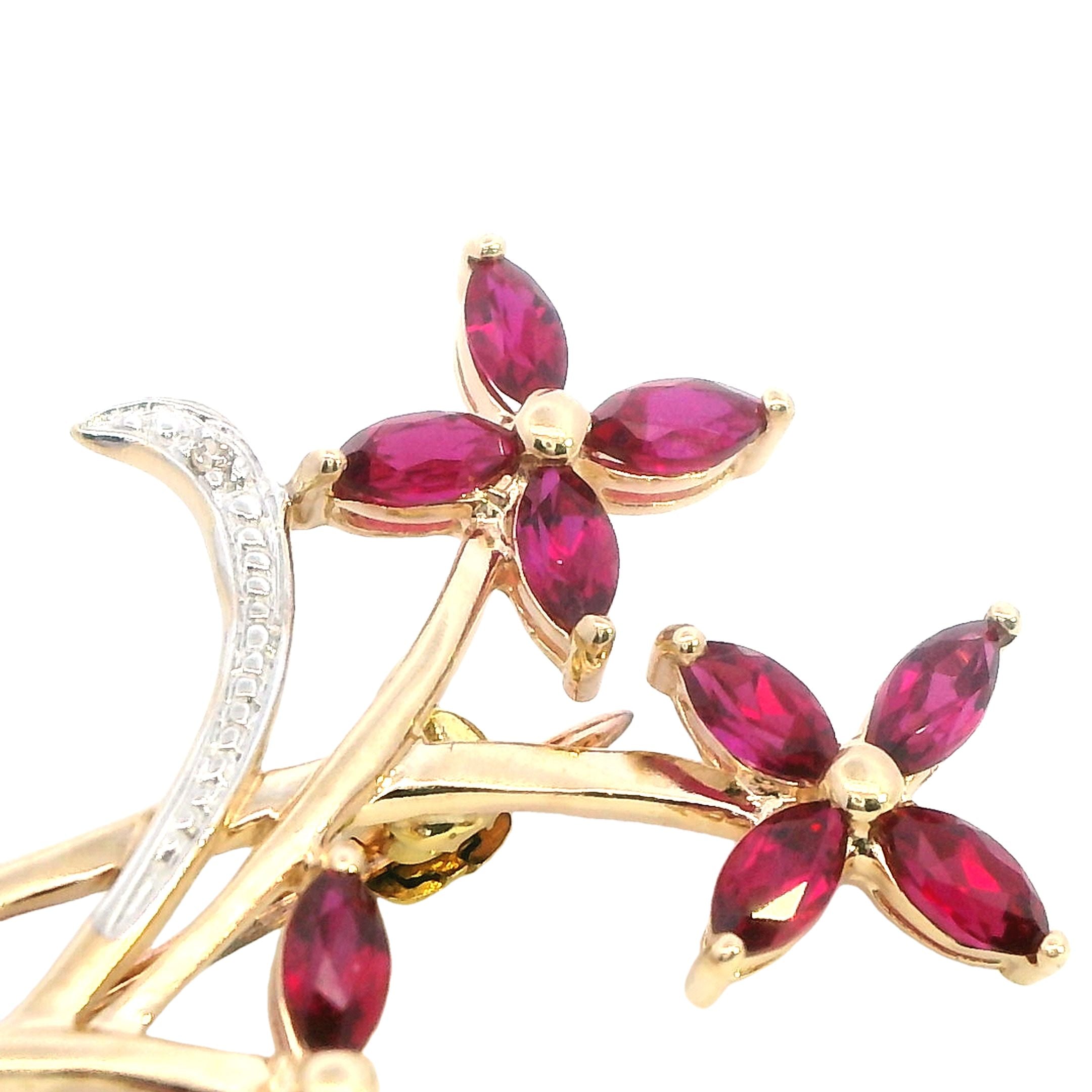 Synthetic rubies are created in a controlled environment, possessing the same physical, chemical, and optical properties as natural rubies. These lab-created gemstones are known for their vibrant color and clarity, offering an affordable and ethical alternative to natural rubies. The marquise cut synthetic rubies in this brooch add a brilliant and luxurious touch.