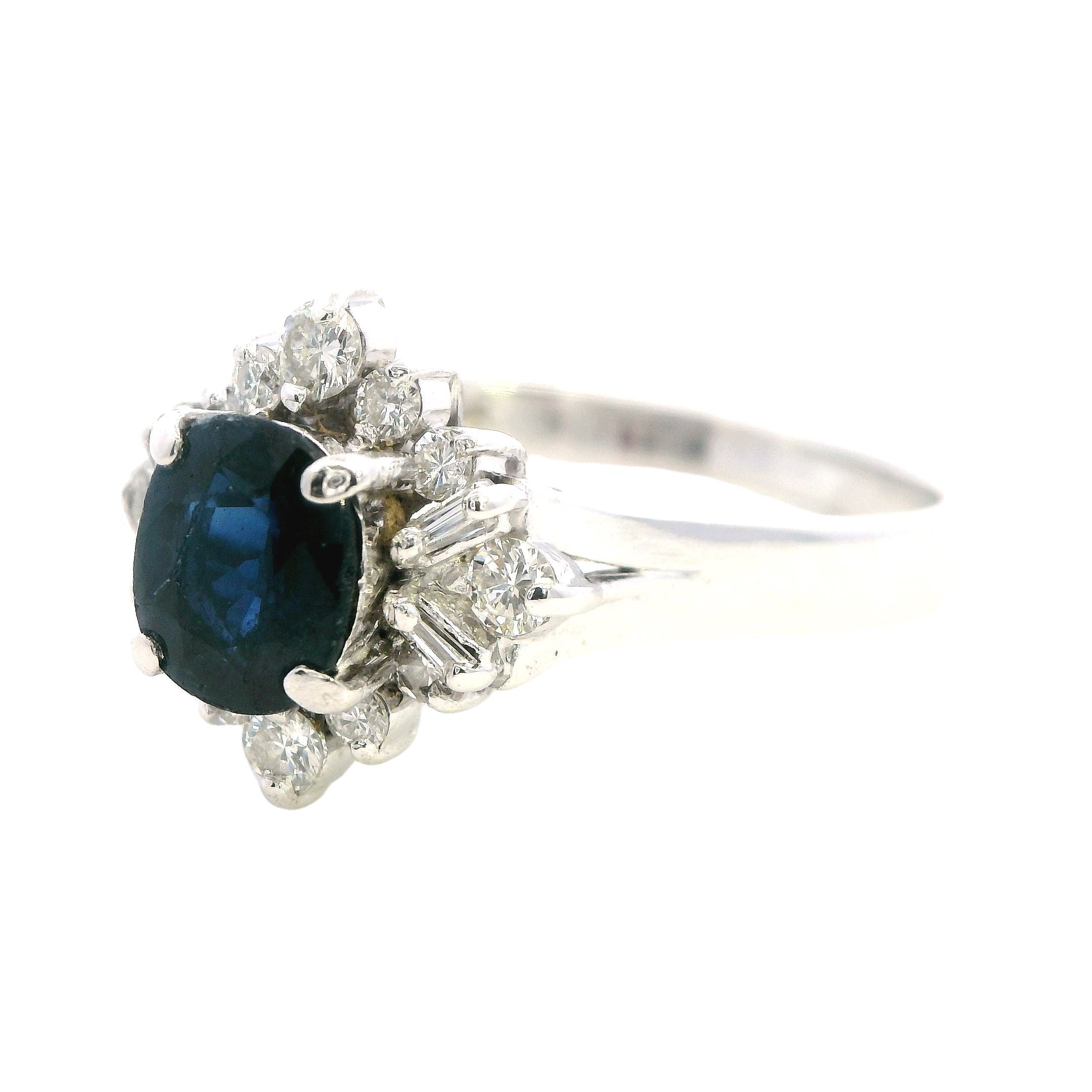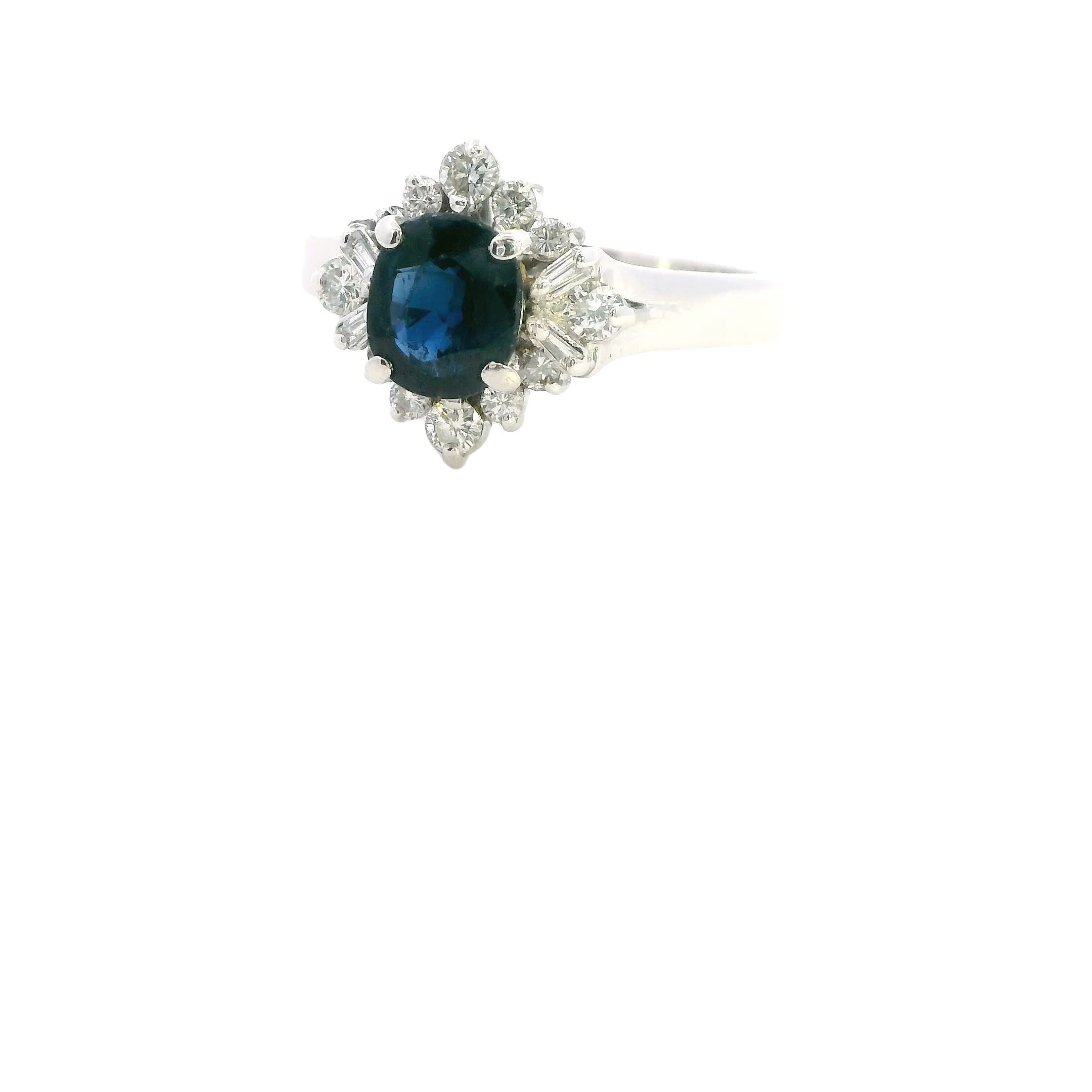 This exquisite 14k white gold ring is a perfect combination of elegance and luxury. The ring features a 2.4mm – 3.3mm flat tapered shank with split square flow-up shoulders, leading to a stunning cluster mount. It is claw-set with a dazzling combination of four (4) 0.02ct baguette cut diamonds, four (4) 0.03ct, and eight (8) 0.01ct brilliant cut diamonds. These diamonds are graded "H" in colour and "SI" in clarity, creating a sparkling surround for the central 1.50ct oval cut deep blue sapphire. The sapphire’s rich colour and the diamonds' brilliance make this ring a truly eye-catching and timeless piece.