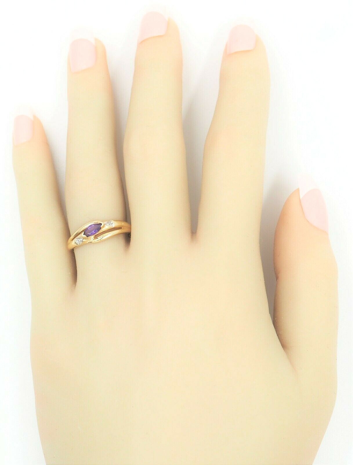 A pretty 9ct yellow gold ring featuring a purple Amethyst in the centre with a Diamond set each side on a split crossover style band.