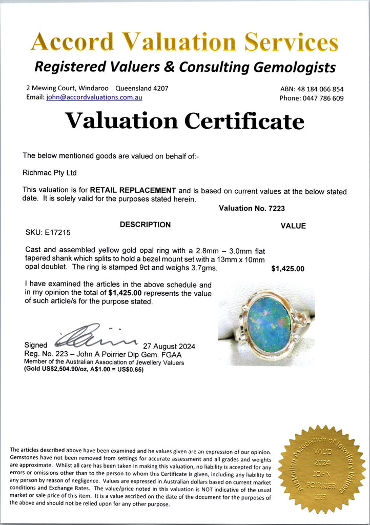 Crafted from 9ct yellow gold, the ring is stamped for authenticity and weighs 3.7gms, providing a substantial yet comfortable feel. The warmth of the yellow gold beautifully complements the vibrant colors of the opal, making this ring a timeless addition to any jewellery collection.