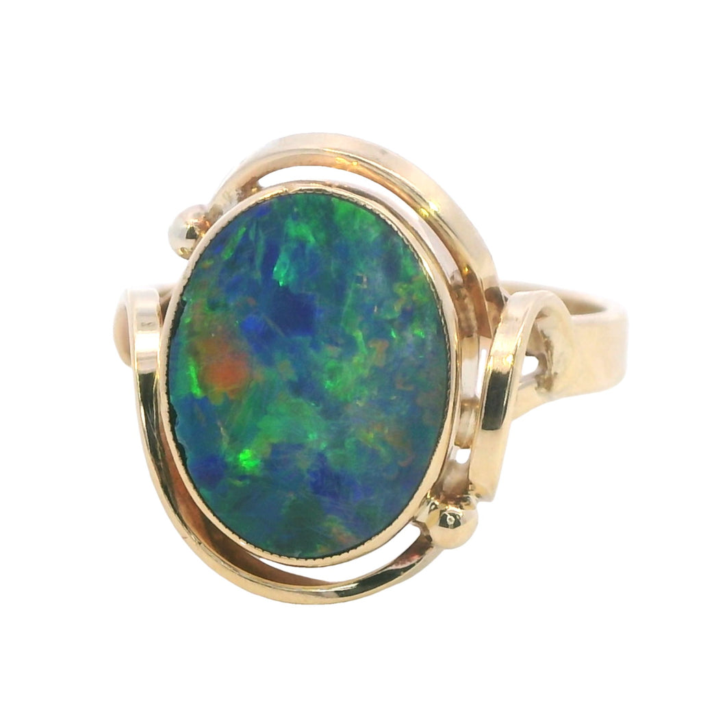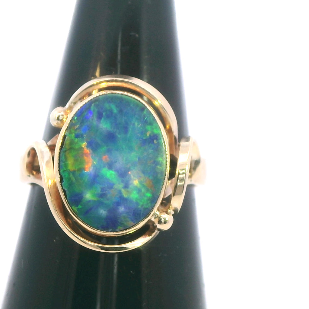 This opal ring is perfect for those who love colorful, unique jewelry that makes a statement. The opal doublet’s dazzling play of color combined with the elegant yellow gold setting ensures that this ring will be a cherished piece for years to come. Whether worn daily or saved for special occasions, it’s sure to draw admiration and compliments.