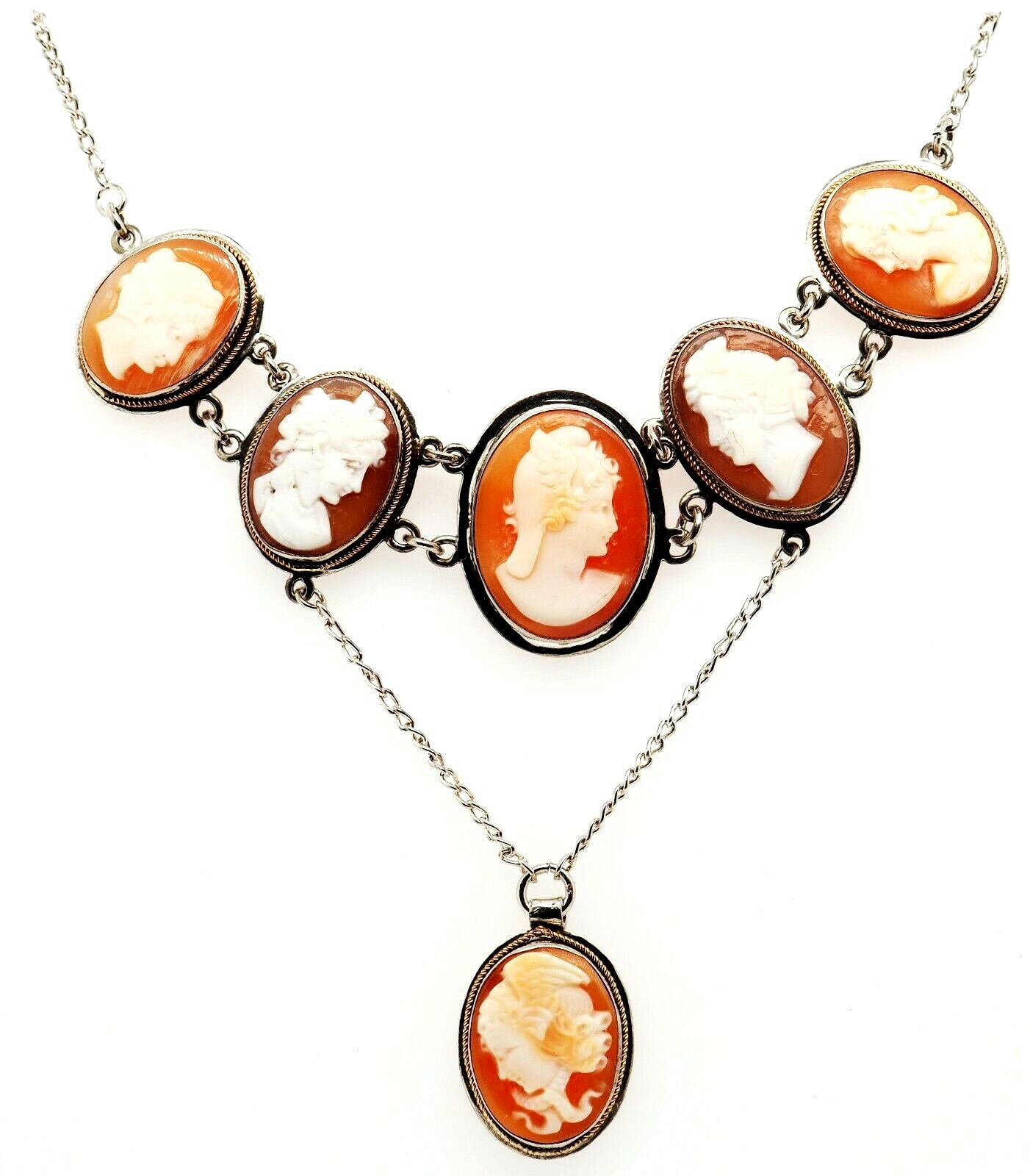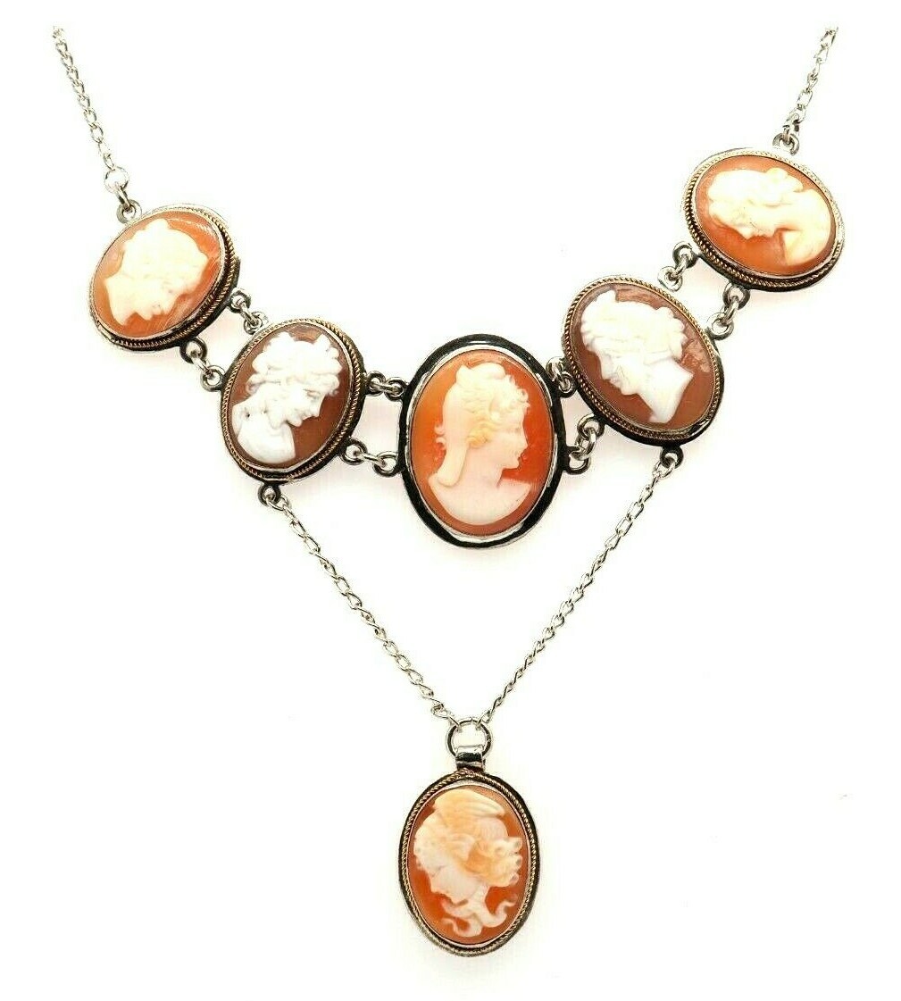 A gorgeous necklace with the centrepiece featuring five shell cameos and another dropped below on a chain.