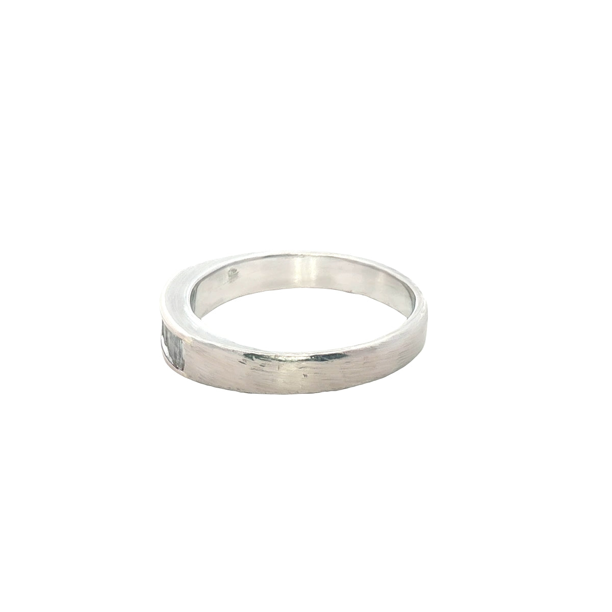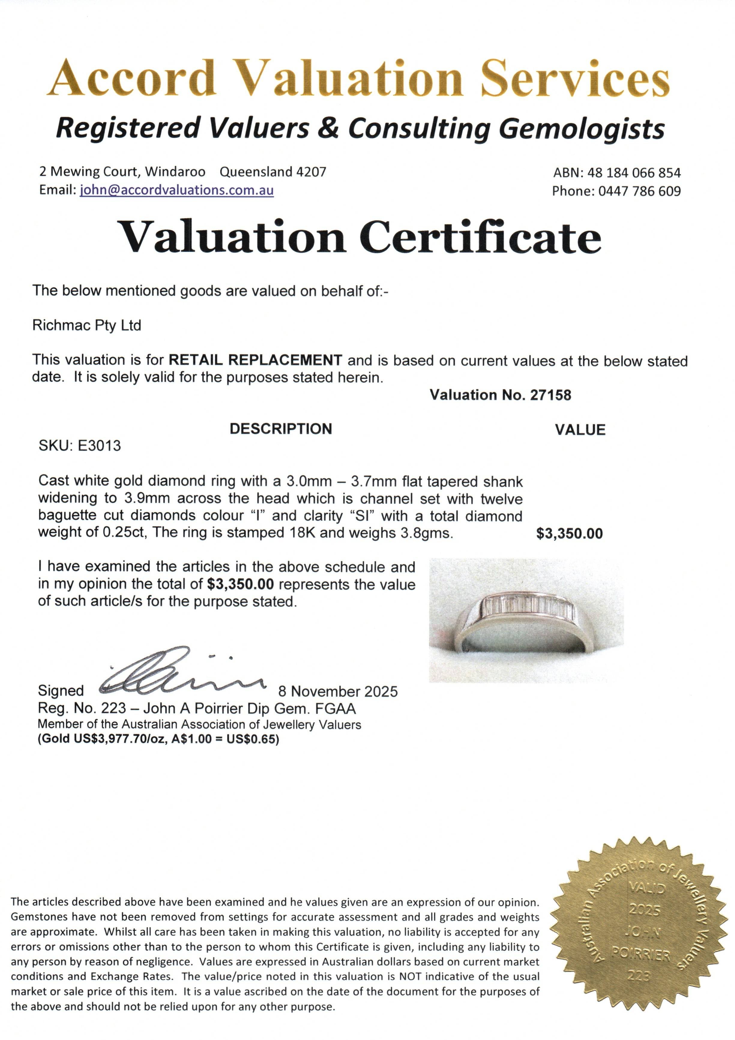 Expertly cast in solid 18ct white gold, the band features a 3.0mm–3.7mm flat tapered shank, widening to 3.9mm across the head. The diamonds are channel set for a sleek, modern finish, ensuring both brilliance and durability. Each of the twelve baguette-cut diamonds is graded colour “I” and clarity “SI”, with a total diamond weight of 0.25ct.