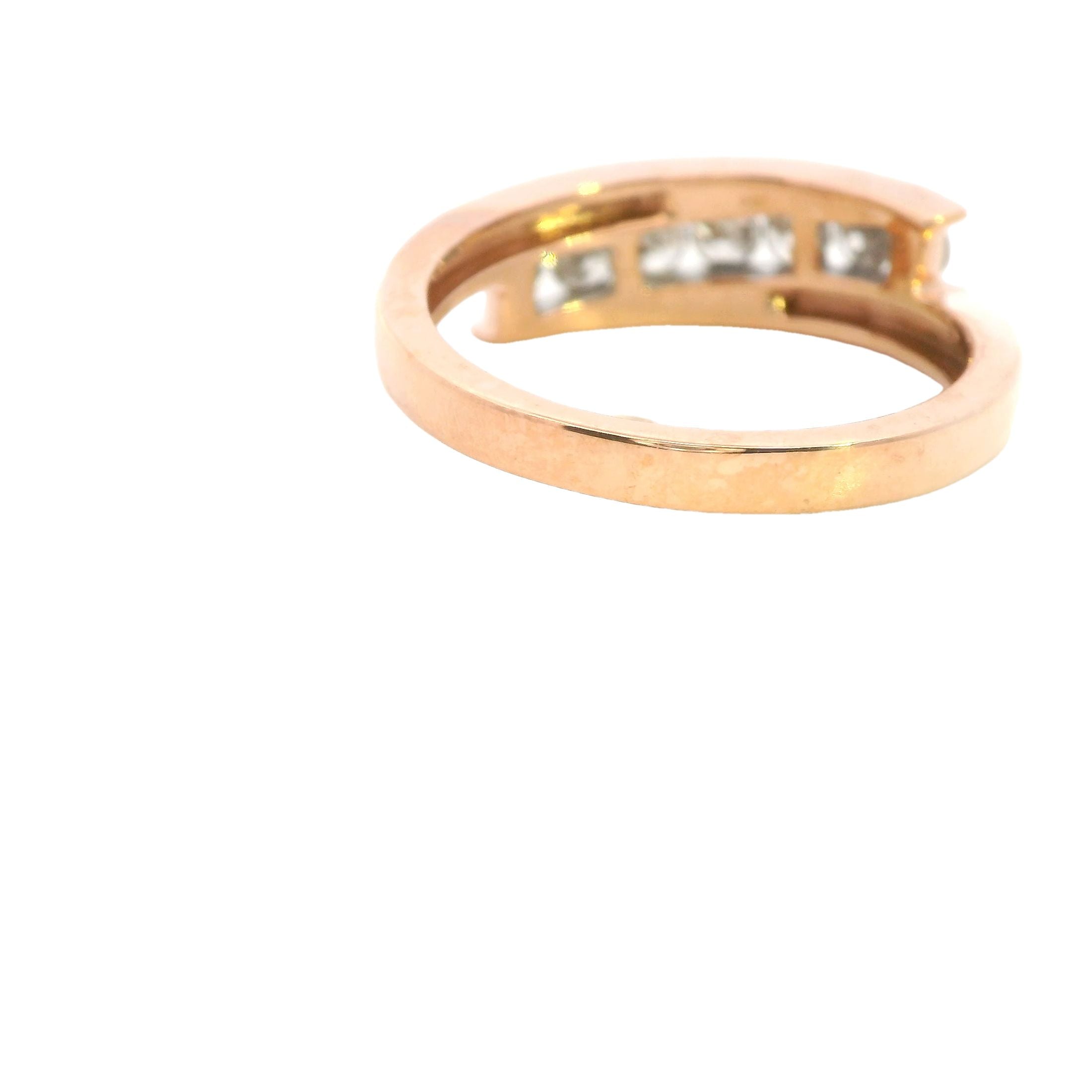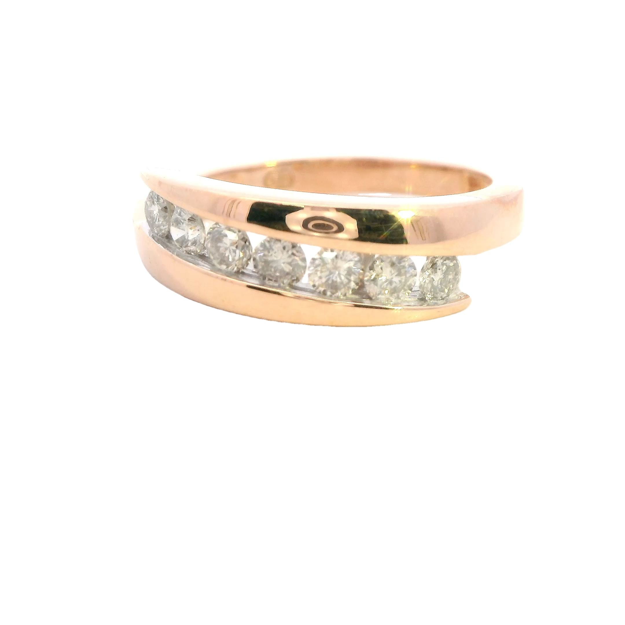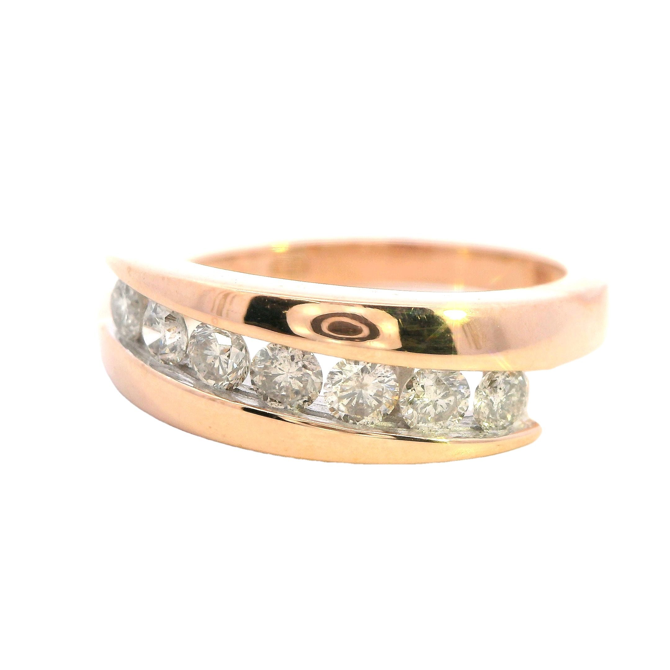 This stunning 9ct rose gold ring features a 2.4mm - 2.6mm flat tapered shank, which gracefully crosses at the head to form a channel mount. Set with seven brilliant cut diamonds, this ring offers a total diamond weight of 0.50ct. The diamonds are graded “J” in color and “I1” in clarity, providing a beautiful sparkle against the warm rose gold setting. This elegant ring is perfect for those who appreciate classic design with a modern twist, making it a versatile addition to any jewellery collection.