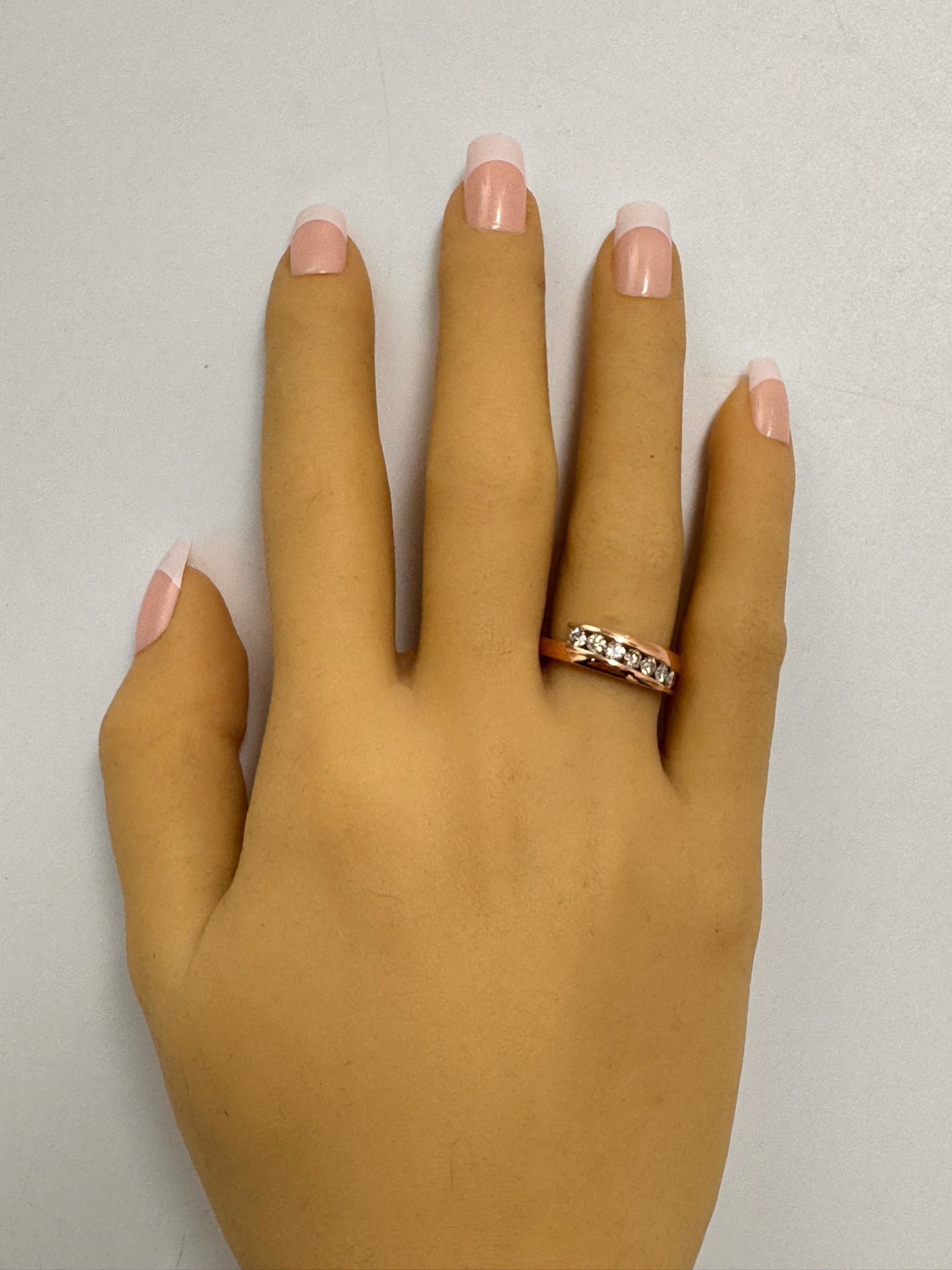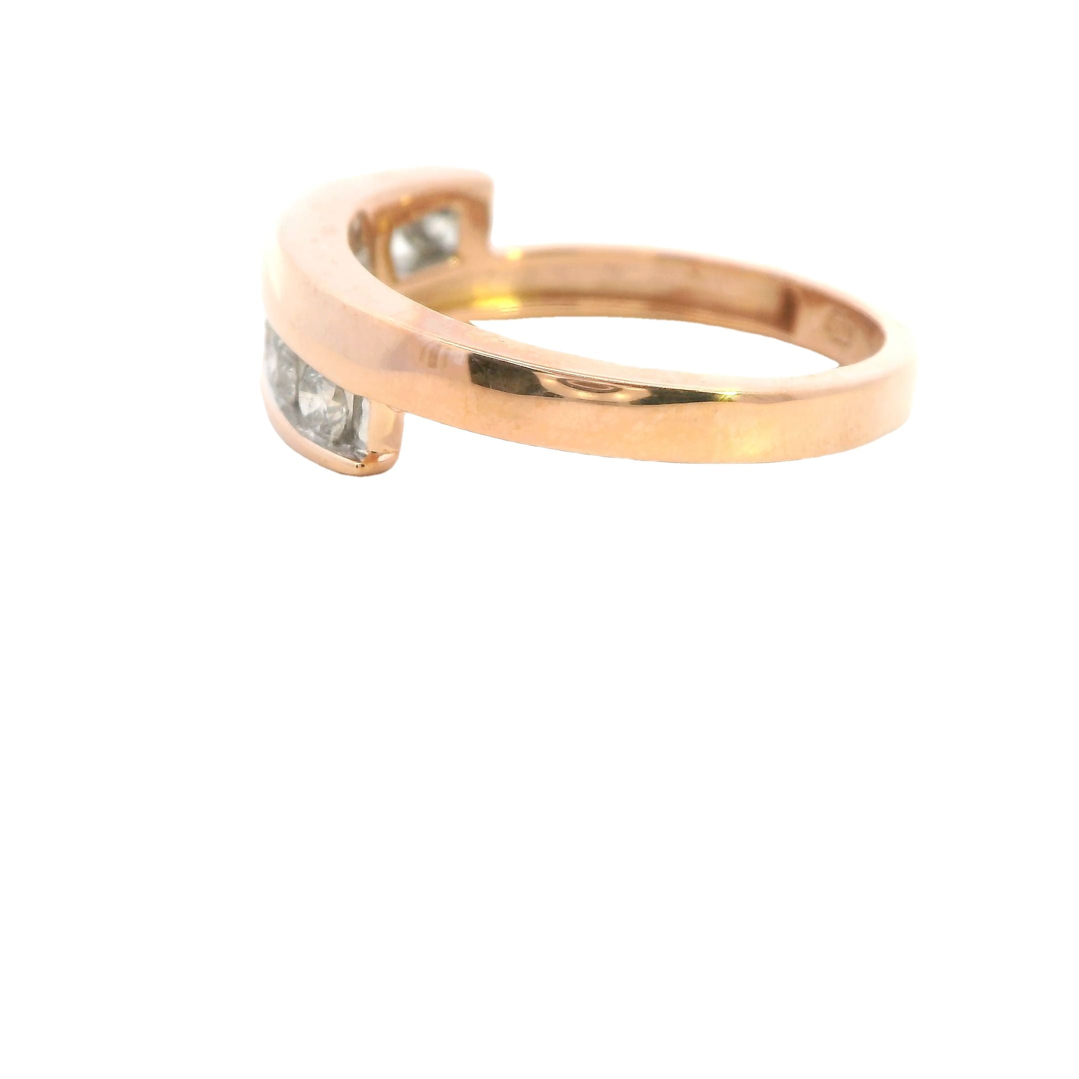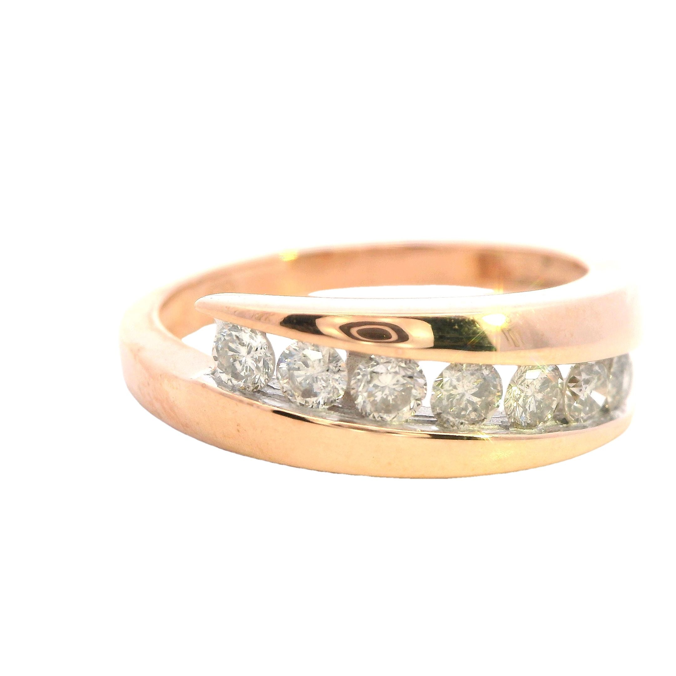 This stunning 9ct rose gold ring features a 2.4mm - 2.6mm flat tapered shank, which gracefully crosses at the head to form a channel mount. Set with seven brilliant cut diamonds, this ring offers a total diamond weight of 0.50ct. The diamonds are graded “J” in color and “I1” in clarity, providing a beautiful sparkle against the warm rose gold setting. This elegant ring is perfect for those who appreciate classic design with a modern twist, making it a versatile addition to any jewellery collection.