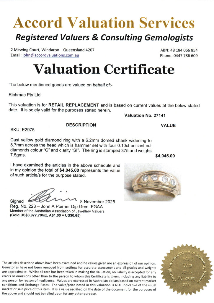 Stamped 375 and weighing 7.5 grams, this piece feels substantial and luxurious on the hand. It comes with an independent certificate of valuation, confirming an insurance replacement value of $4045.
