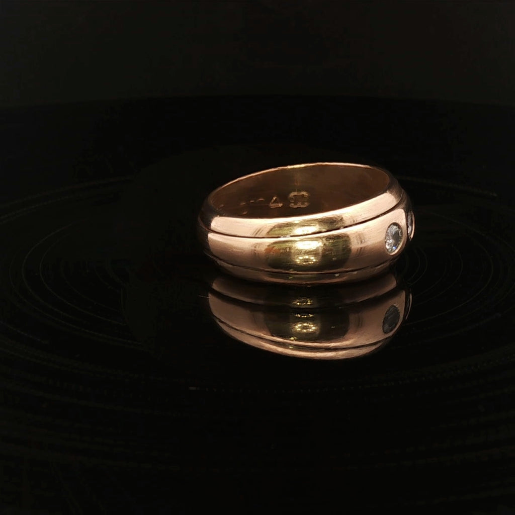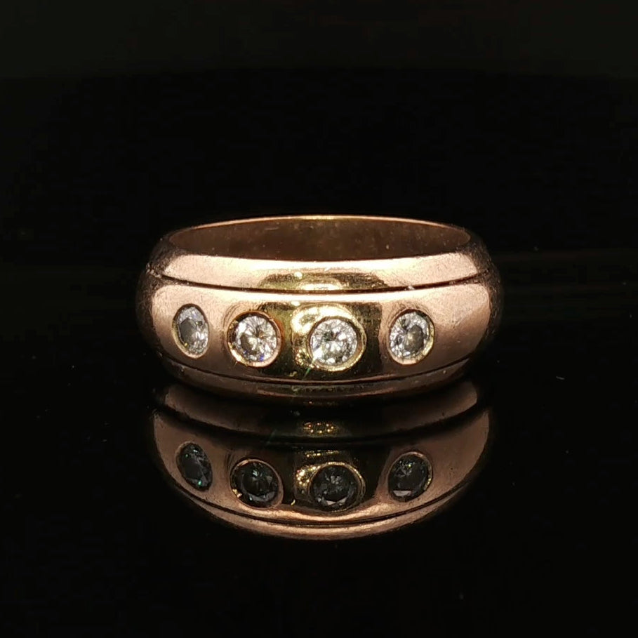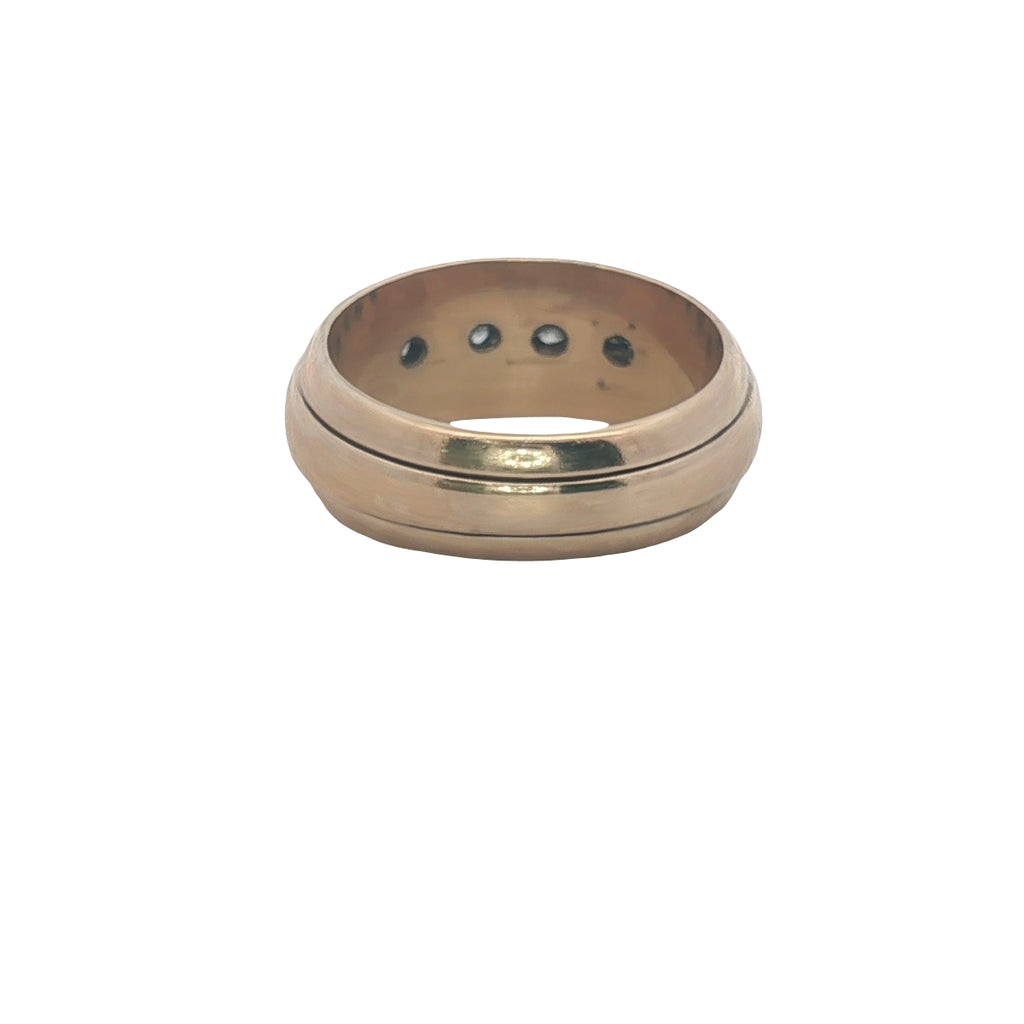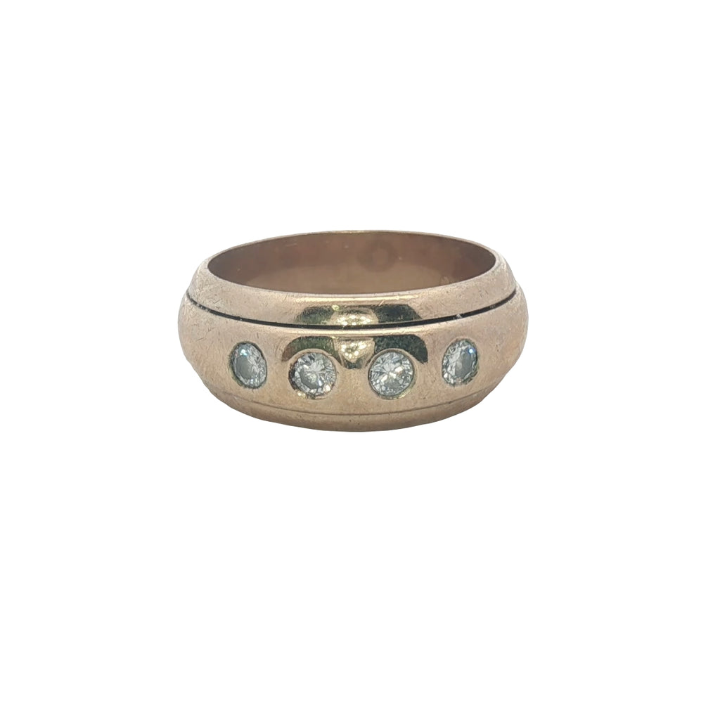 The ring is cast in solid 9ct gold, designed with a 6.2mm domed shank that widens to 8.7mm across the head, where four 0.10ct brilliant-cut diamonds are securely hammer set. The diamonds are of colour G and clarity SI, offering a total diamond weight of 0.40ct.