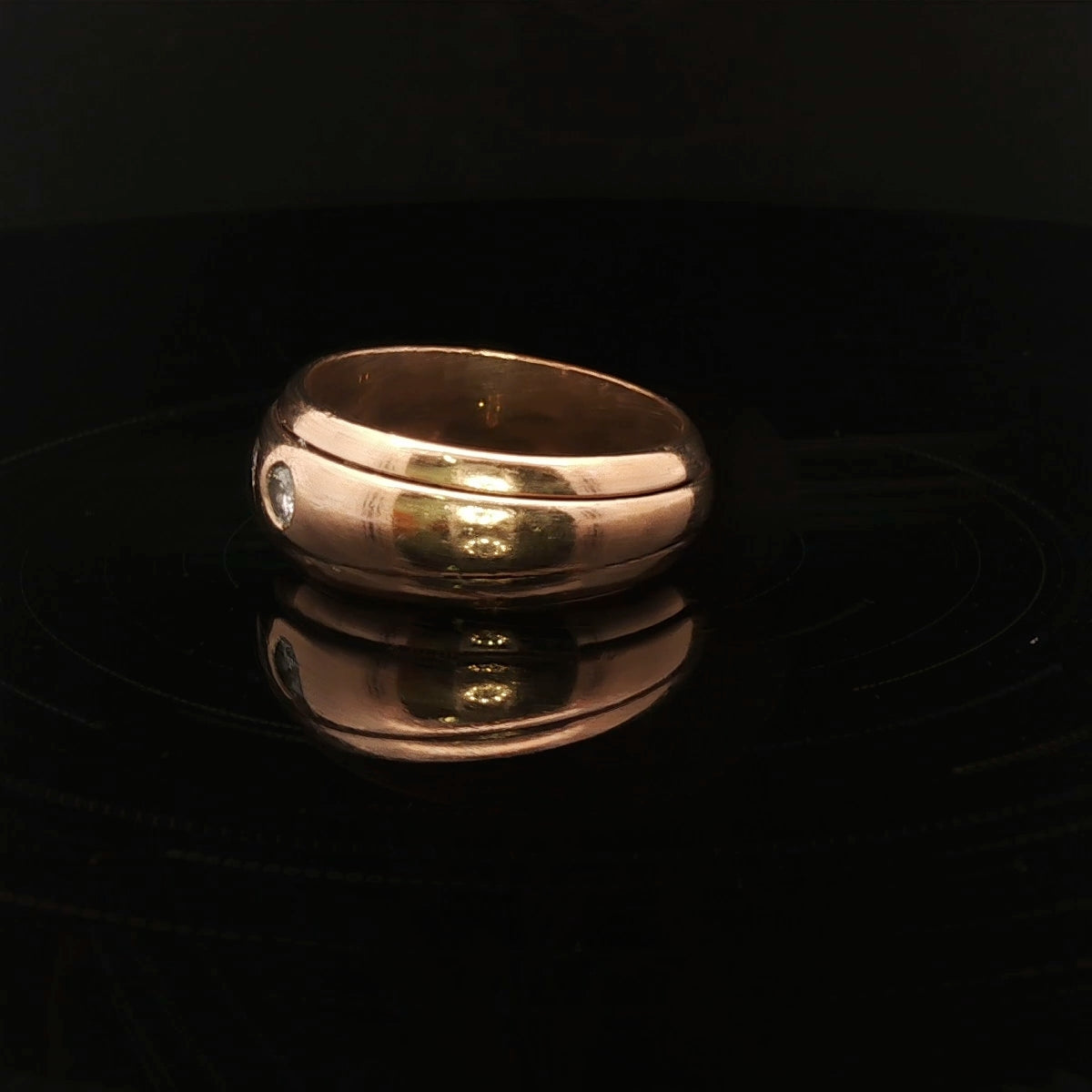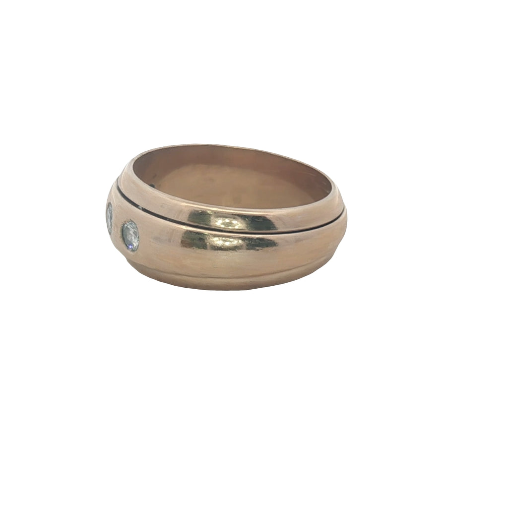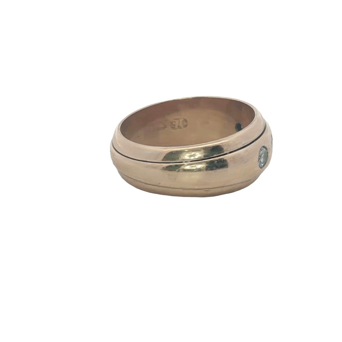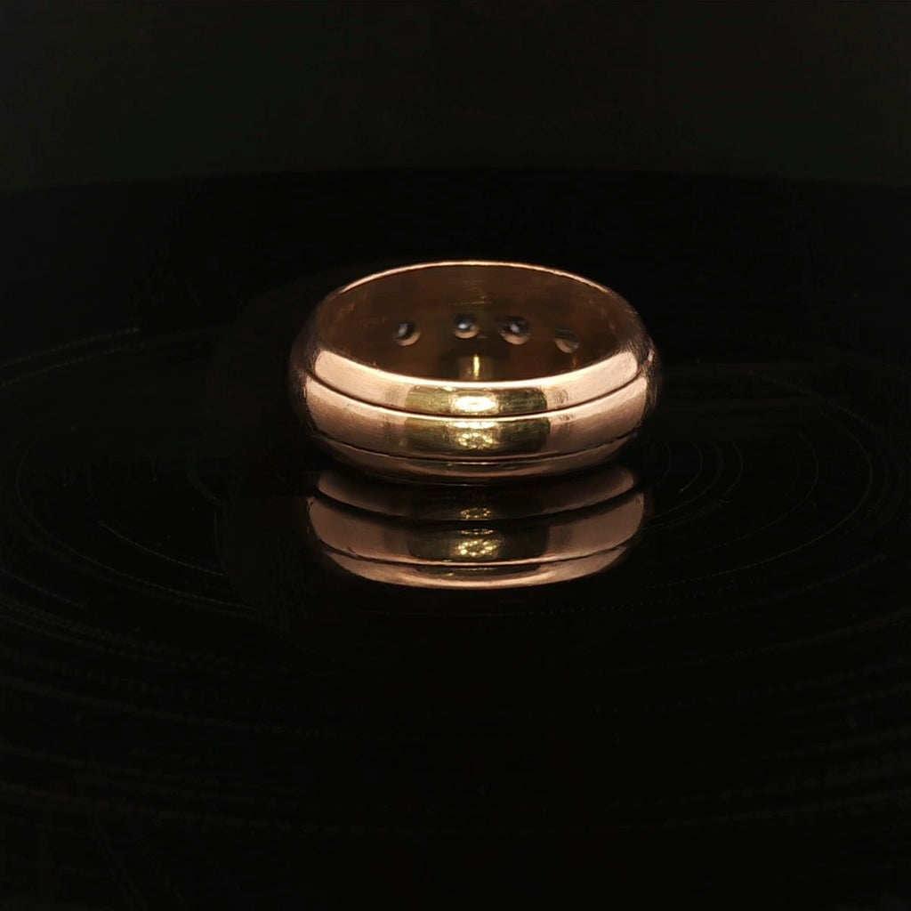 The ring is cast in solid 9ct gold, designed with a 6.2mm domed shank that widens to 8.7mm across the head, where four 0.10ct brilliant-cut diamonds are securely hammer set. The diamonds are of colour G and clarity SI, offering a total diamond weight of 0.40ct.
