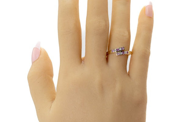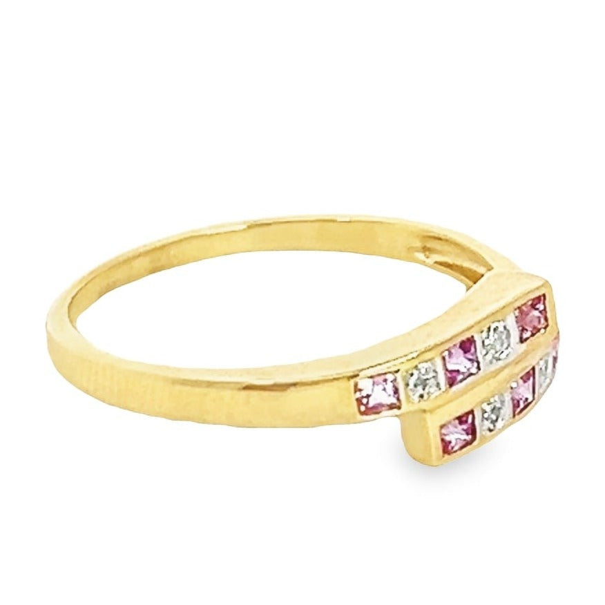 Discover the allure of modern elegance combined with timeless style in this beautifully crafted 9ct yellow gold ring. Adorned with synthetic pink sapphires and sparkling diamonds, it is the perfect accessory to add a pop of colour and glamour to any outfit. This piece is a must-have for those who appreciate the mesmerizing beauty of gemstones.