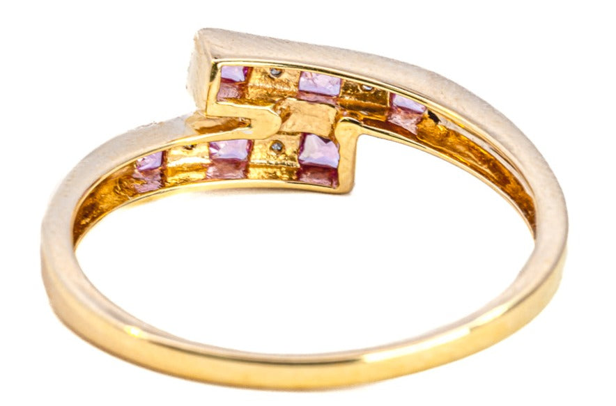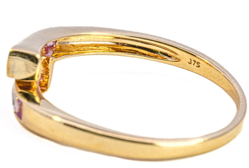 Elegant 9ct Yellow Gold Ring with Synthetic Pink Sapphires and Diamonds - A Touch of Modern Glamour