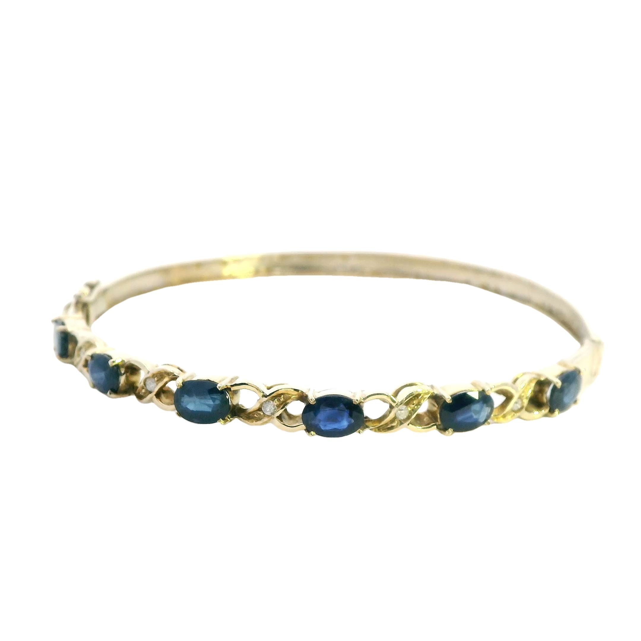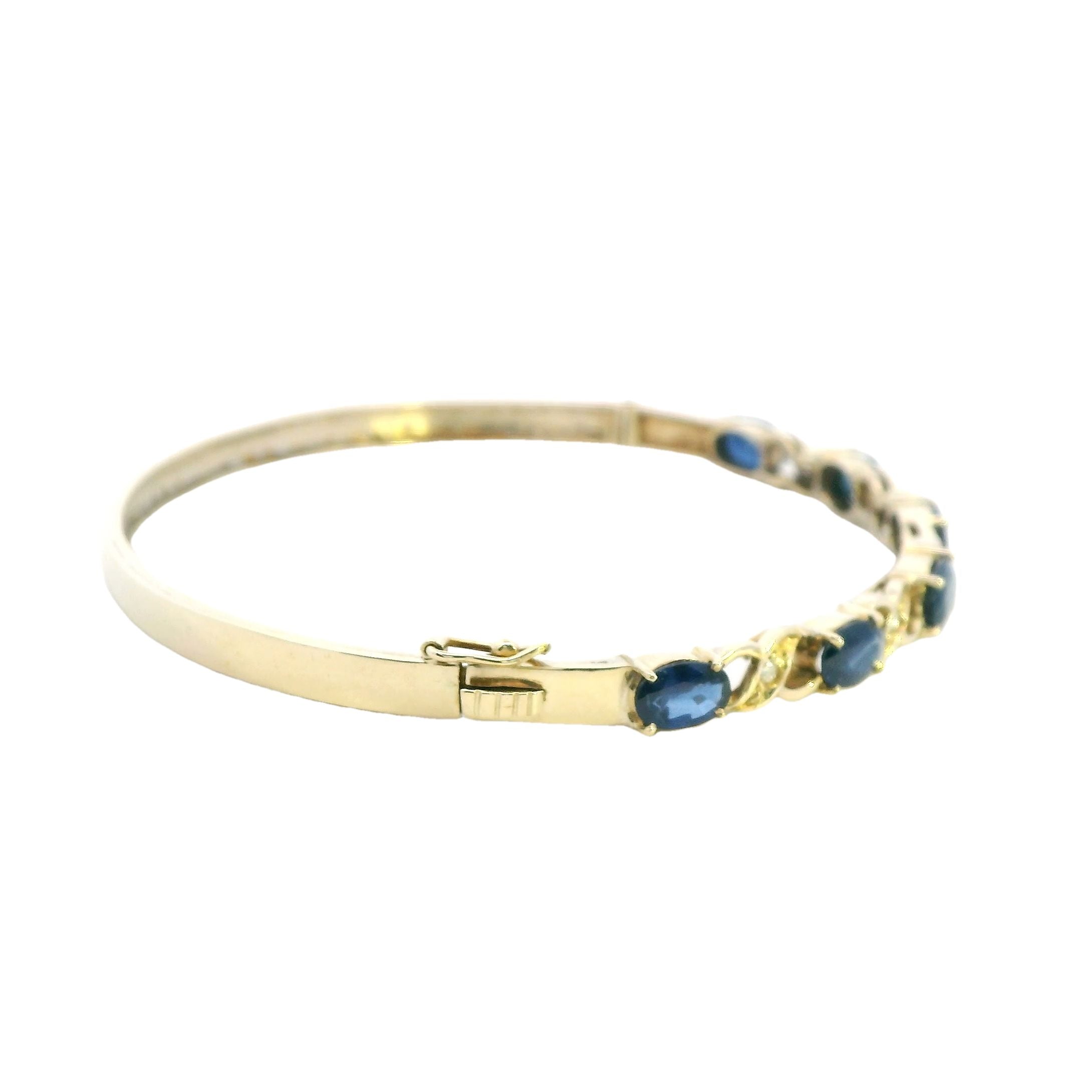 This exquisite 14ct yellow gold hinged bangle is a breathtaking piece that blends timeless elegance with luxury. The bangle is 3.9mm wide at the back, gracefully widening to 4.9mm at the top, which is beautifully claw-set with six 6mm x 4mm oval cut sapphires. The deep blue sapphires are perfectly complemented by five grain-set brilliant cut diamonds, totalling 0.02ct, and graded "H" in colour and "SI" in clarity. This striking bangle is an ideal accessory for those who appreciate fine craftsmanship and a touch of glamour.