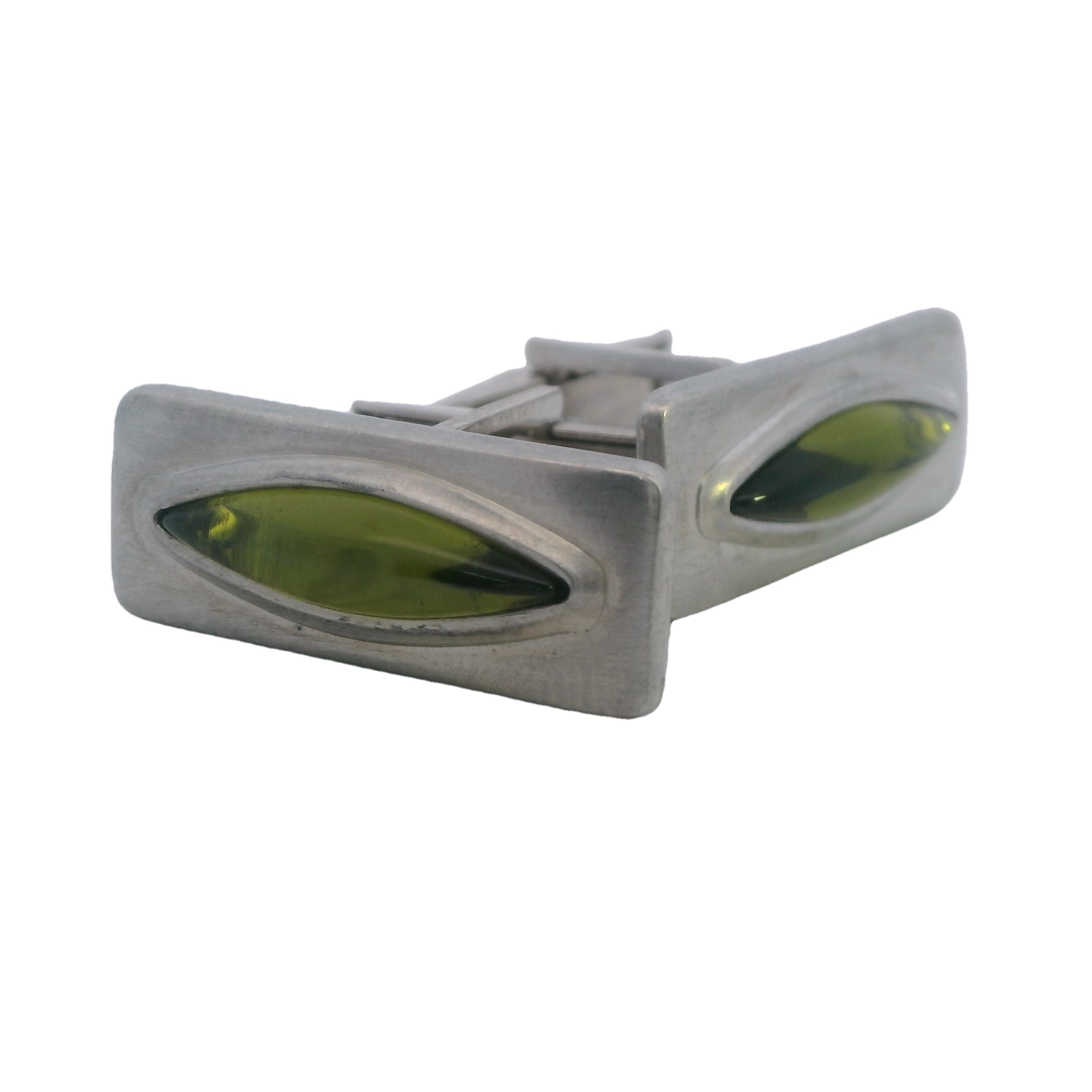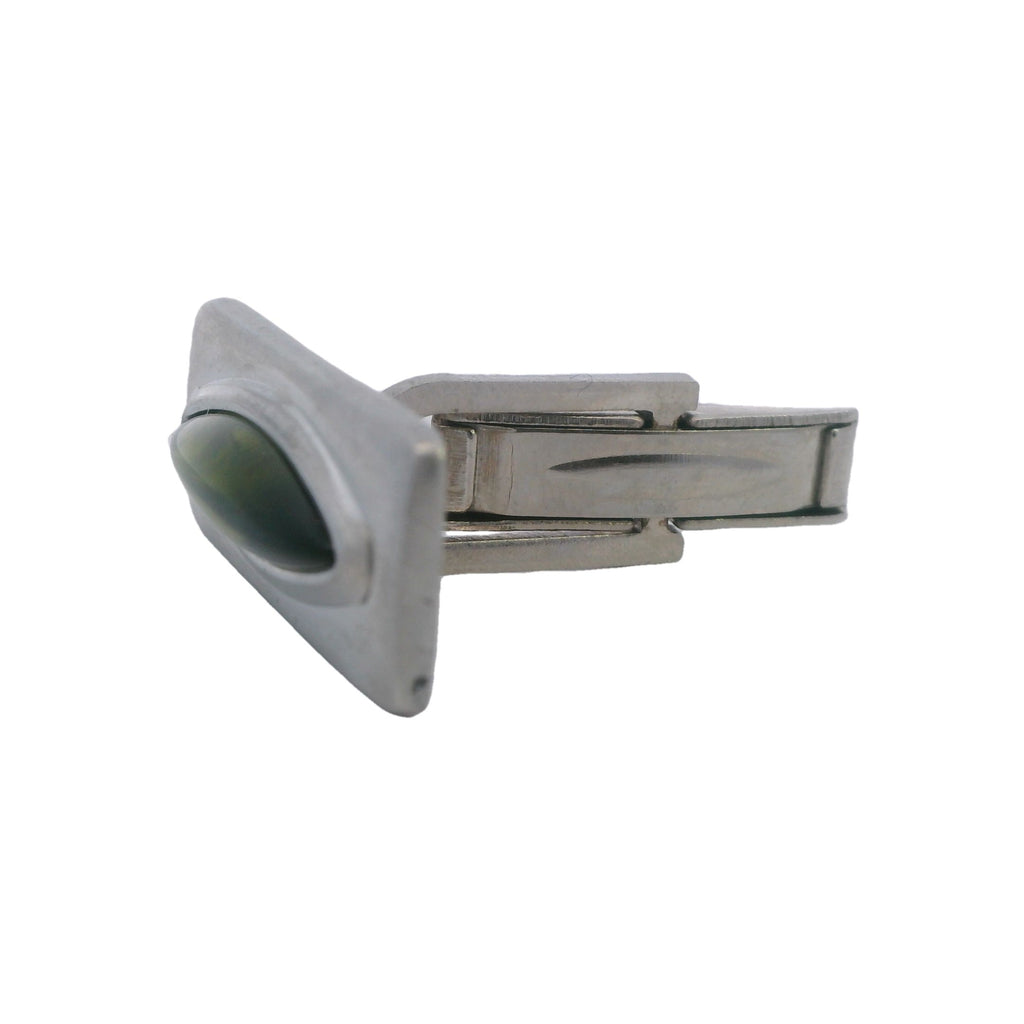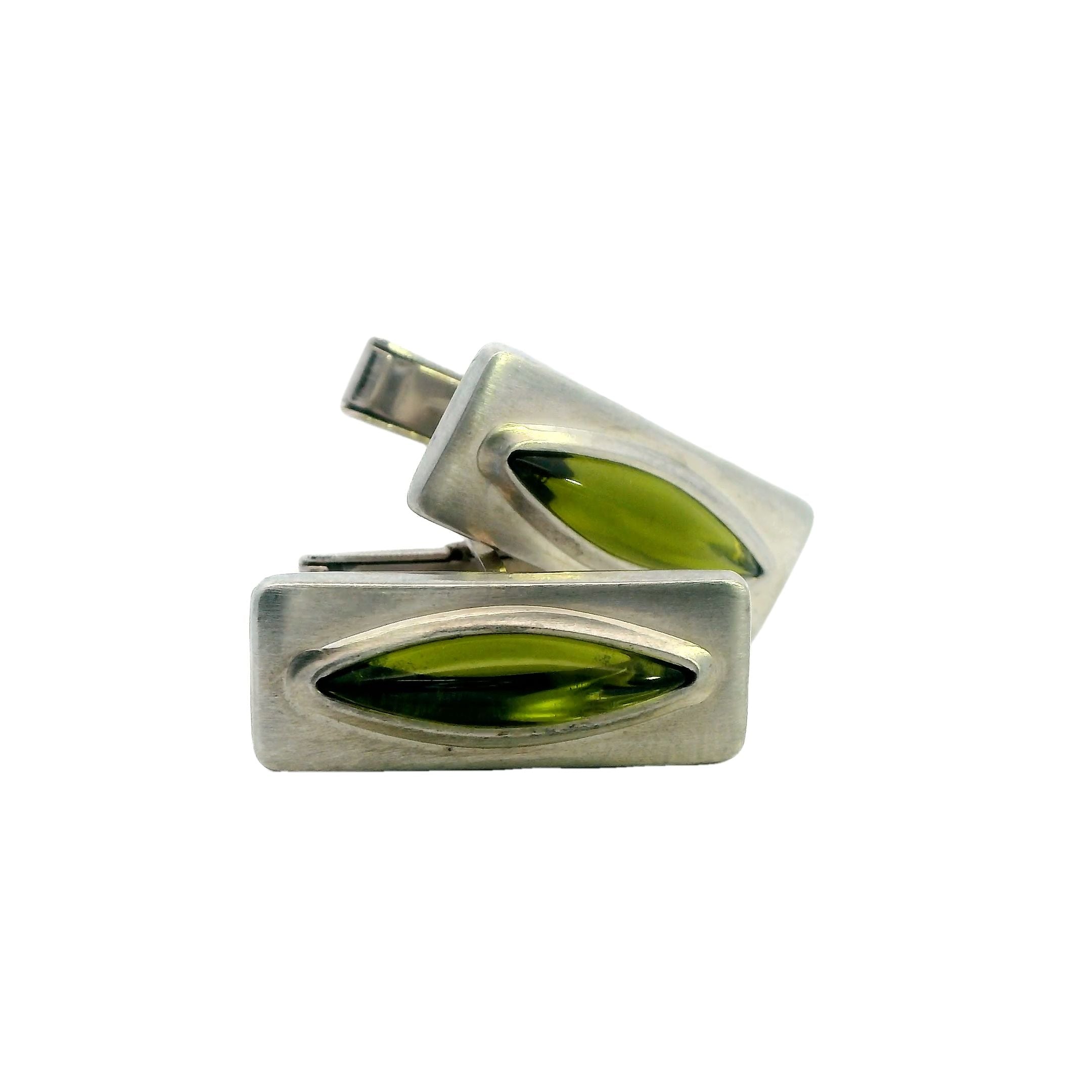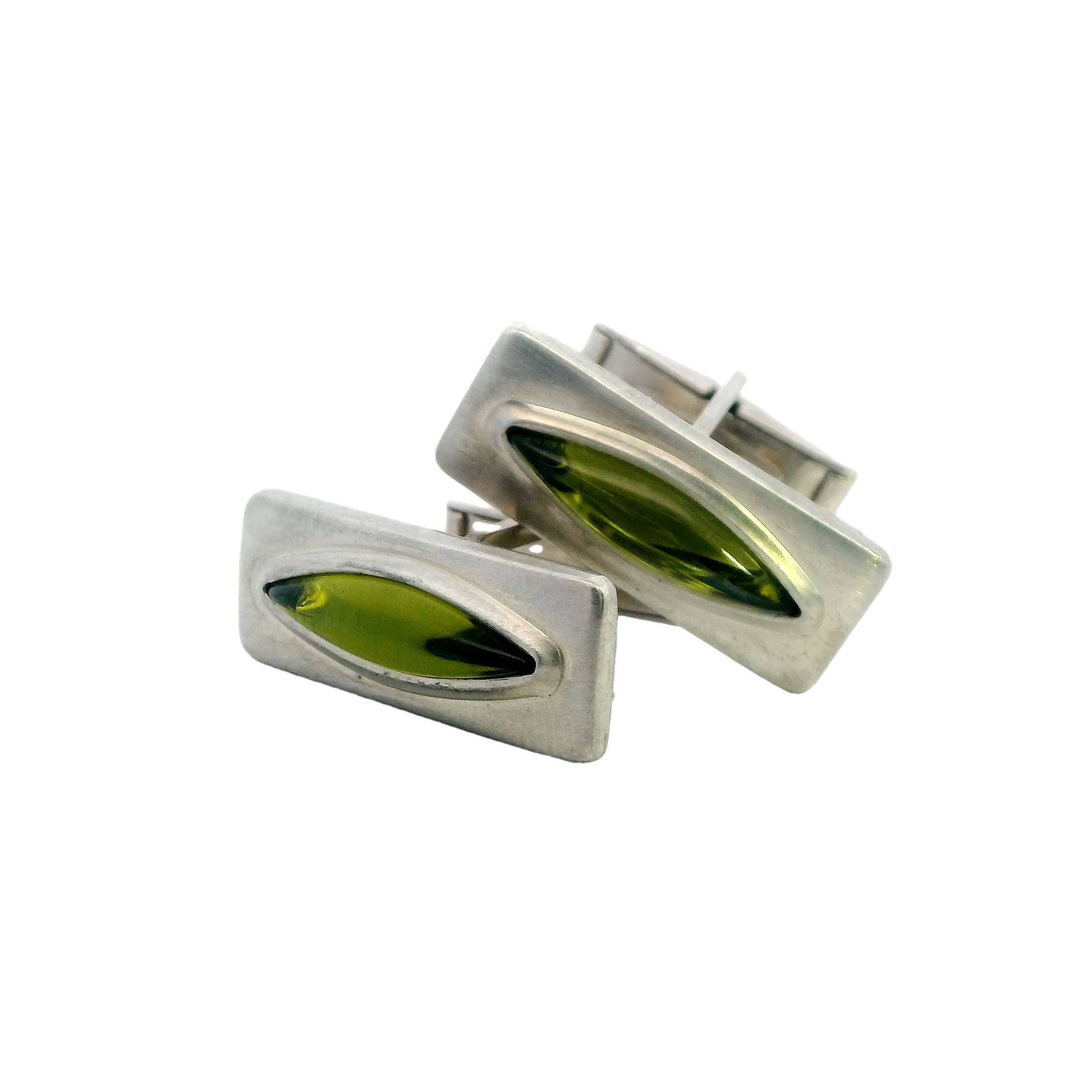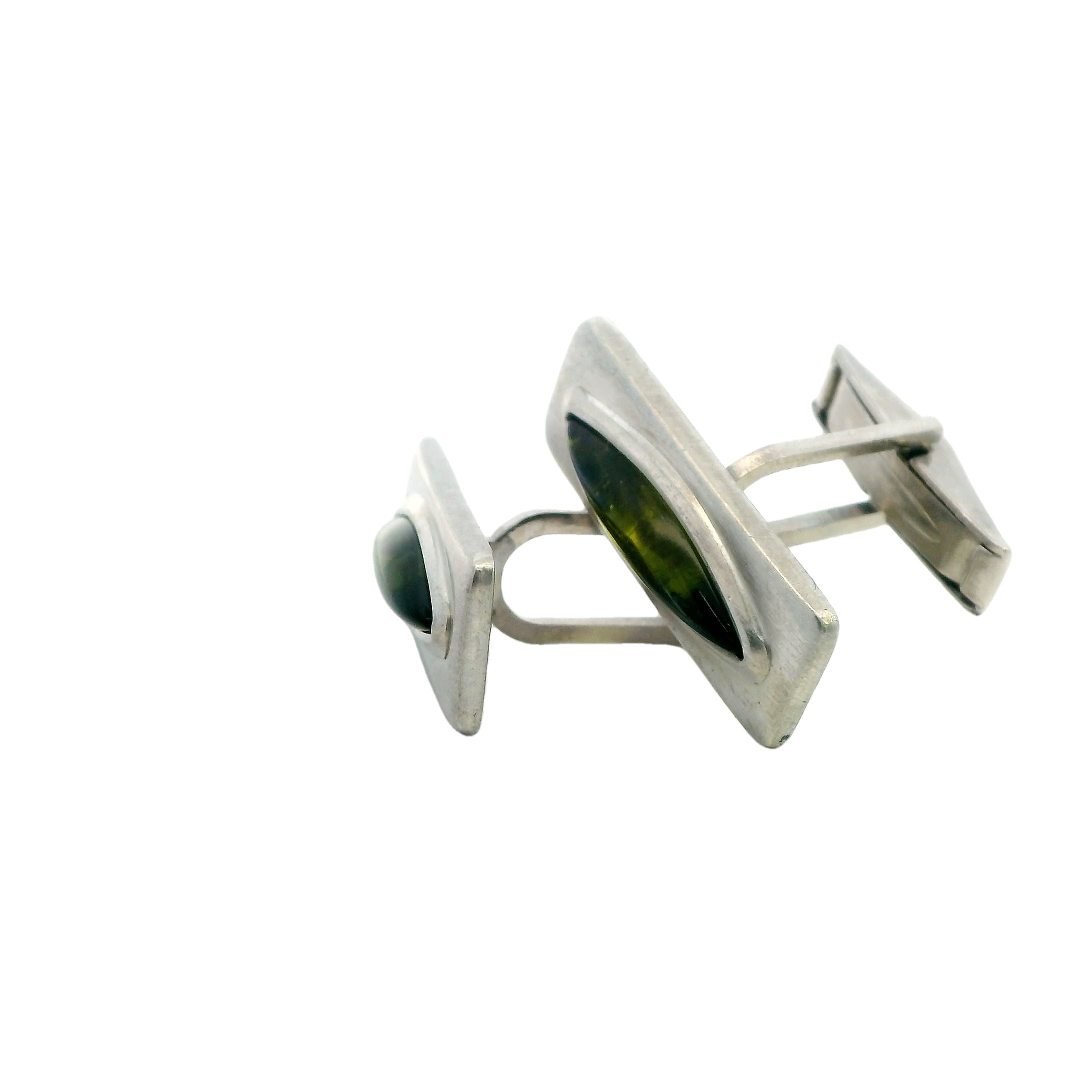 Add a touch of Scandinavian elegance to your collection with these vintage Jorgen Jensen pewter and green glass cufflinks. Crafted in Denmark and marked "Jorgen Jensen Denmark No 230," these cufflinks feature striking oval green glass set in a 2.5cm x 1.1cm rectangular pewter frame. The total weight of the pair is 11.33 grams, highlighting their substantial yet comfortable feel. E17259