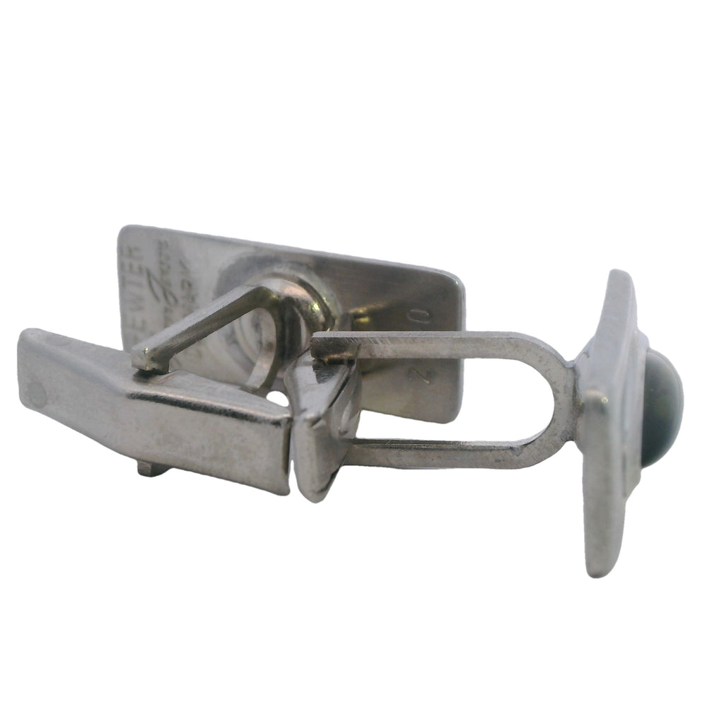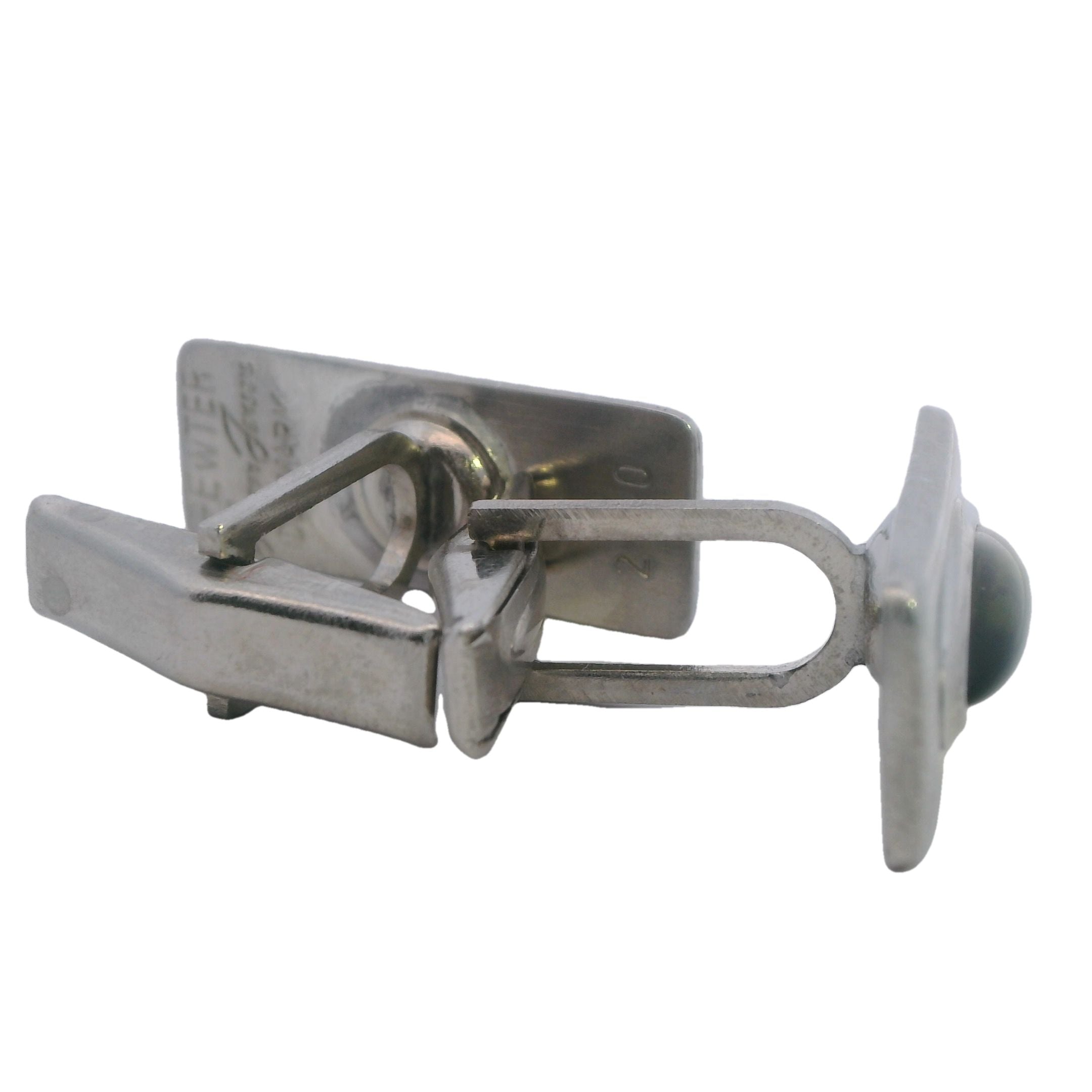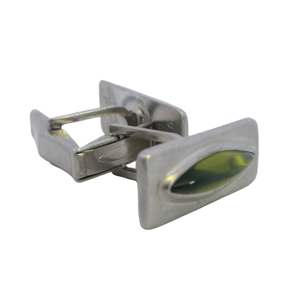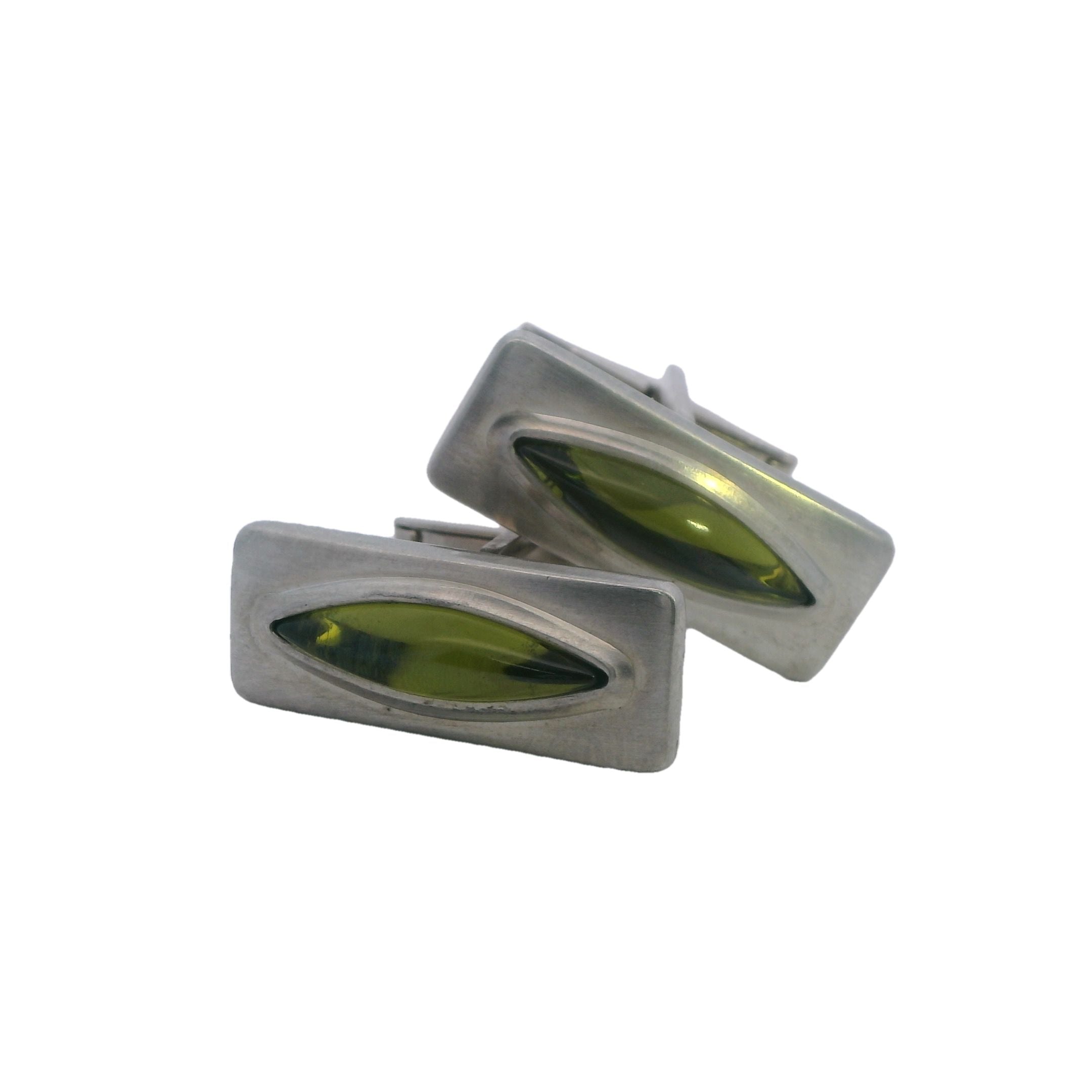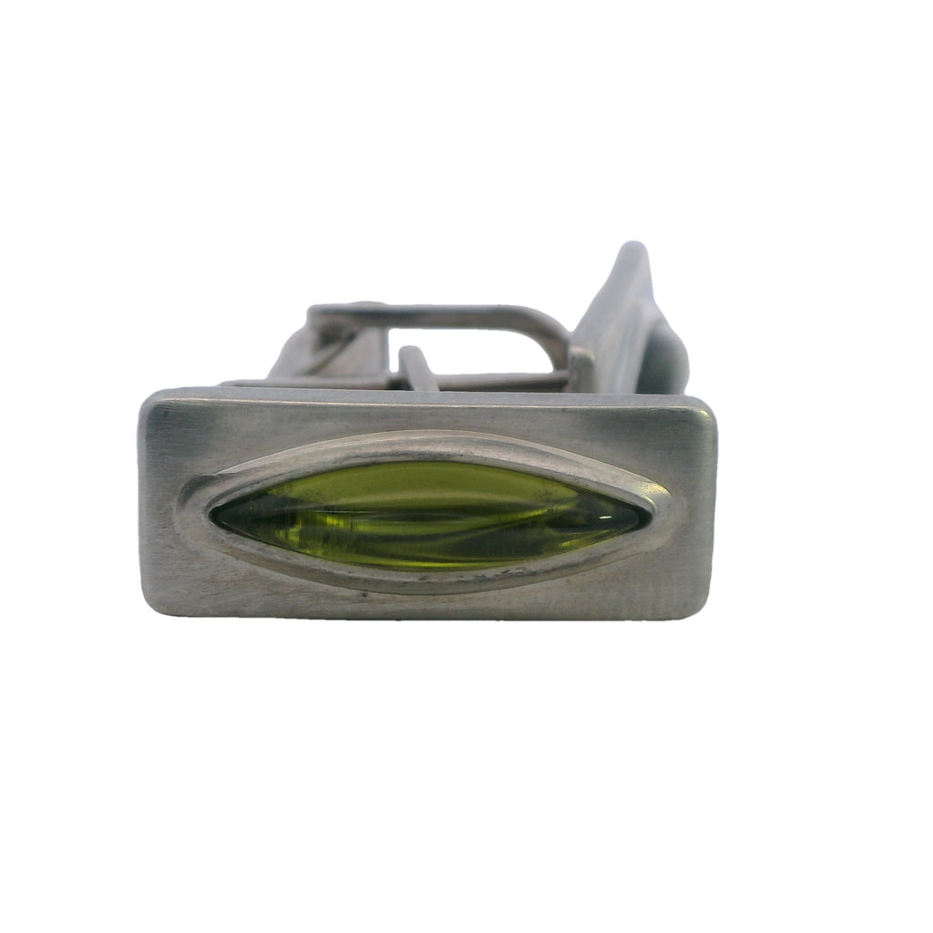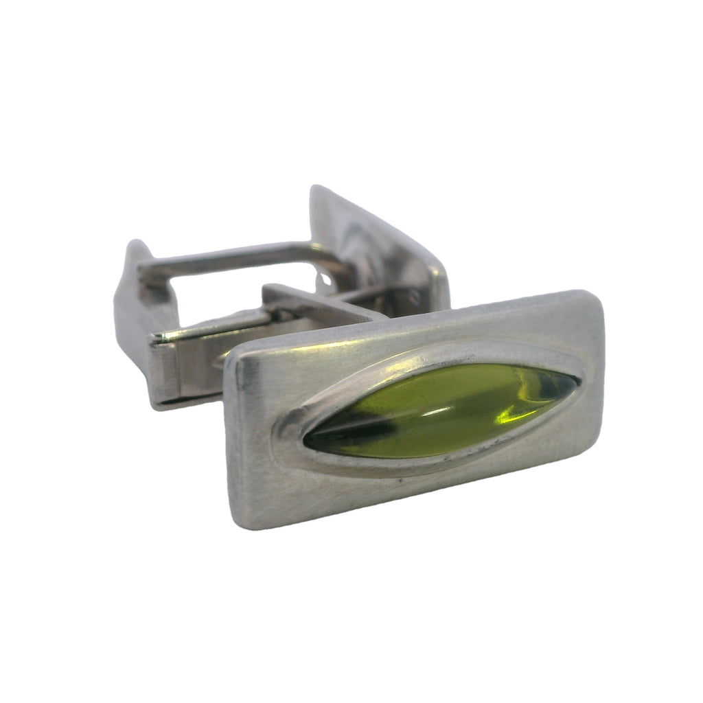 Add a touch of Scandinavian elegance to your collection with these vintage Jorgen Jensen pewter and green glass cufflinks. Crafted in Denmark and marked "Jorgen Jensen Denmark No 230," these cufflinks feature striking oval green glass set in a 2.5cm x 1.1cm rectangular pewter frame. The total weight of the pair is 11.33 grams, highlighting their substantial yet comfortable feel. E17259