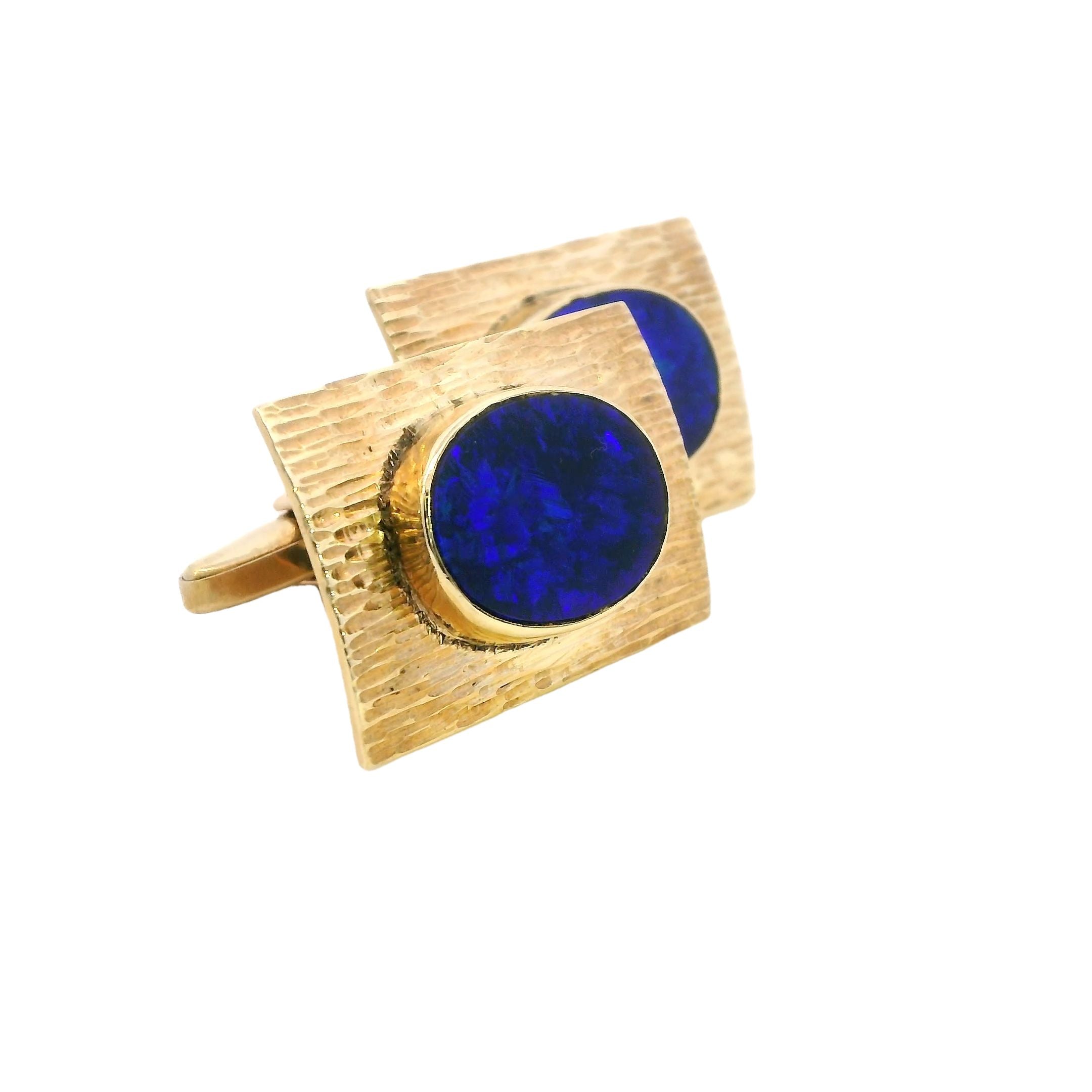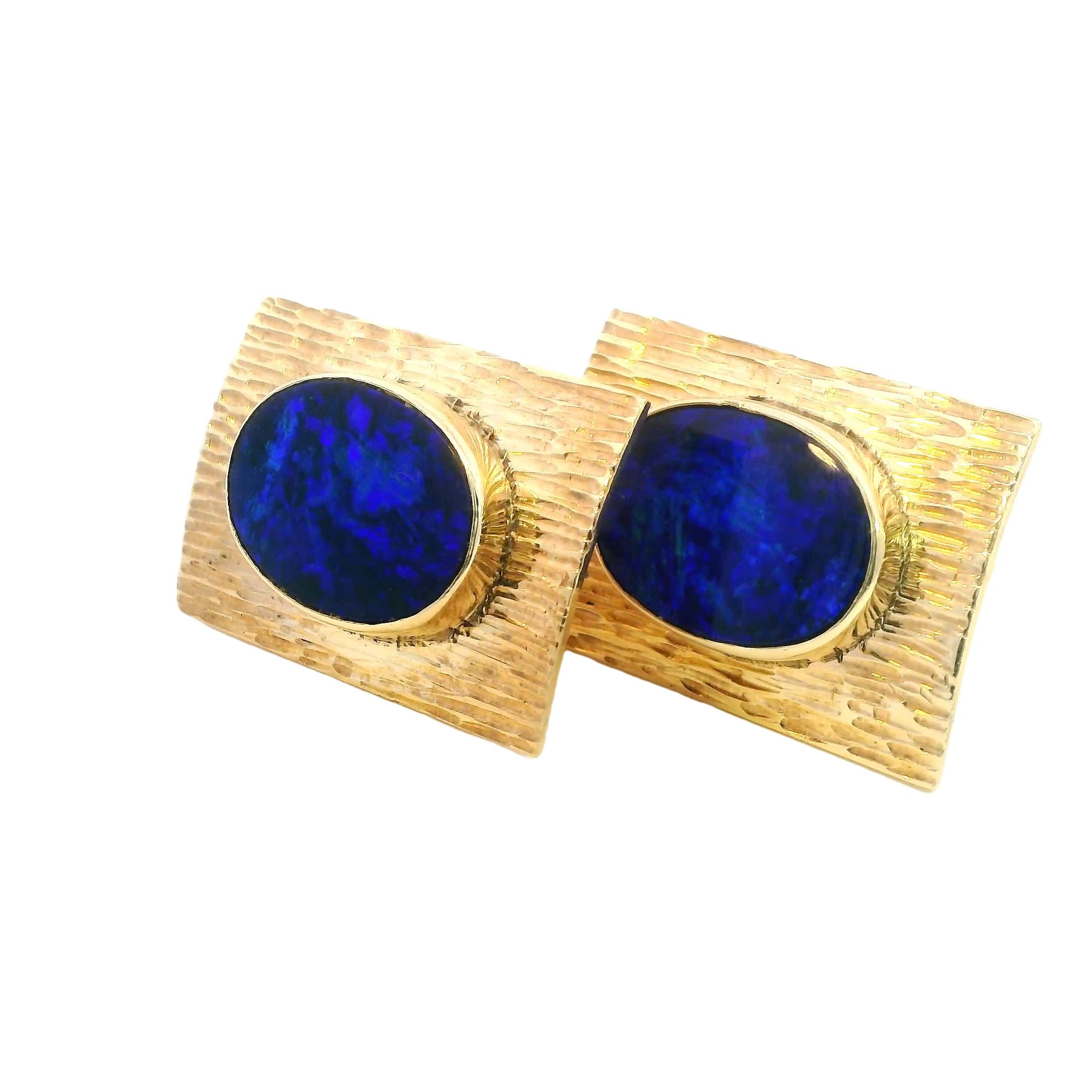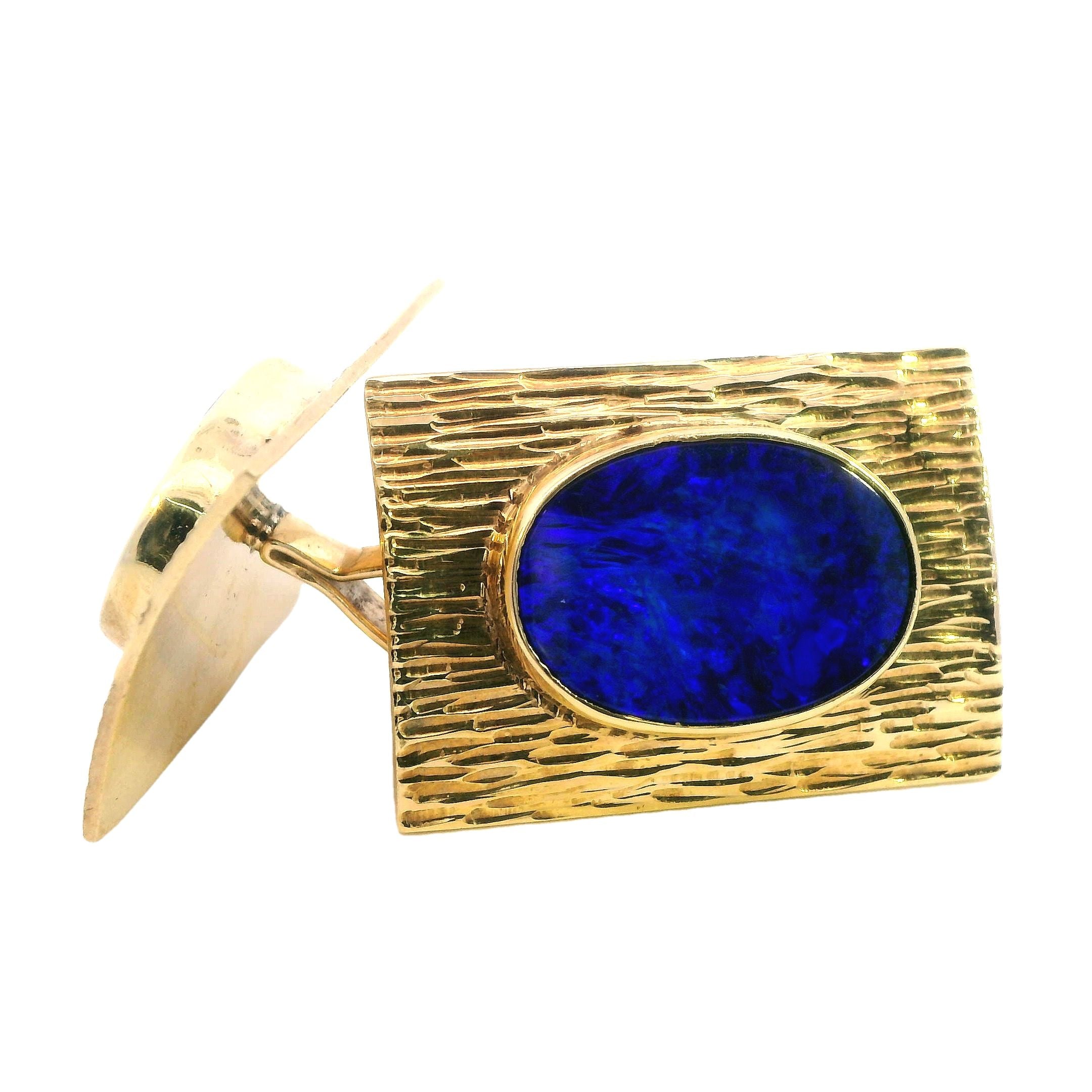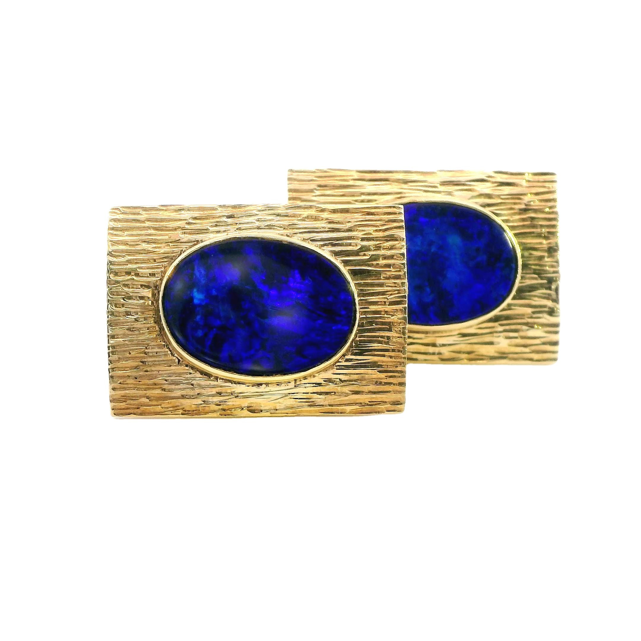 Presenting a remarkable set of 9ct yellow gold opal cufflinks, designed to elevate any formal attire with their sophisticated charm. Each cufflink measures 26.5mm x 18.5mm and boasts a textured finish that beautifully complements the bezel-set 16mm x 12mm blue opal doublets. The opals, with their stunning blue hues, exhibit entrancing play-of-color, shifting between deep blues and lighter tones depending on the light, creating an eye-catching effect that is sure to impress.