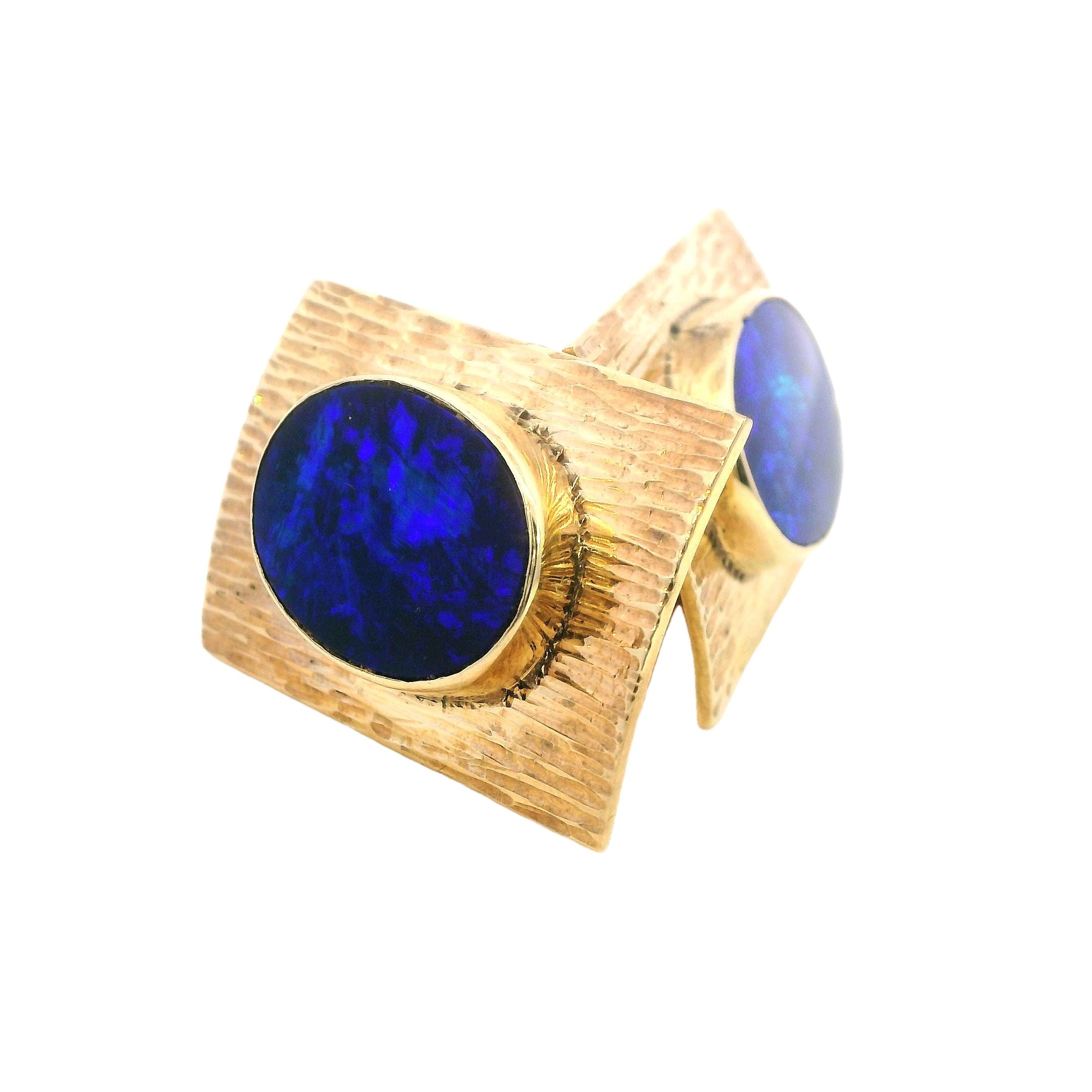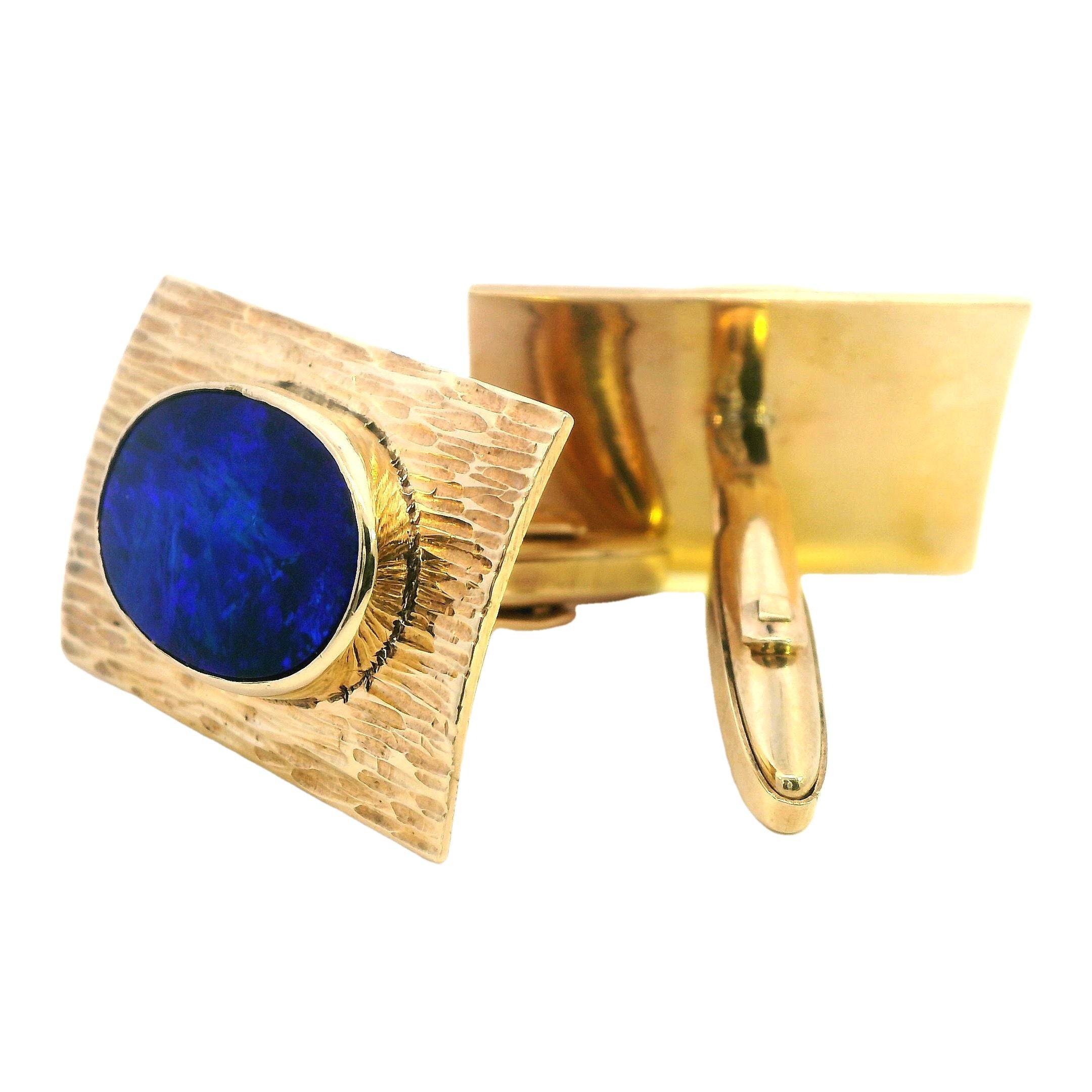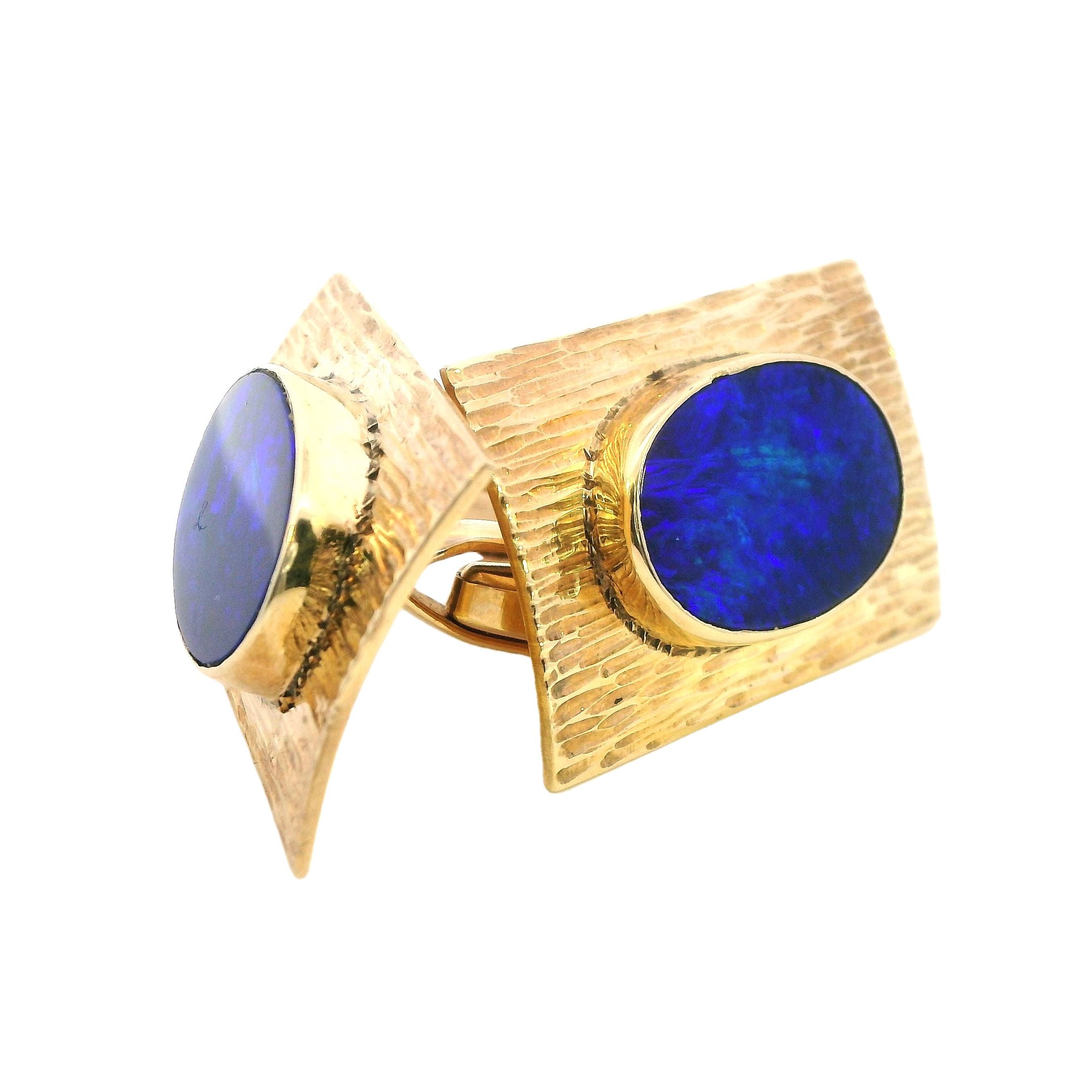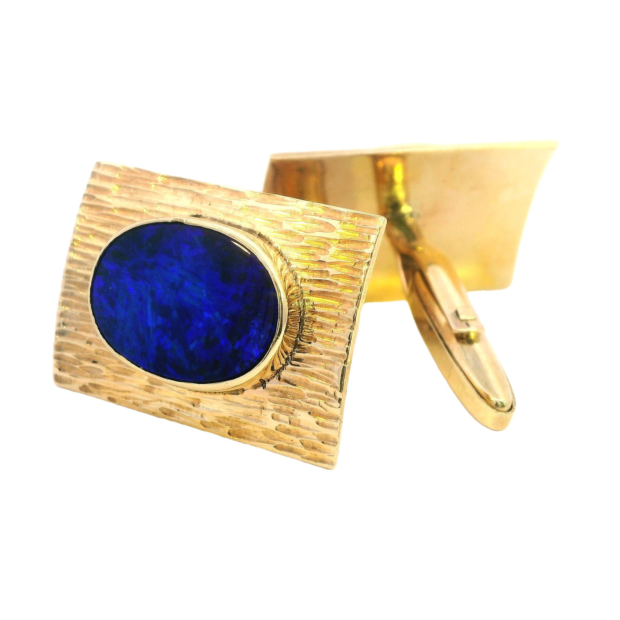 Presenting a remarkable set of 9ct yellow gold opal cufflinks, designed to elevate any formal attire with their sophisticated charm. Each cufflink measures 26.5mm x 18.5mm and boasts a textured finish that beautifully complements the bezel-set 16mm x 12mm blue opal doublets. The opals, with their stunning blue hues, exhibit entrancing play-of-color, shifting between deep blues and lighter tones depending on the light, creating an eye-catching effect that is sure to impress.