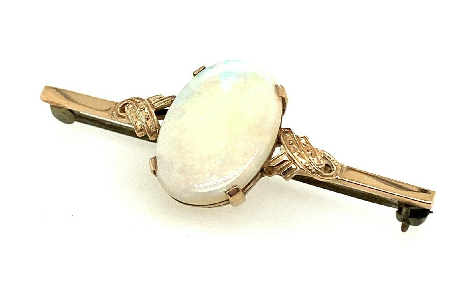 DESCRIPTION: The fantastic colour in this White Opal brooch will delight you with its flashes of red, green and yellow. The style and craftsmanship is superb, it is authentic vintage with a beautiful design enhancing the Opal as a show piece.