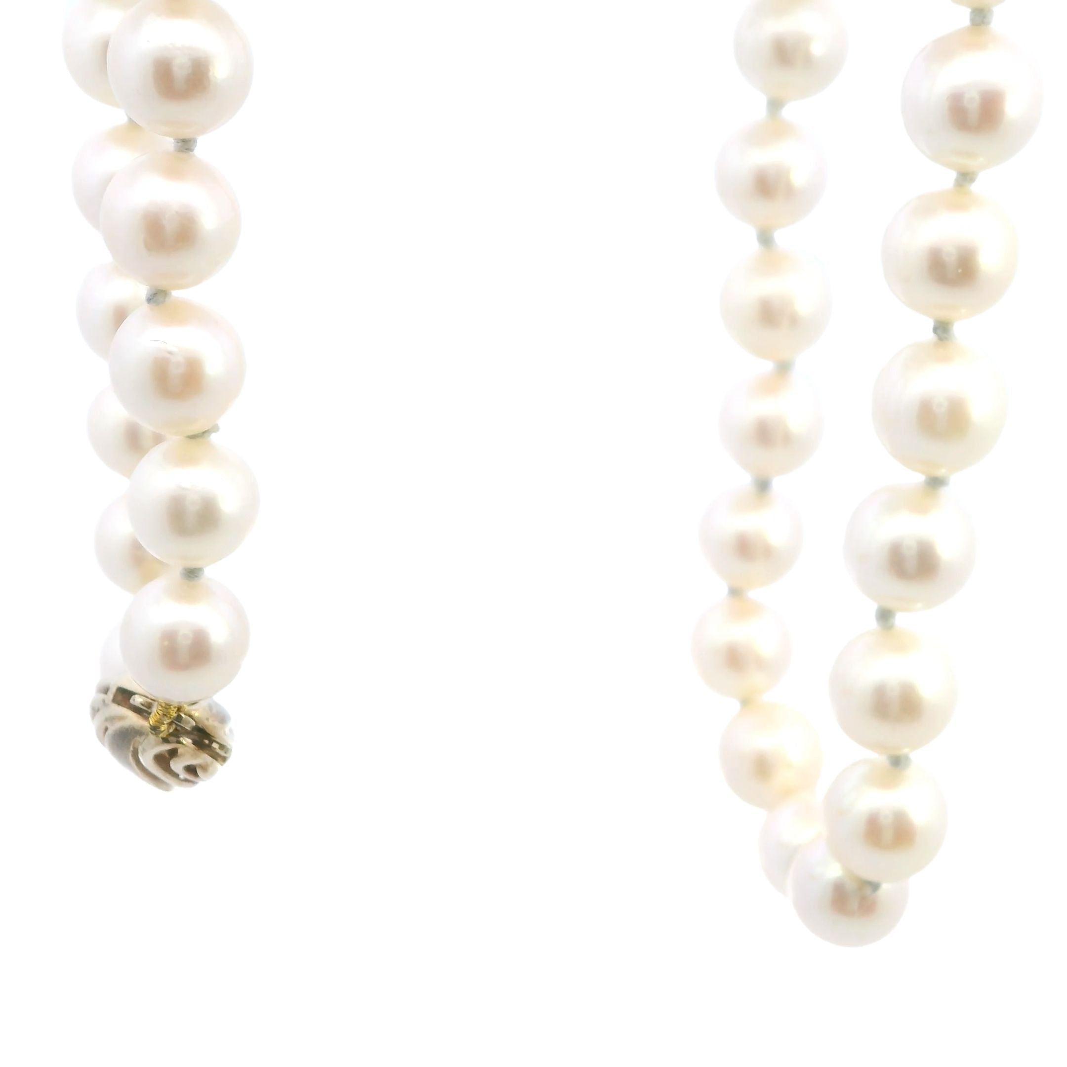 The necklace is finished with a 9ct gold pearl clasp, adding a touch of warmth and sophistication to the cool, radiant glow of the pearls. The clasp is not only a functional element but also an elegant detail that completes this luxurious piece.