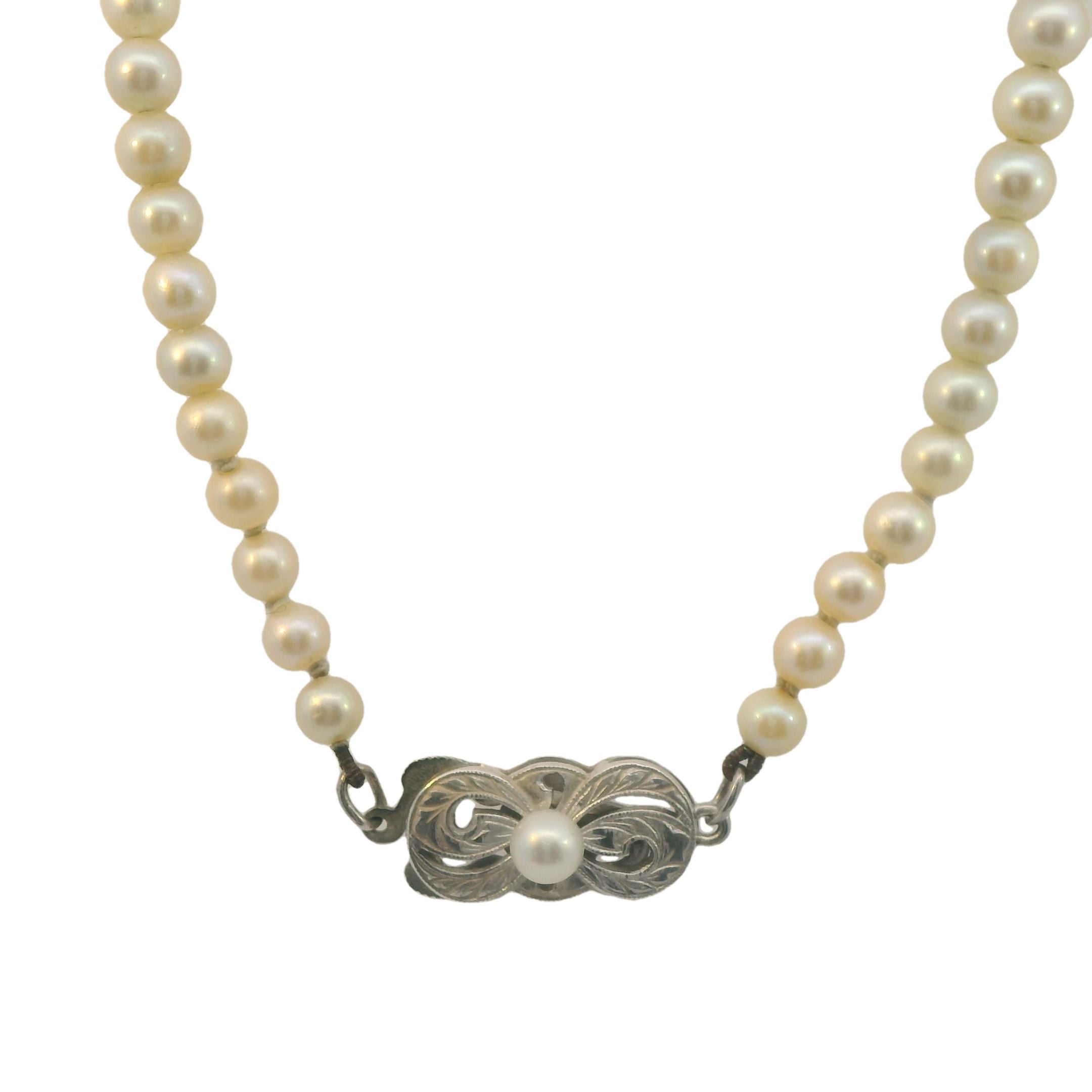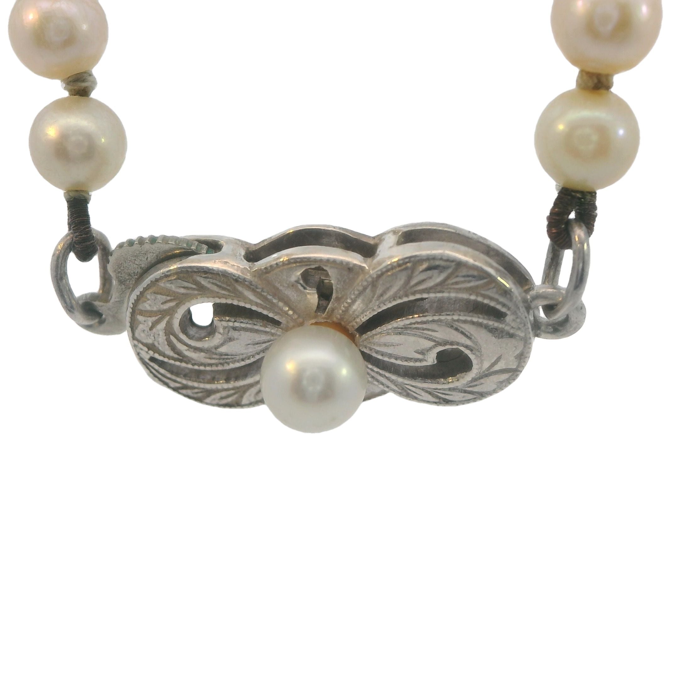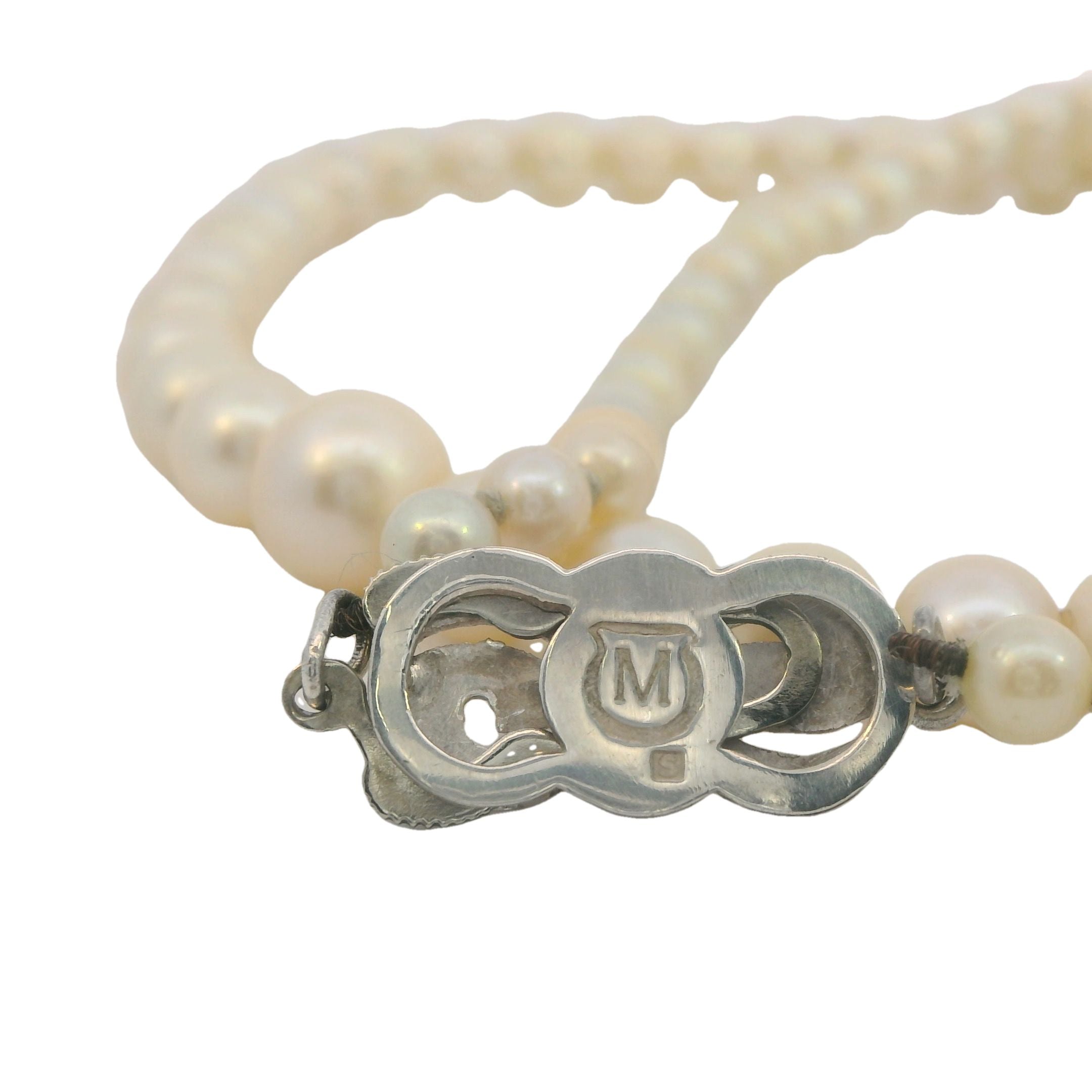 - Clasp: Silver pearl clasp with 3.9mm cultured pearl, hallmarked Mikimoto