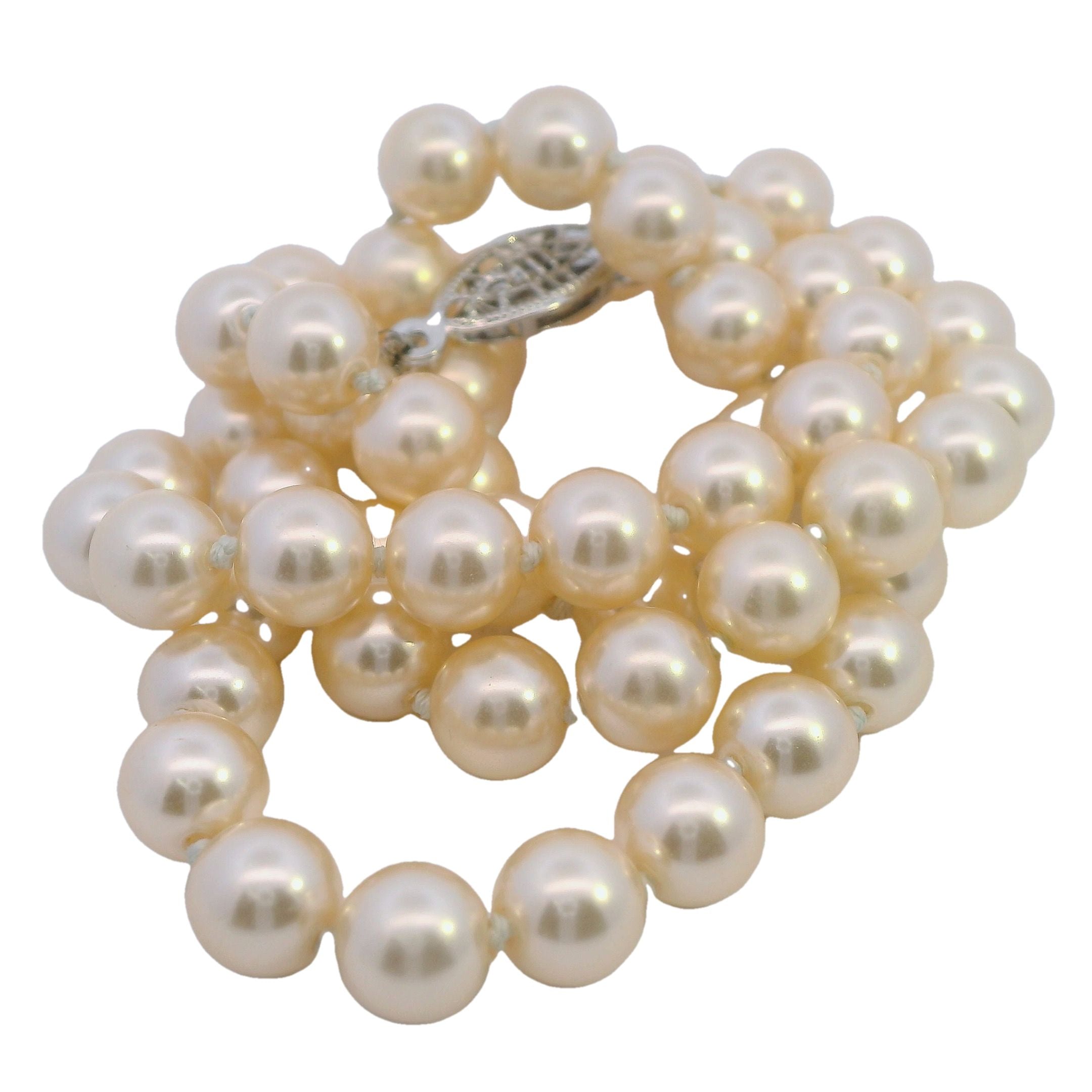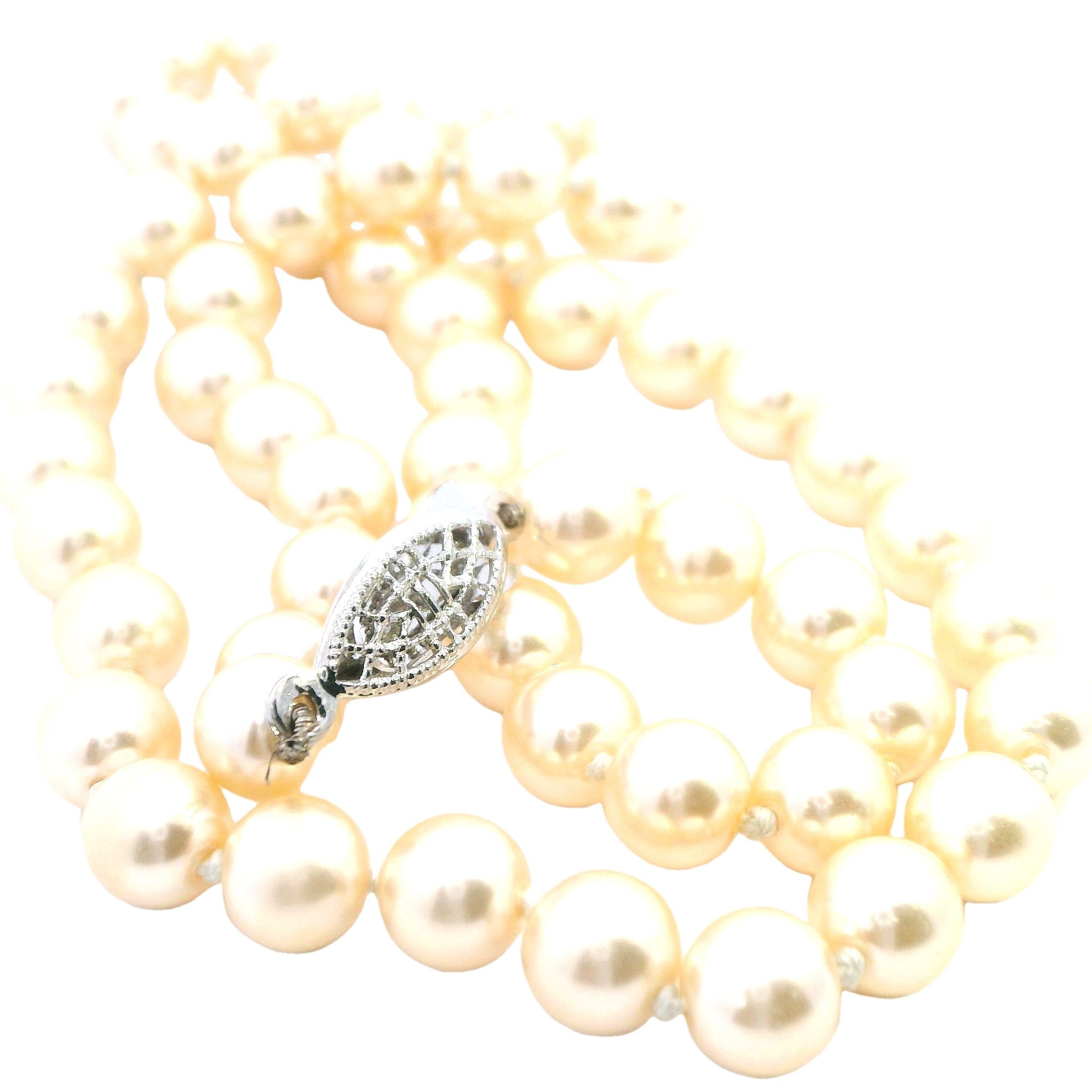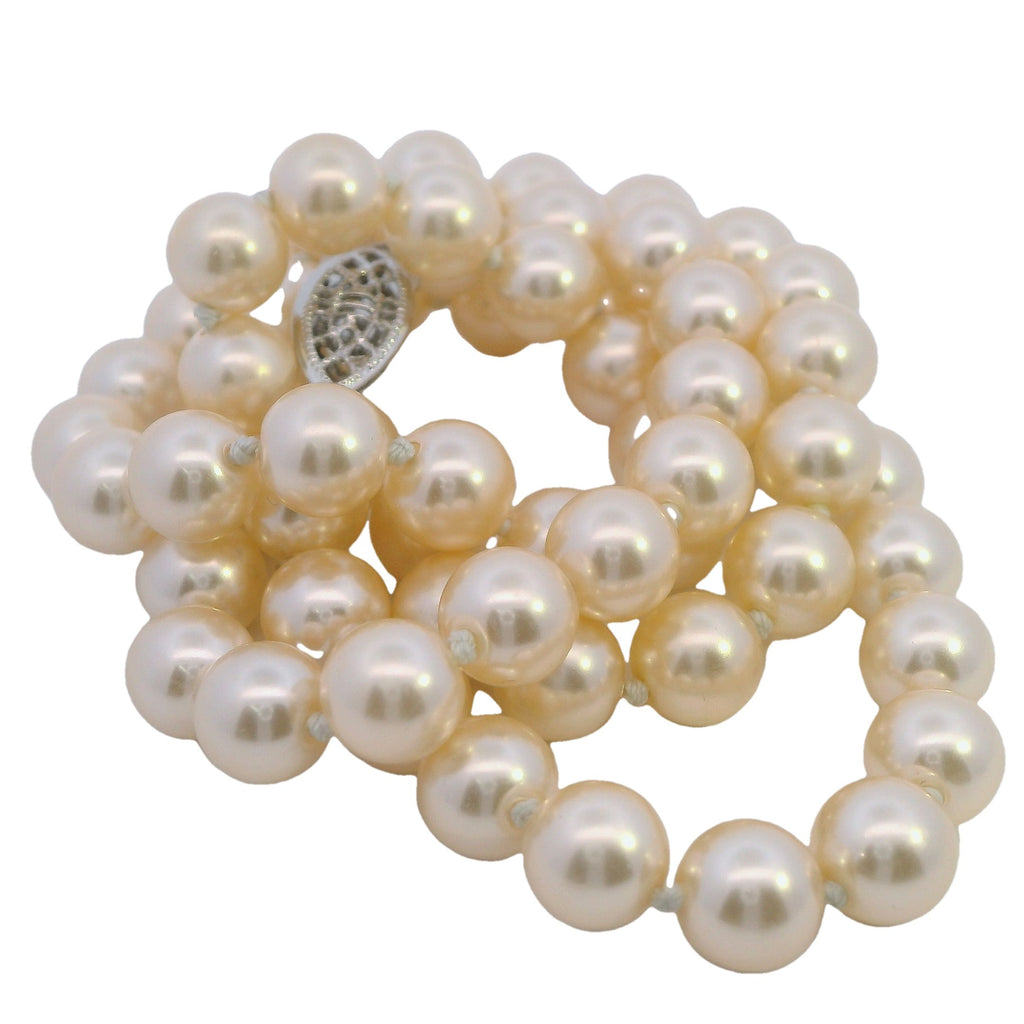 A classic strand of faux pearls with knotted design between each pearl, measuring 49.5cm in length. The pearls are off-white in color, each 1.4cm in diameter, and finished with a white metal clasp.