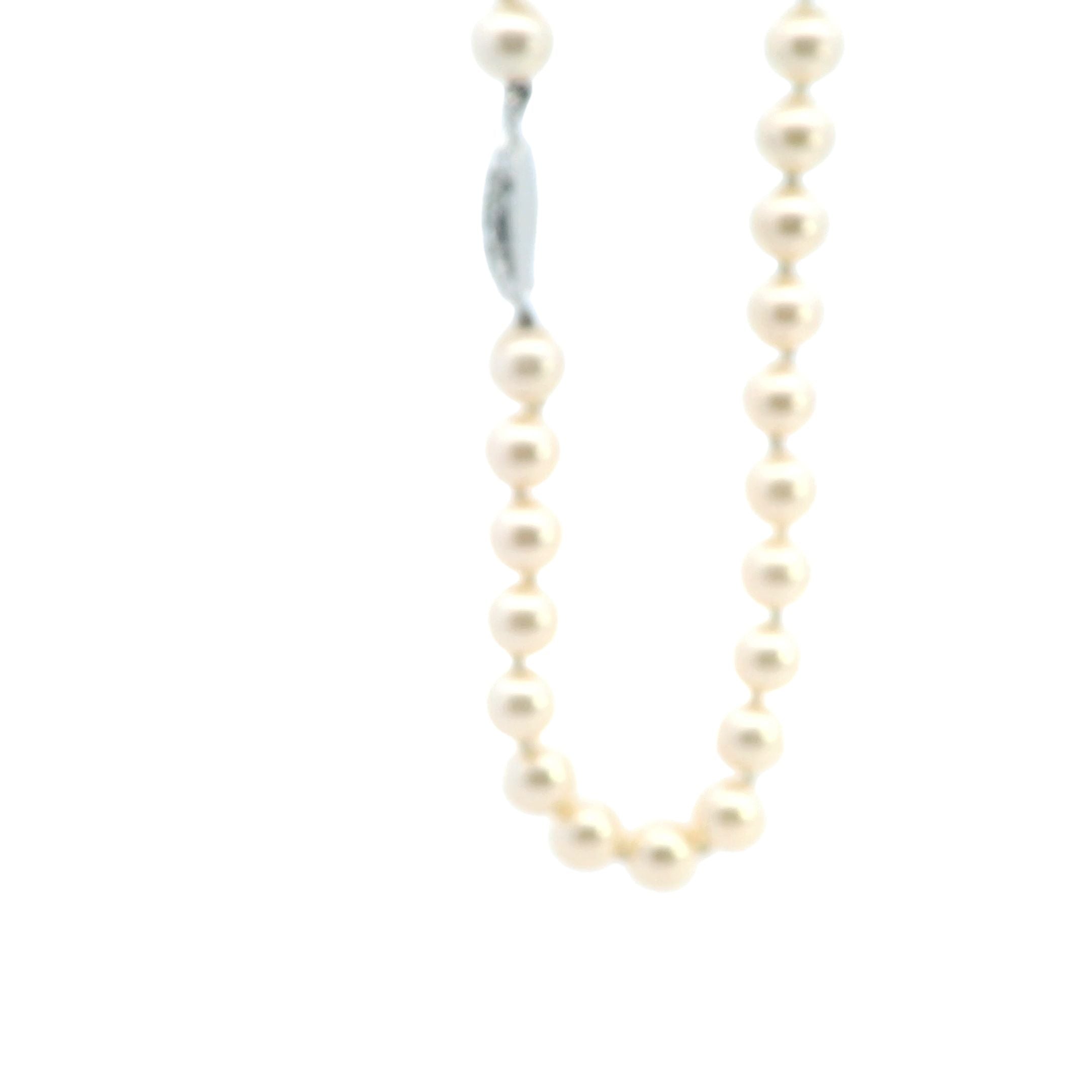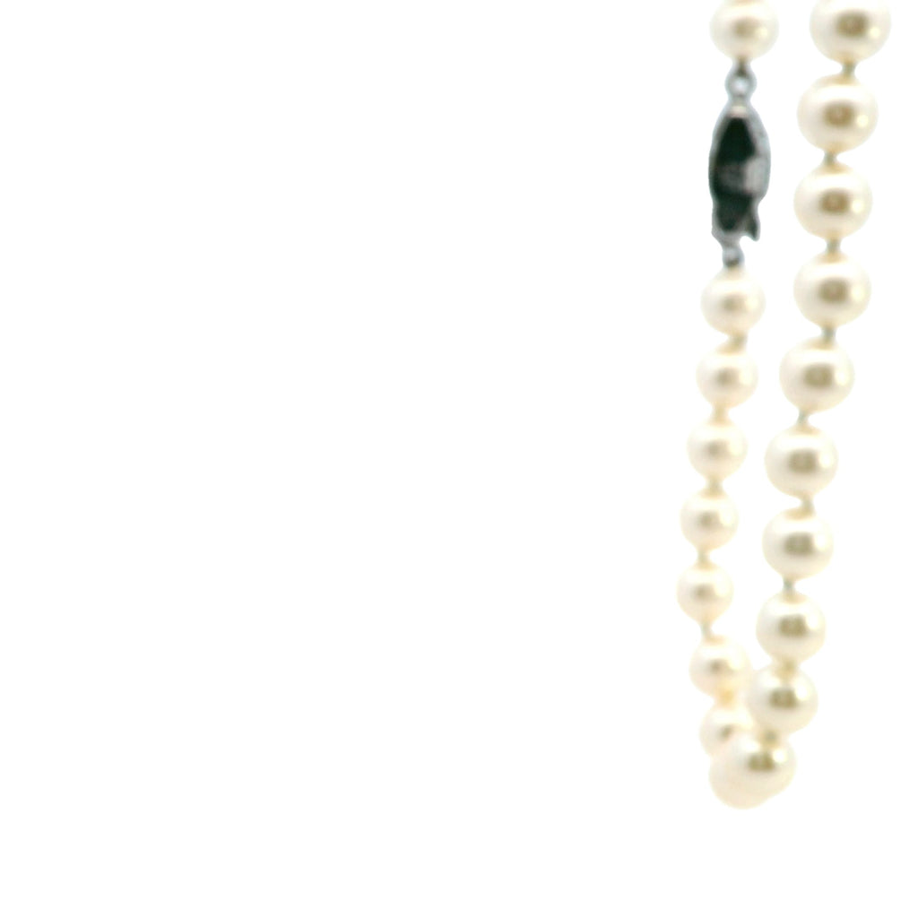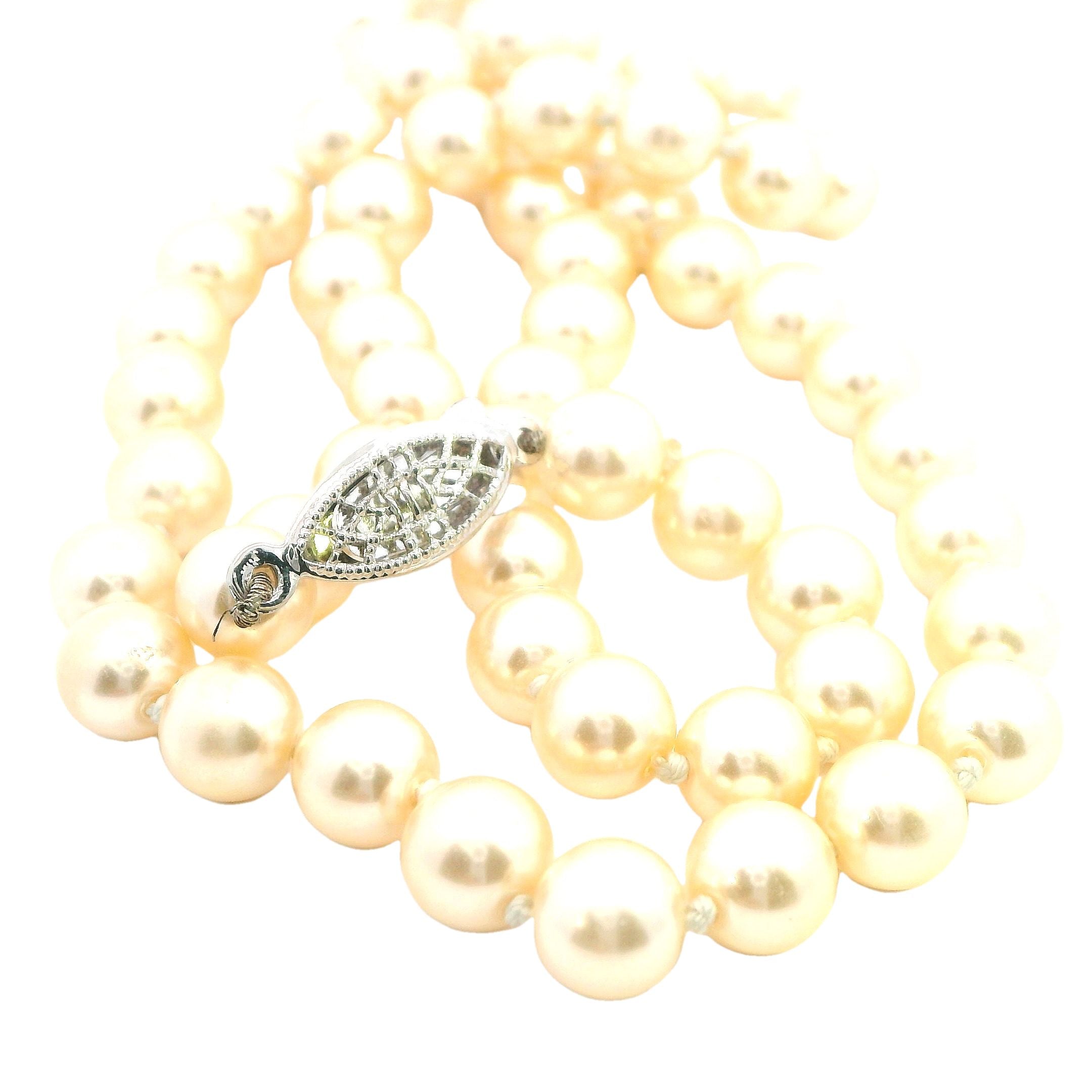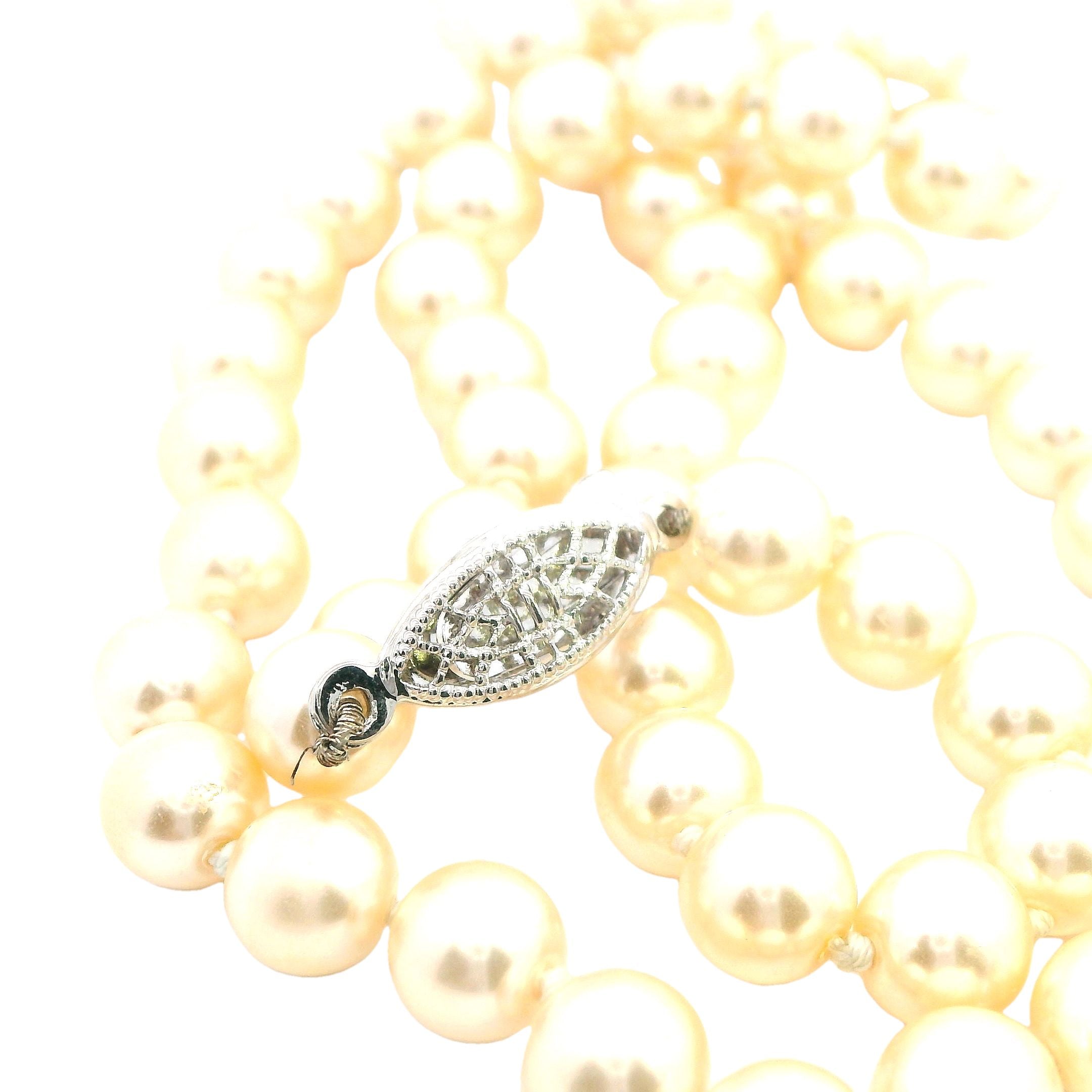A classic strand of faux pearls with knotted design between each pearl, measuring 49.5cm in length. The pearls are off-white in color, each 1.4cm in diameter, and finished with a white metal clasp.