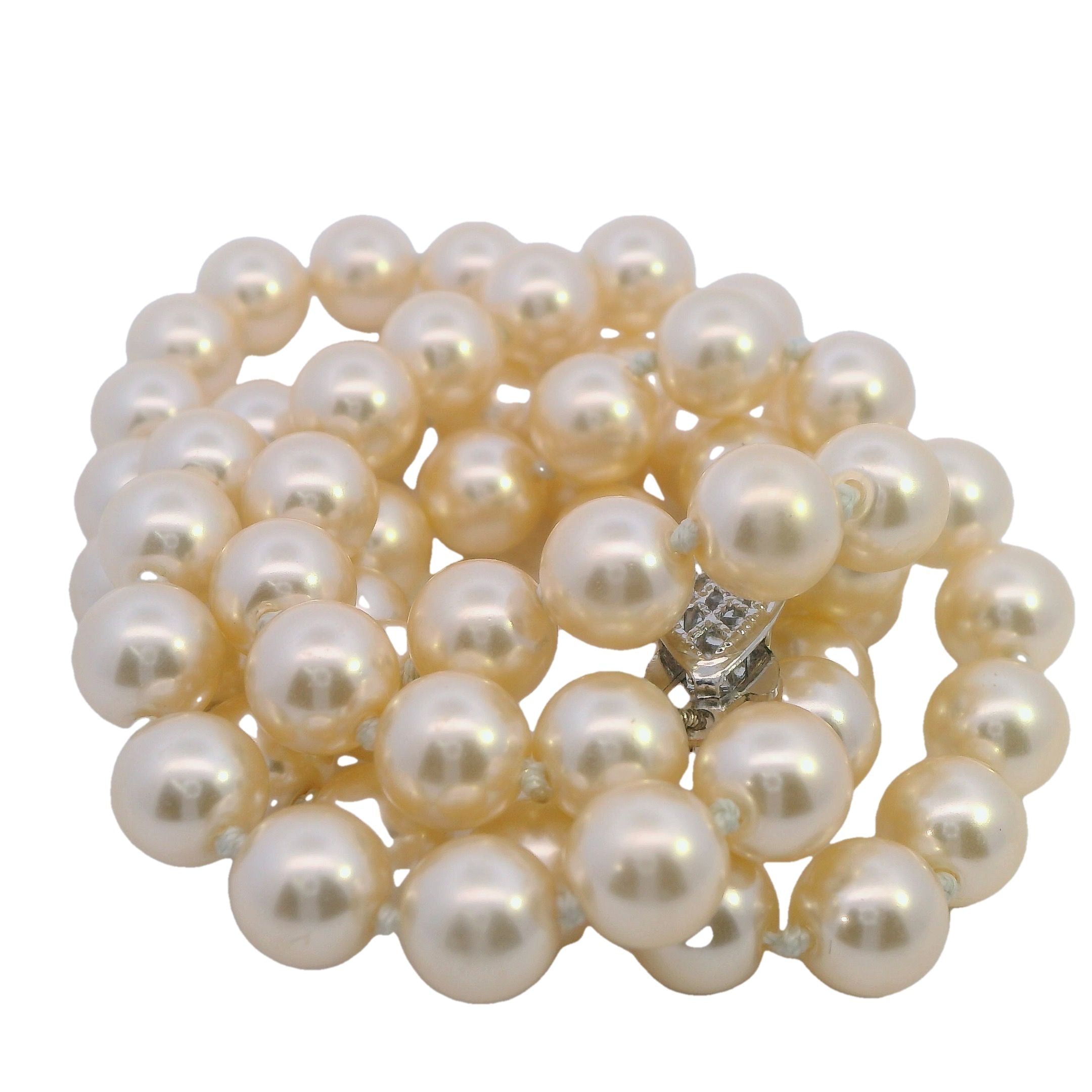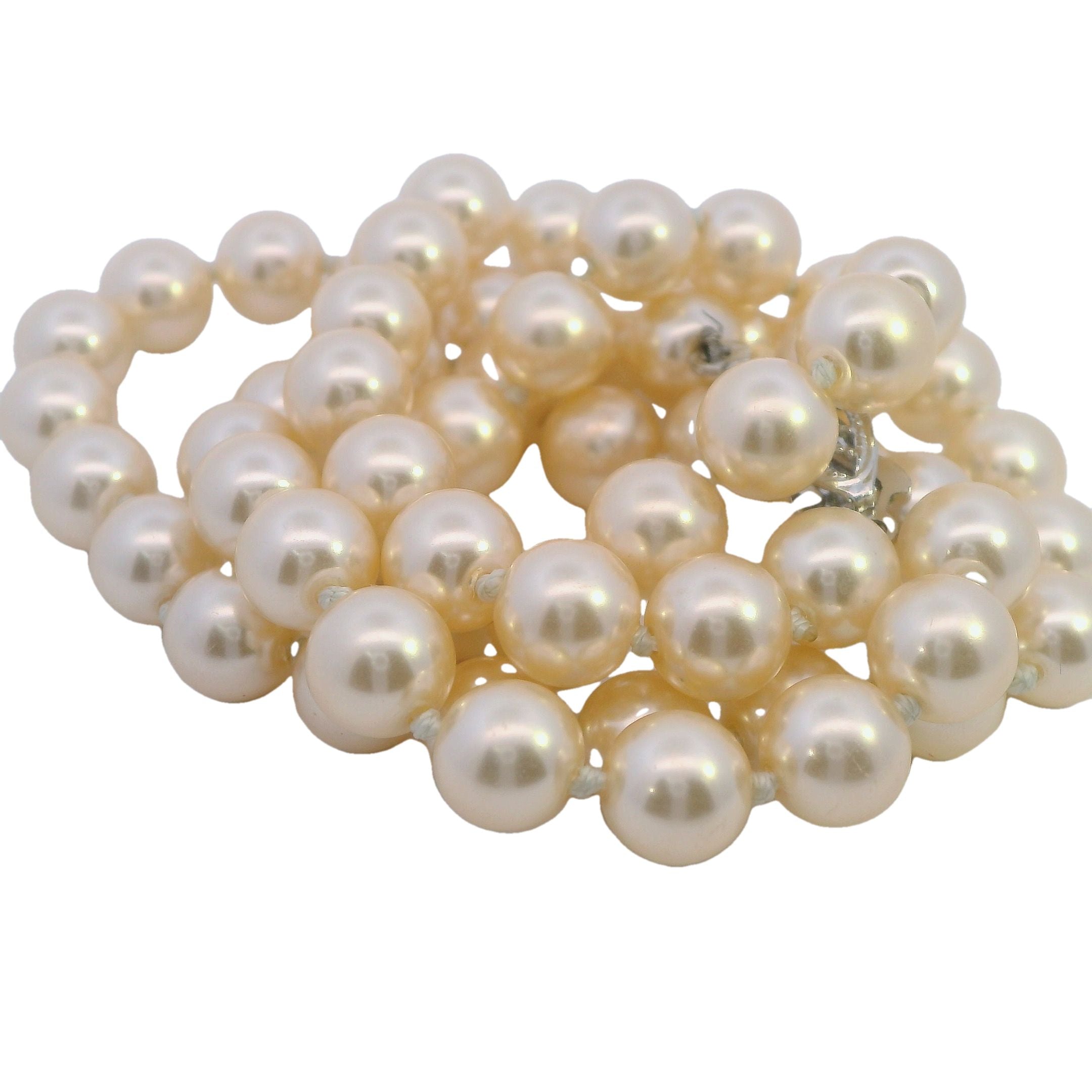 The strand is finished with a secure white metal clasp, ensuring that it stays in place while being worn. This piece is perfect for those who appreciate the look of pearls but prefer a more affordable option. Whether you’re dressing up for a special occasion or adding a touch of elegance to your everyday wear, this faux pearl strand is an excellent choice.