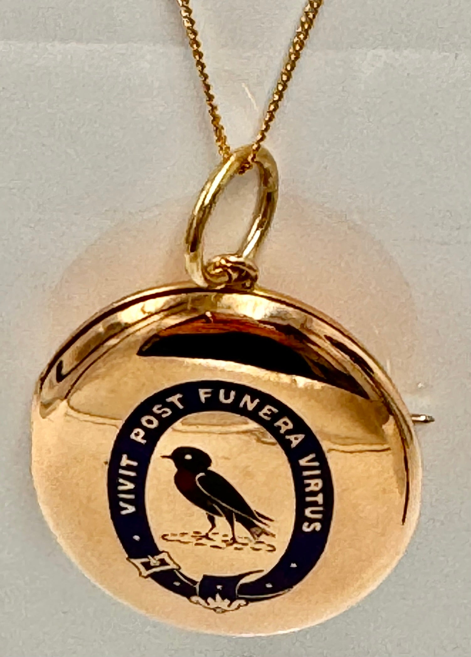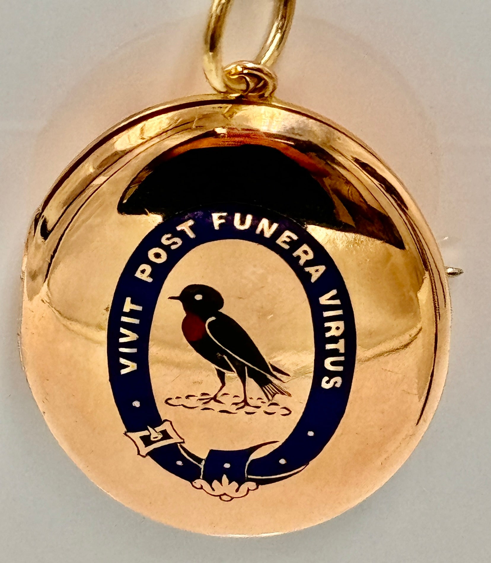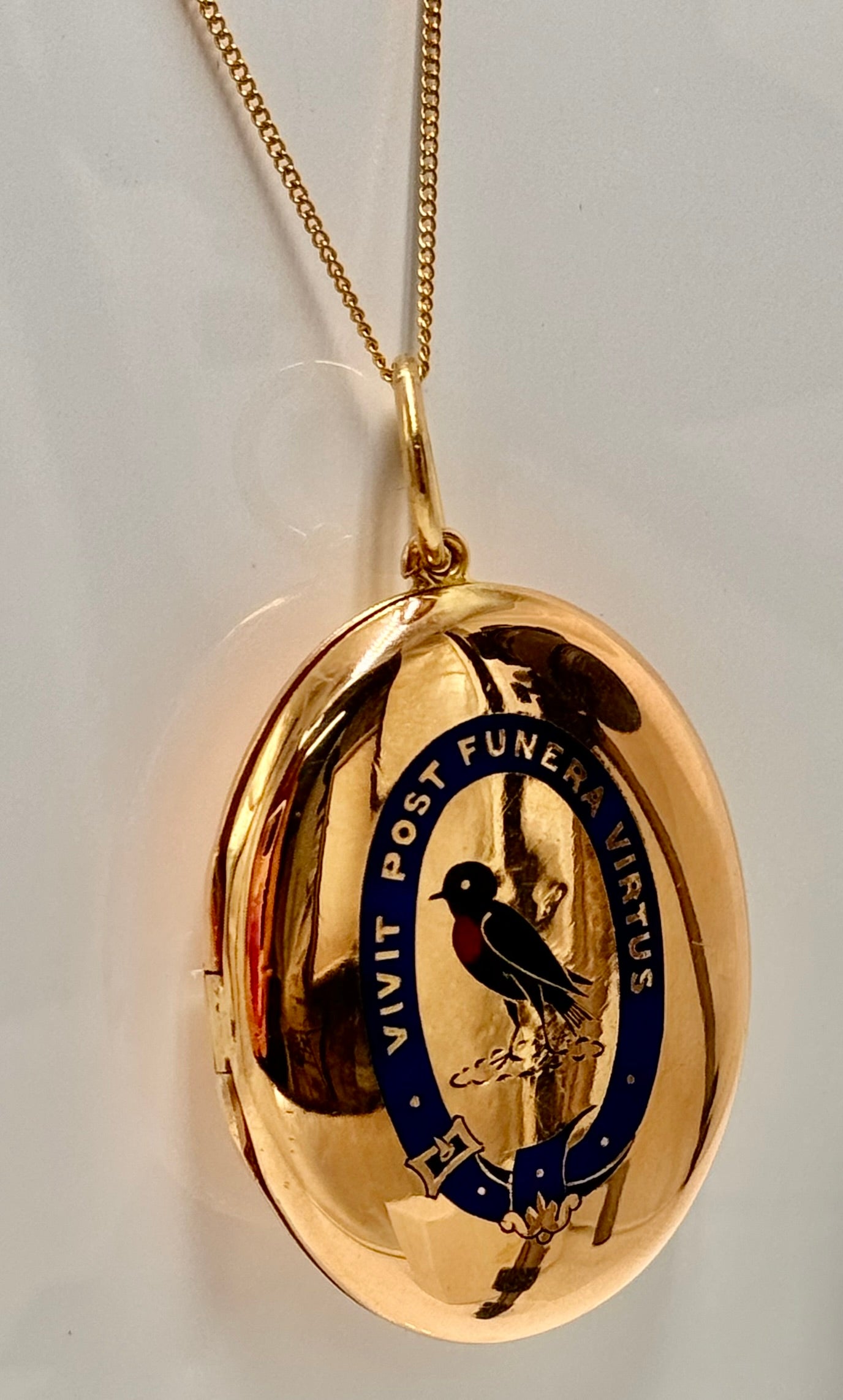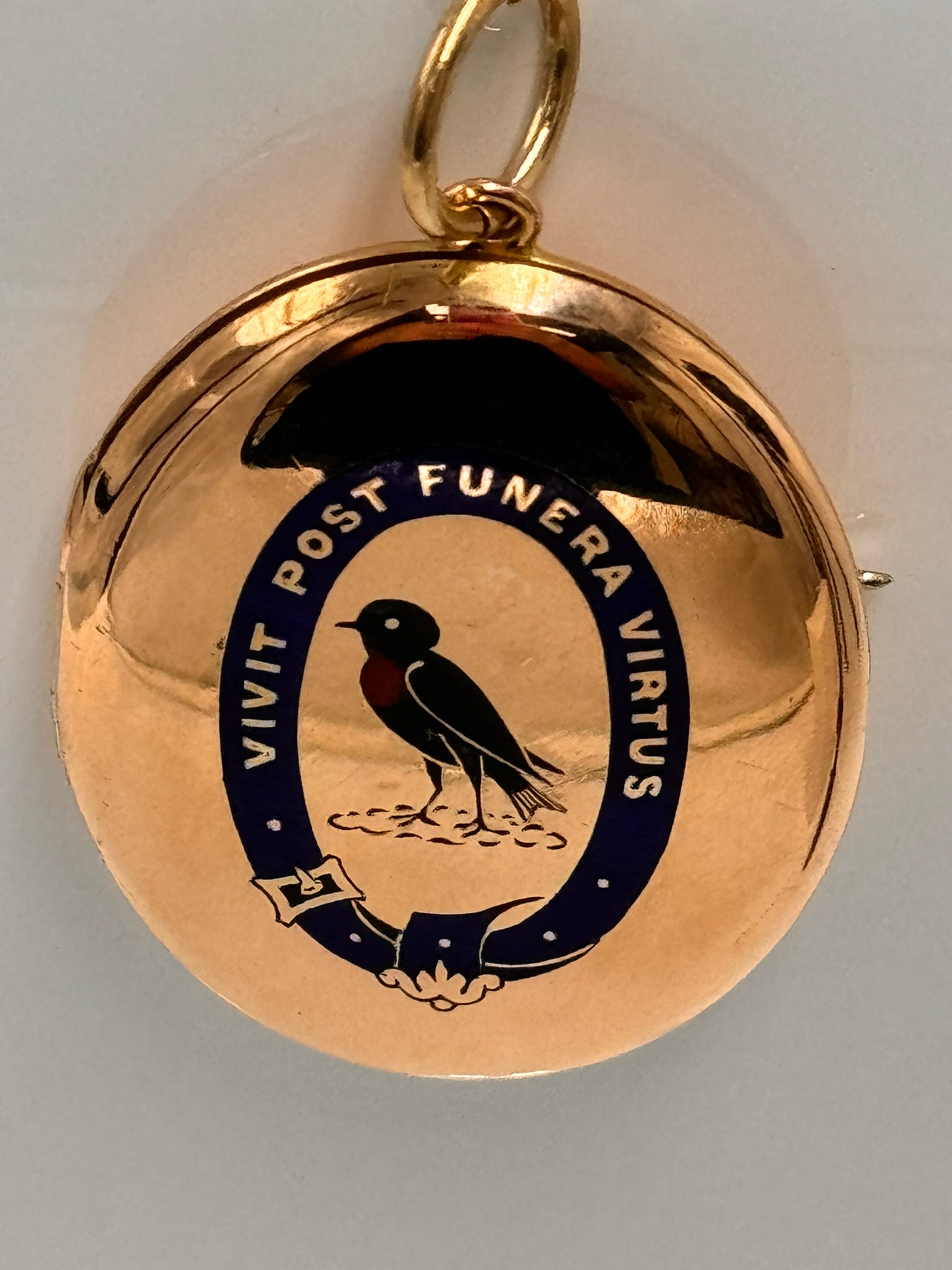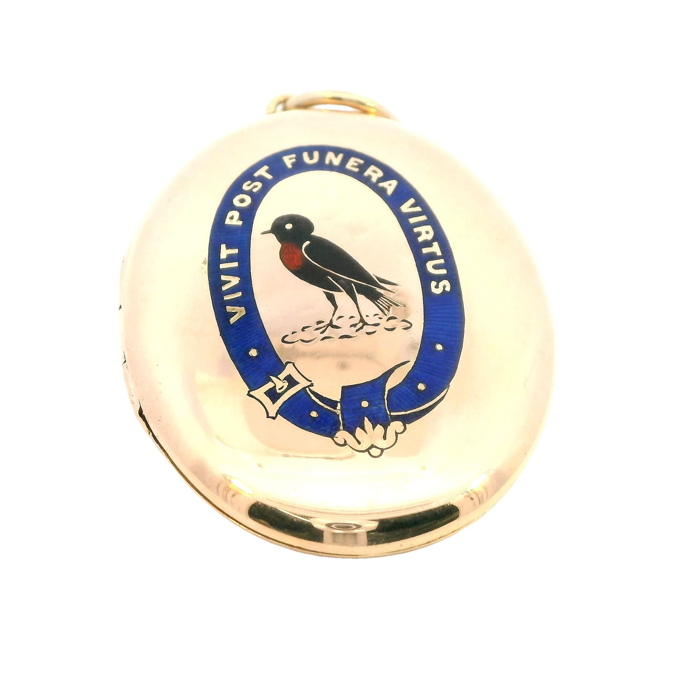 This stunning 18ct yellow gold locket features an exquisite enamelled design on the front, making it a true collector's piece. Measuring 49.2mm x 36.4mm, the locket is inscribed with the Latin motto "Vivit post funera virtus," which translates to "Virtue survives death" or "Virtue outlives death." This elegant message adds a meaningful touch to this beautiful pre-loved piece. The locket can be worn as a brooch or pendant, offering versatility and timeless elegance.