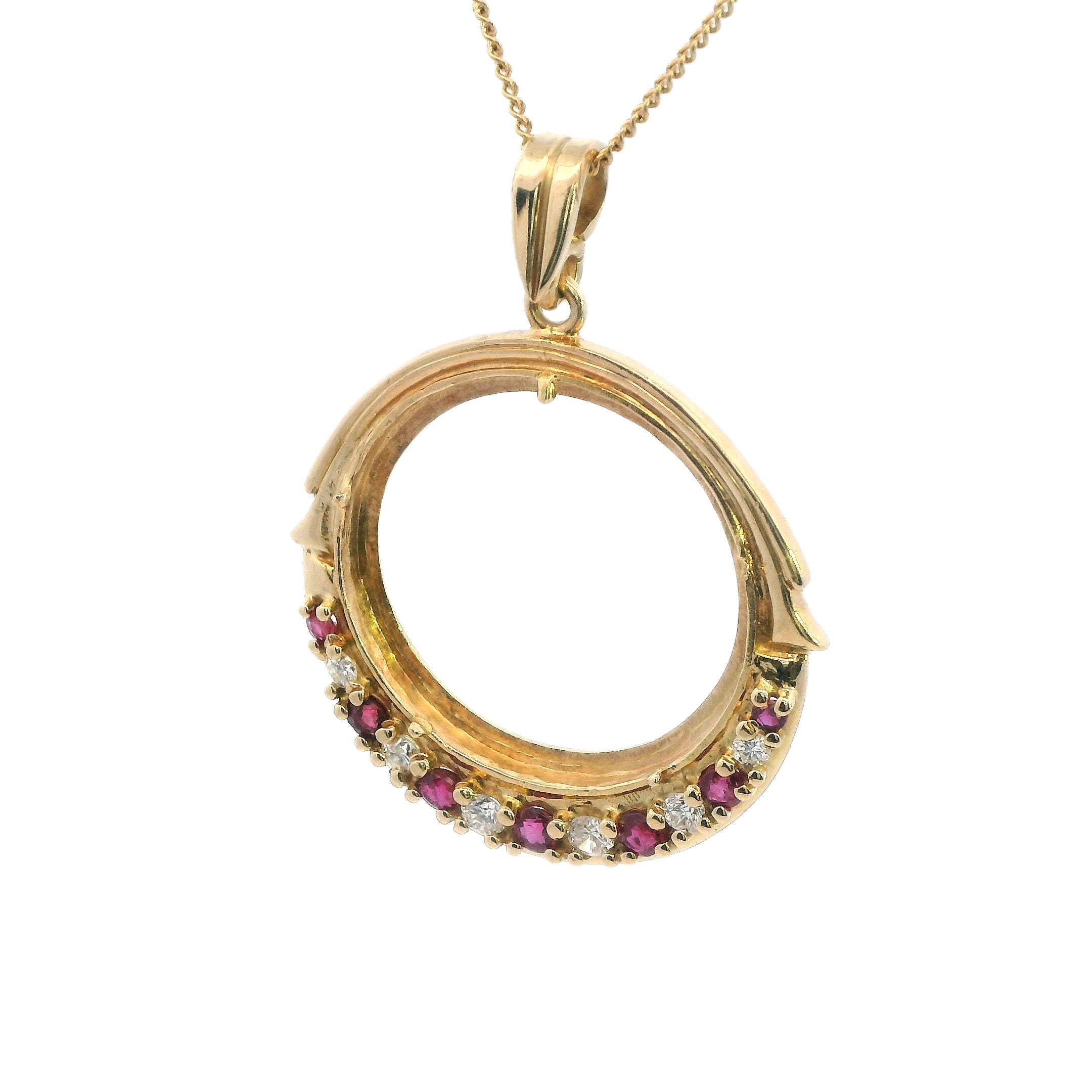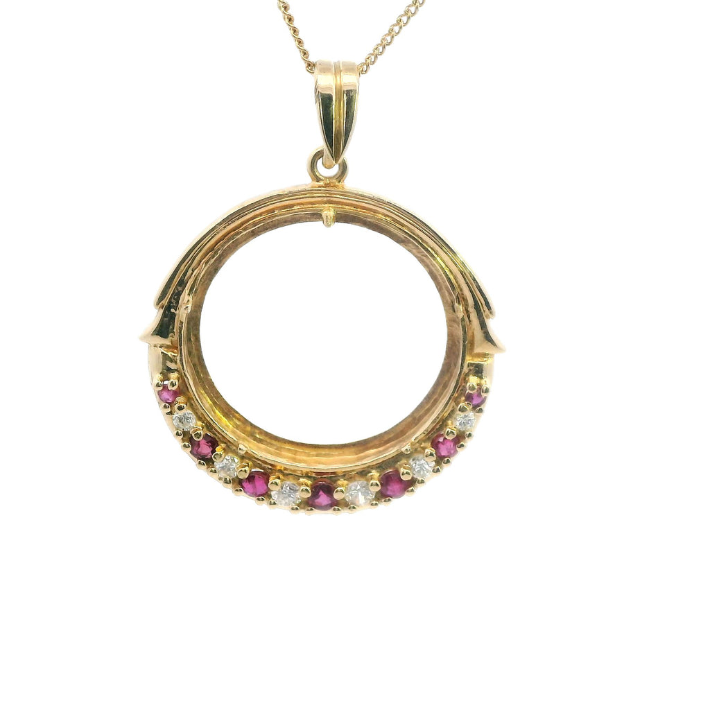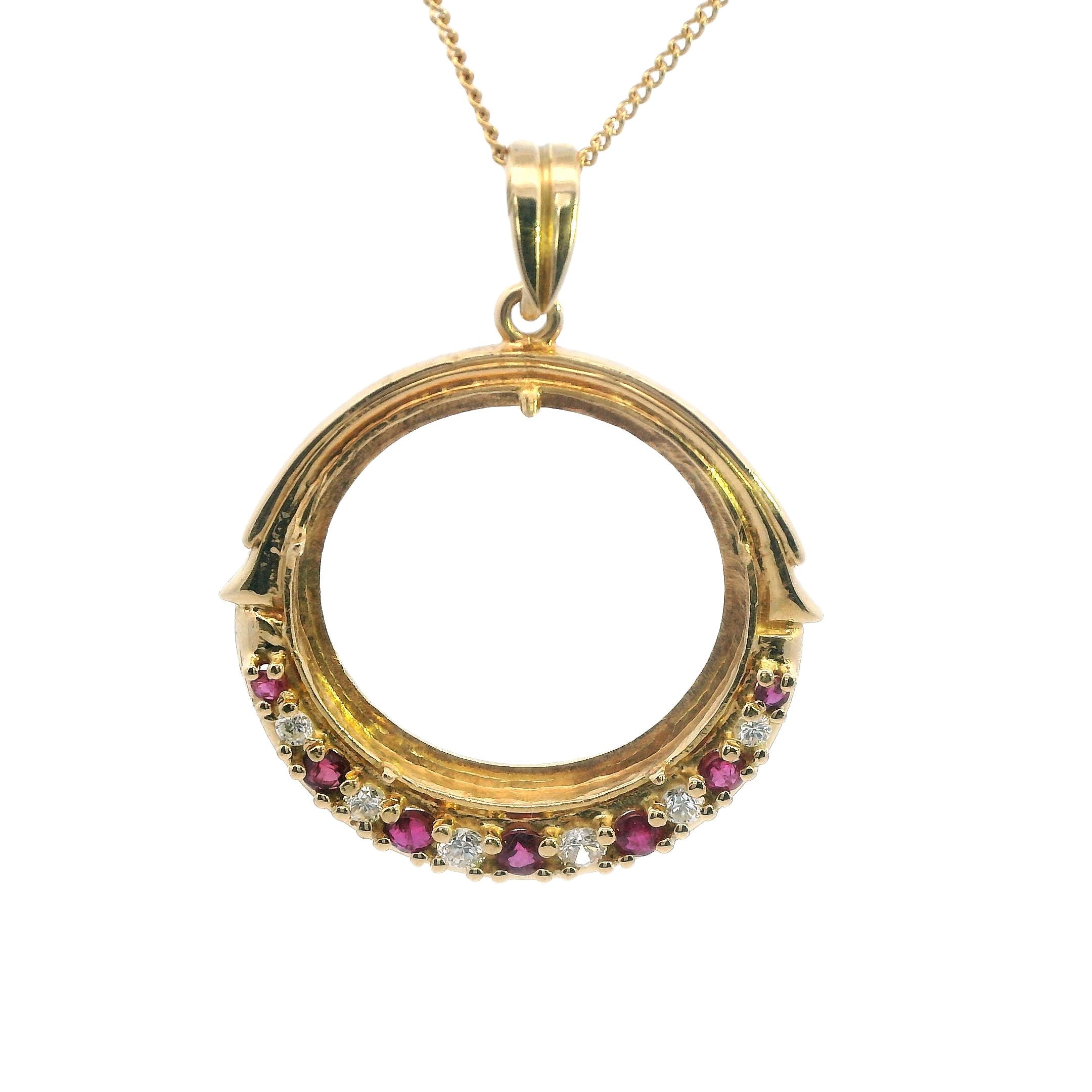 This luxurious 18ct yellow gold pendant features a stunning combination of diamonds and rubies, designed to hold a coin at its center. With its intricate setting and vibrant gemstones, this pendant is a true masterpiece, perfect for adding a touch of sophistication and elegance to any collection.