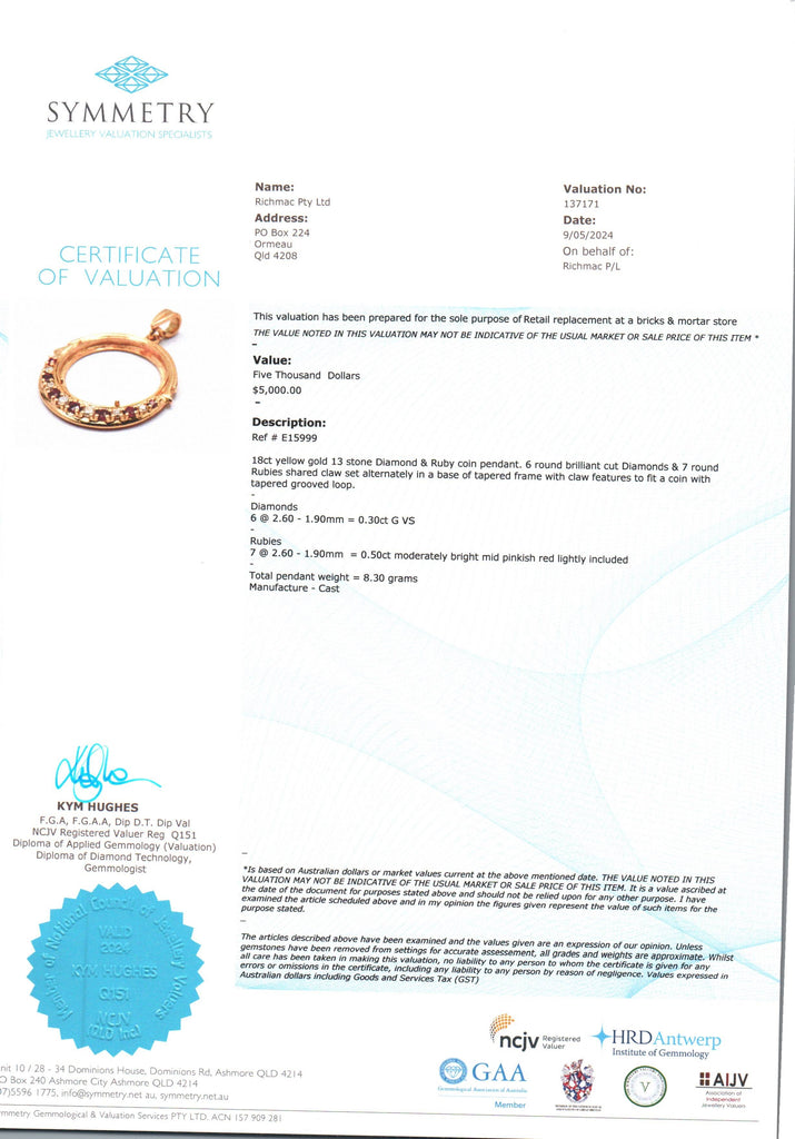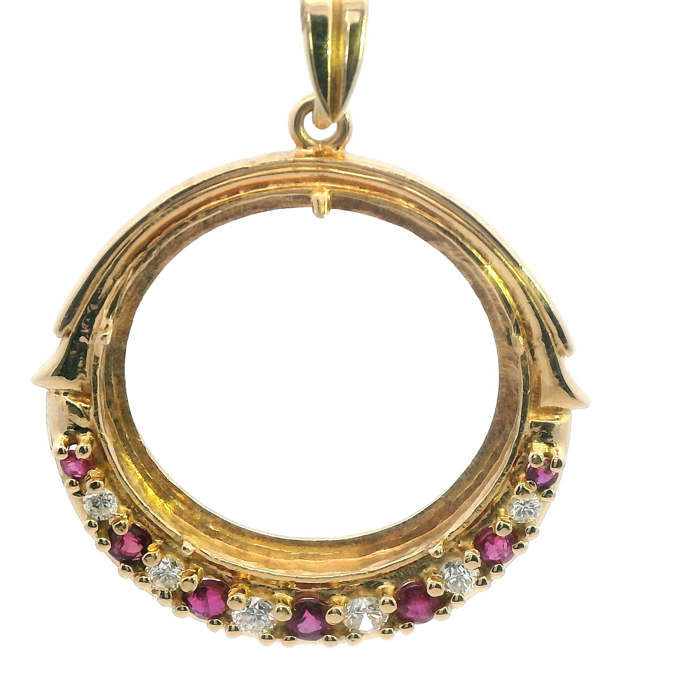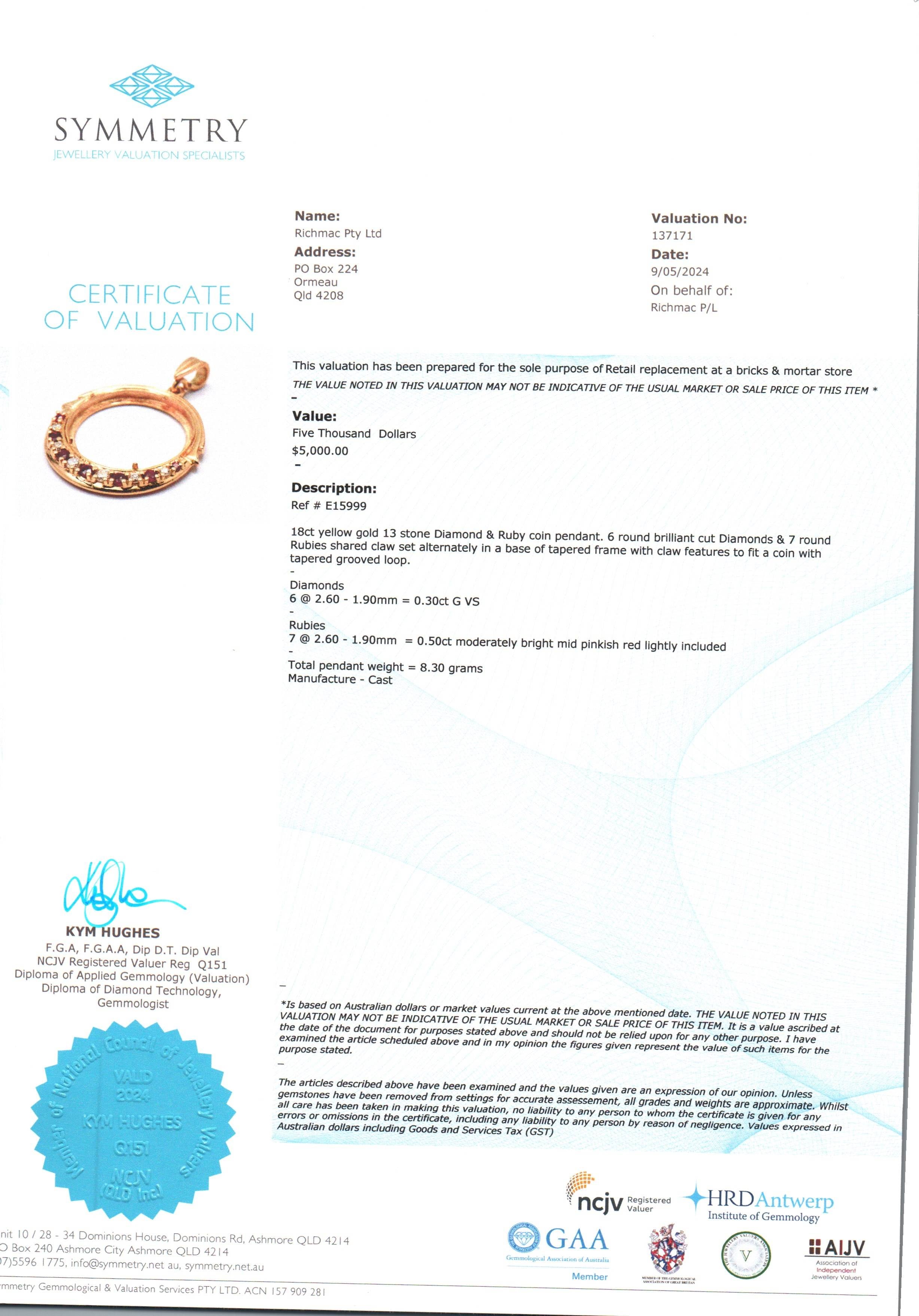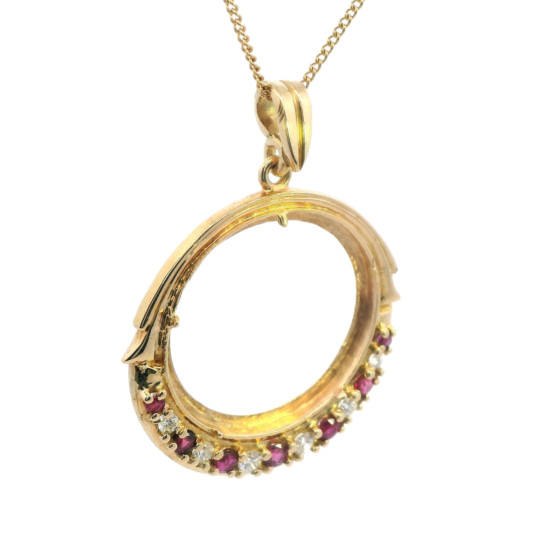 This luxurious 18ct yellow gold pendant features a stunning combination of diamonds and rubies, designed to hold a coin at its center. With its intricate setting and vibrant gemstones, this pendant is a true masterpiece, perfect for adding a touch of sophistication and elegance to any collection.