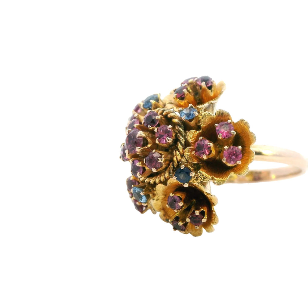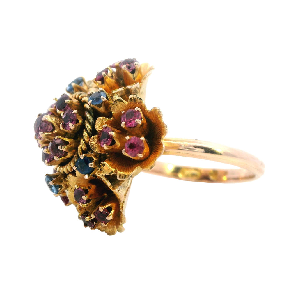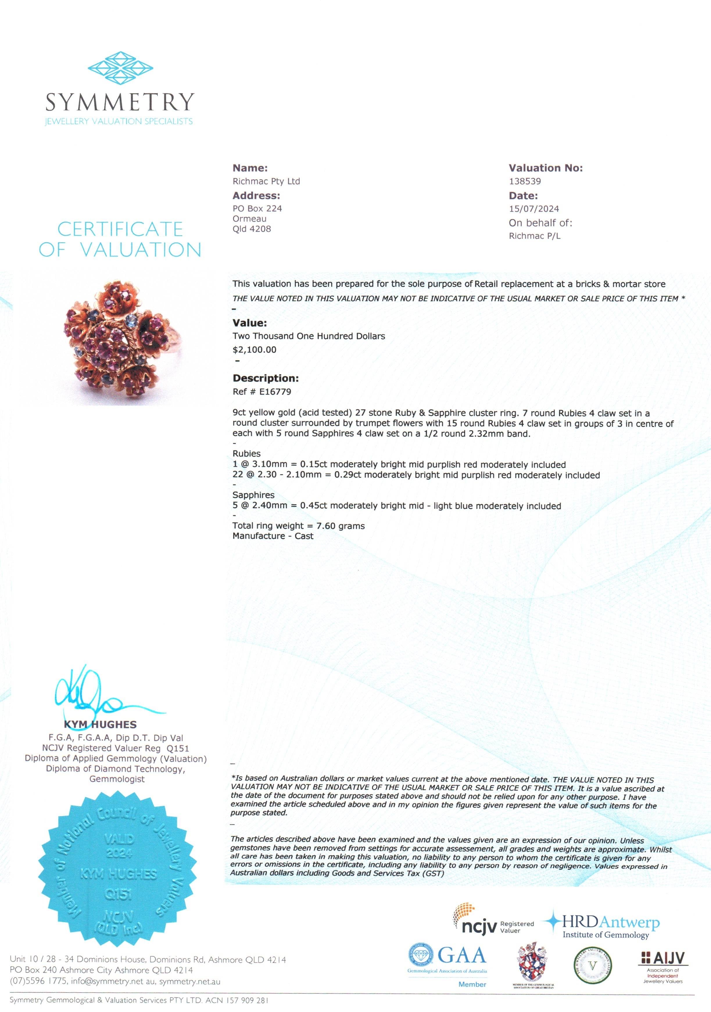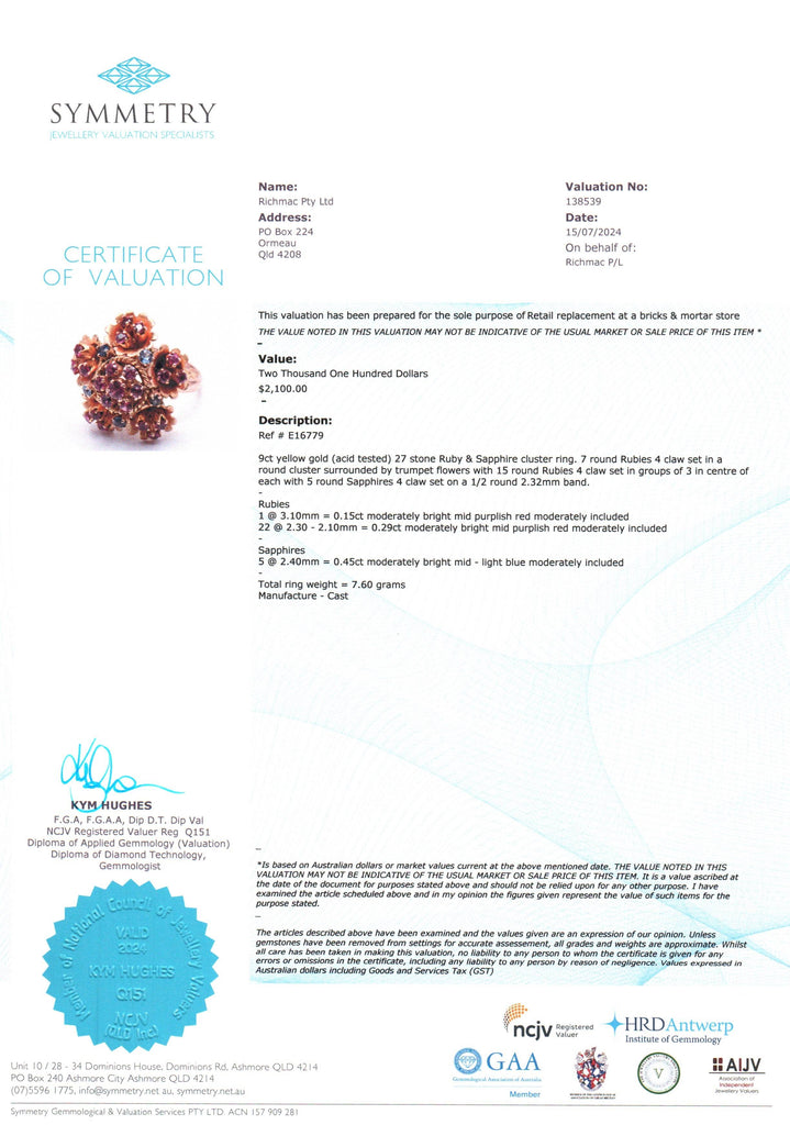 This stunning 9ct yellow gold cluster ring showcases a beautiful arrangement of rubies and sapphires, creating a dazzling and unique design. The intricate setting and vibrant gemstones make this ring a perfect choice for adding a touch of elegance and color to any outfit.