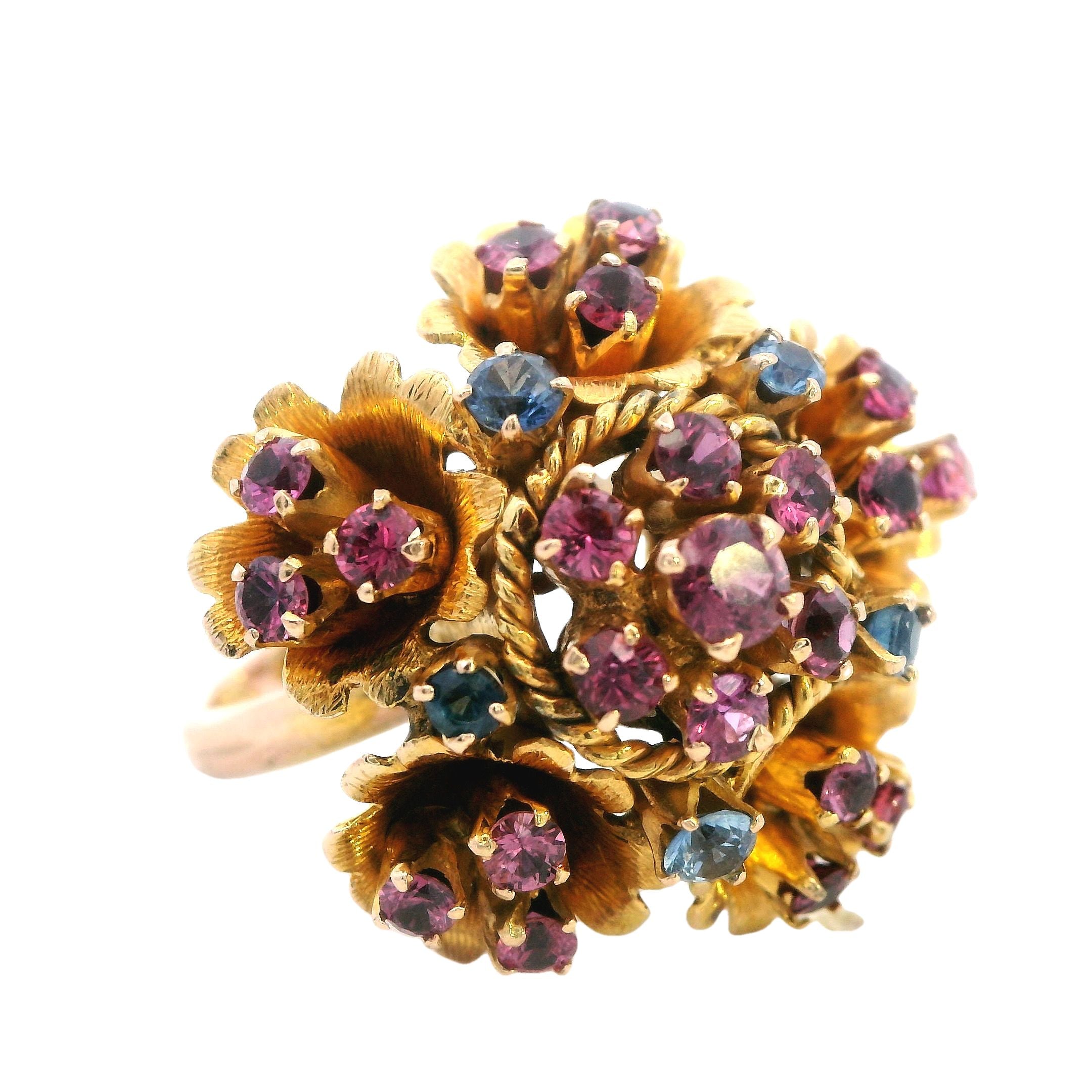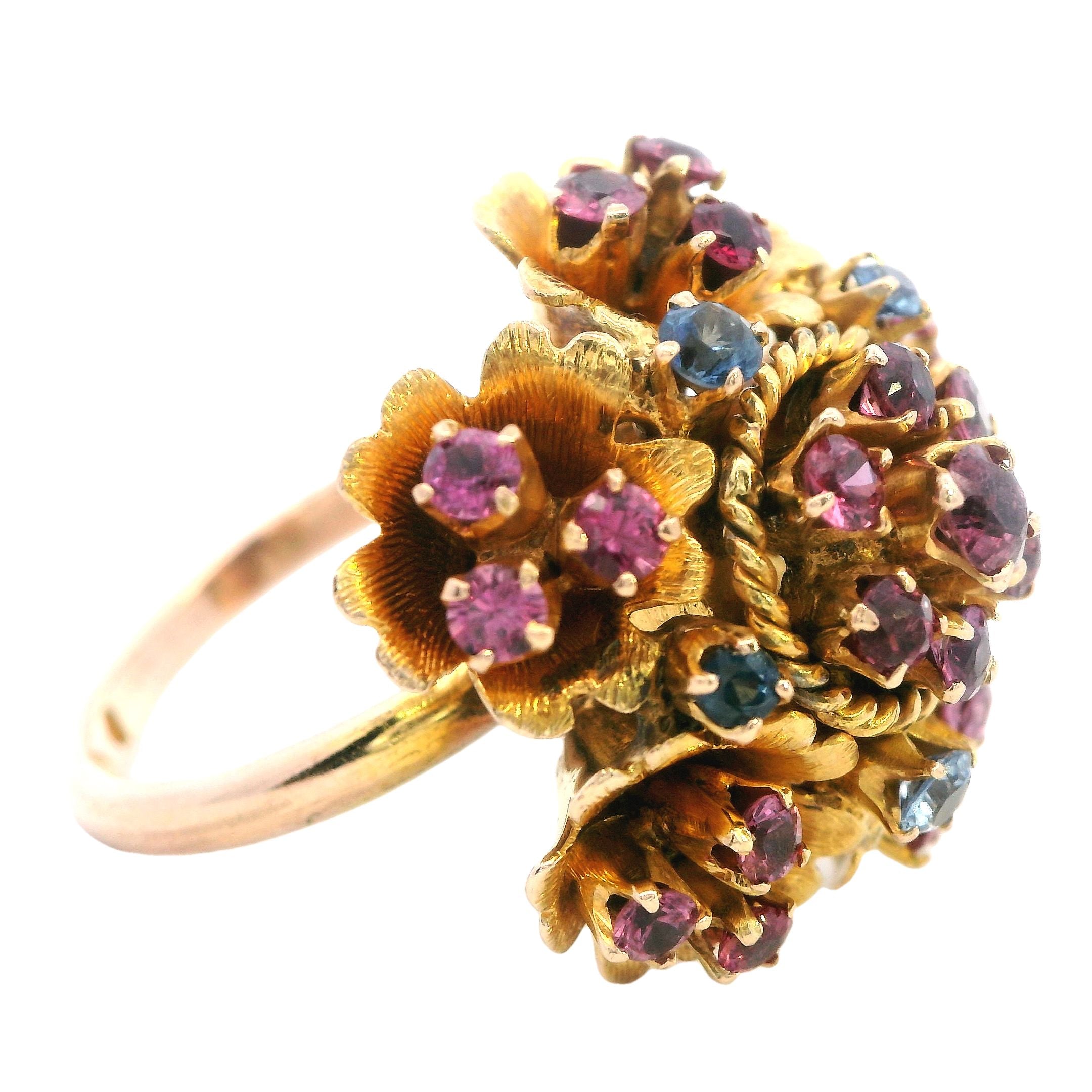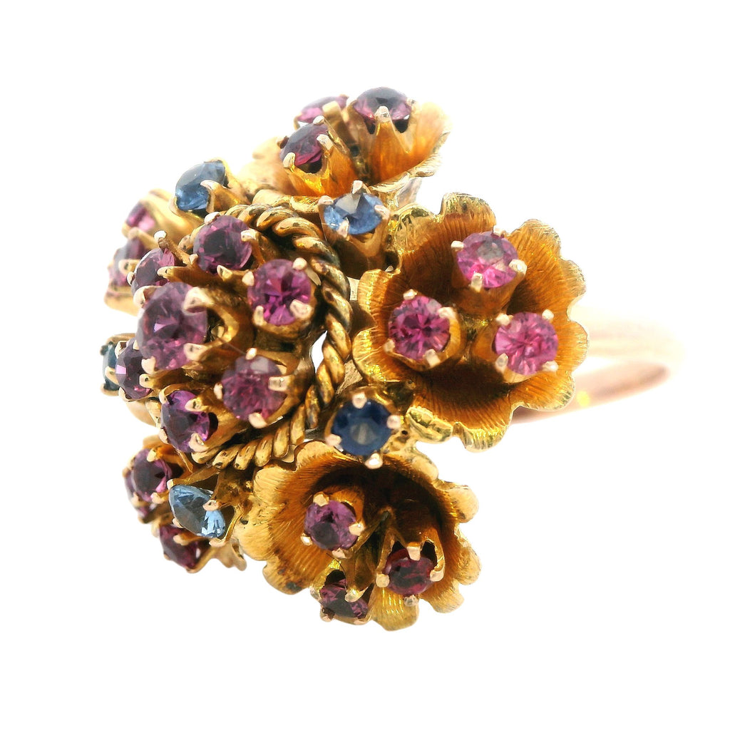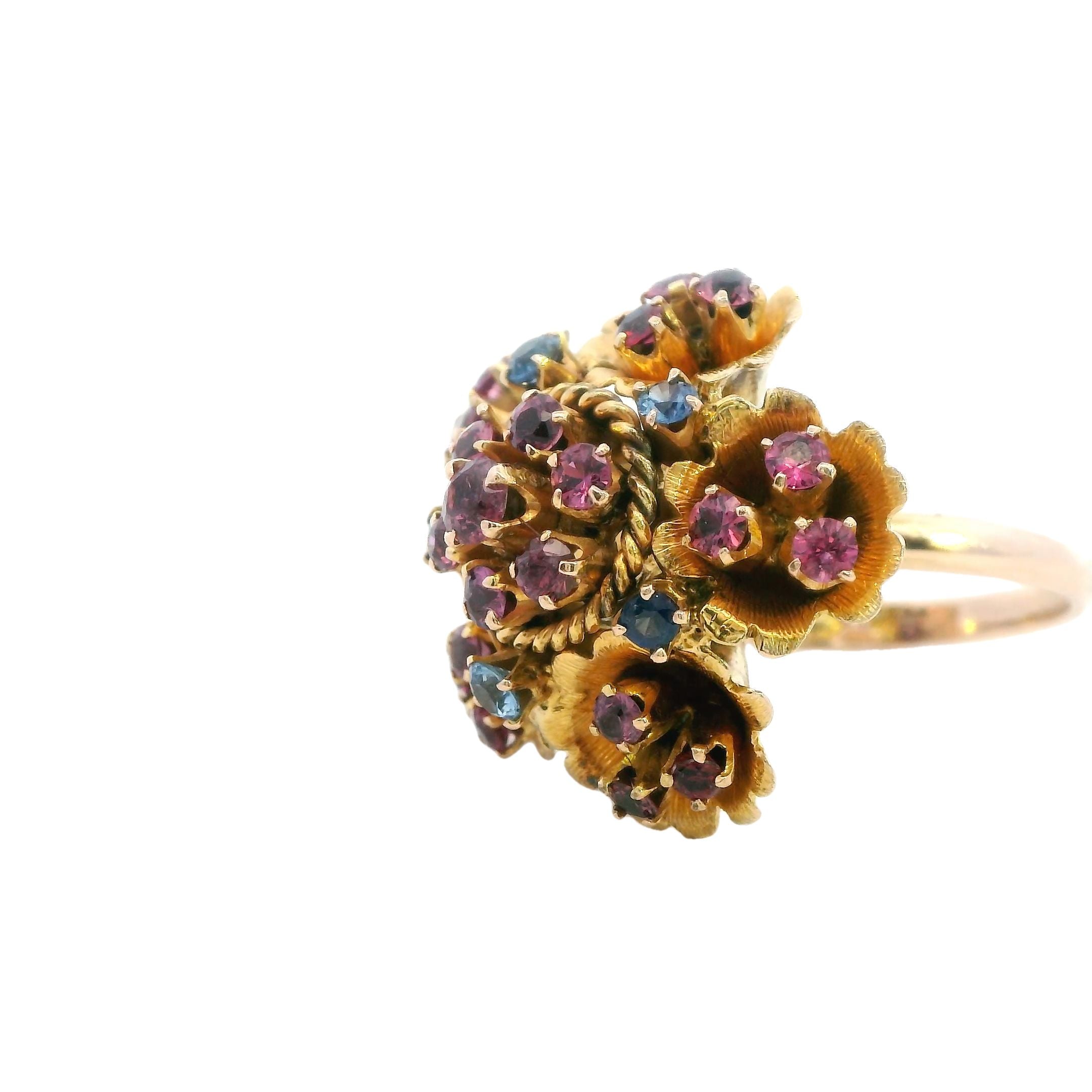 This stunning 9ct yellow gold cluster ring showcases a beautiful arrangement of rubies and sapphires, creating a dazzling and unique design. The intricate setting and vibrant gemstones make this ring a perfect choice for adding a touch of elegance and color to any outfit.