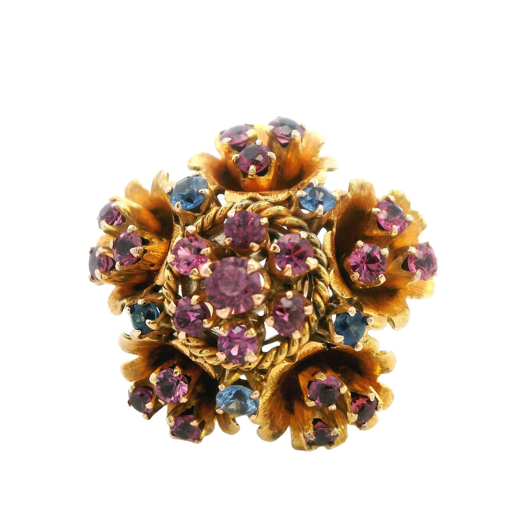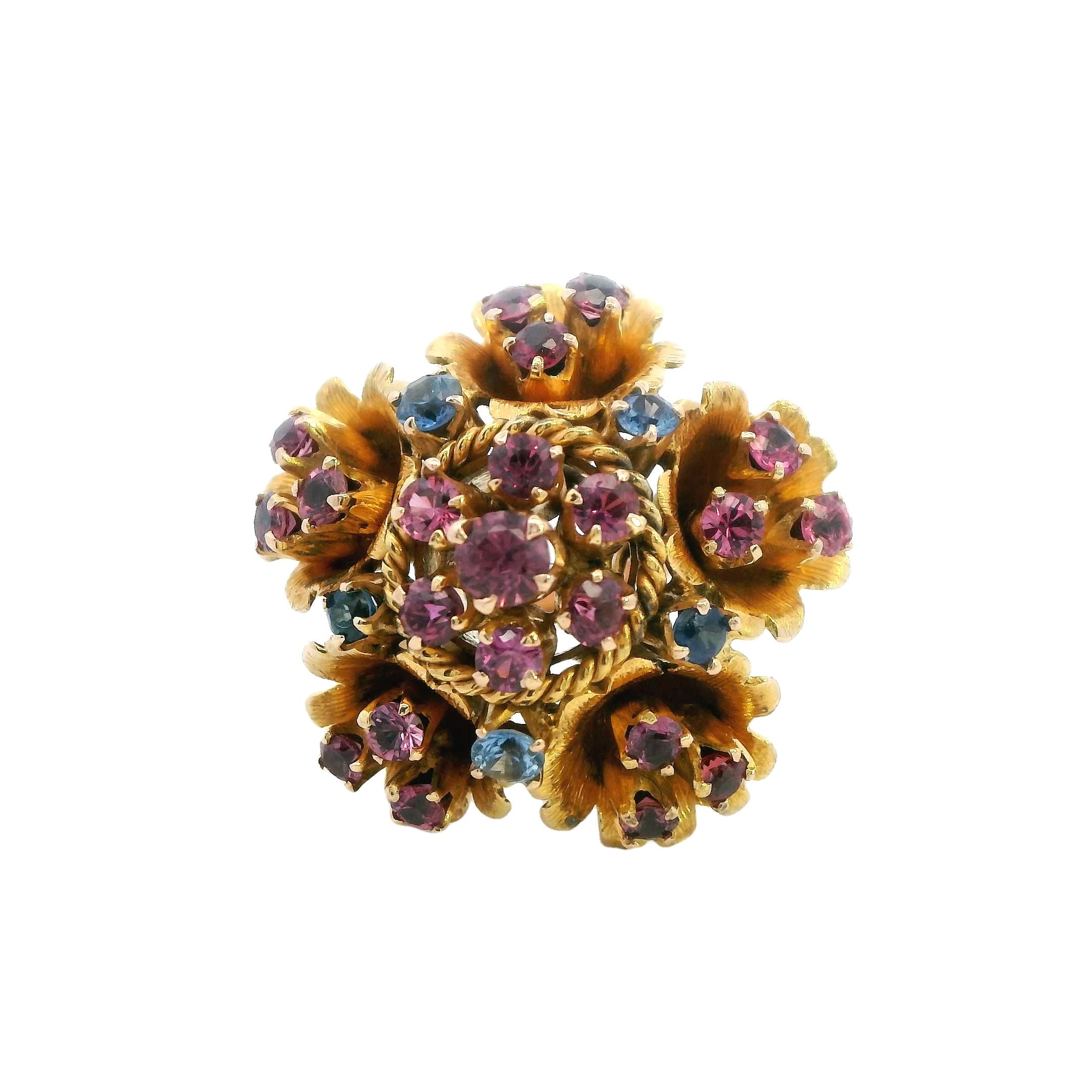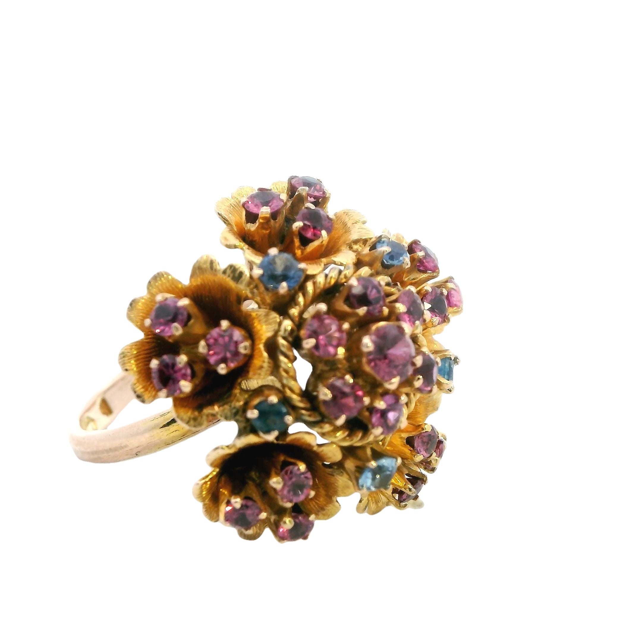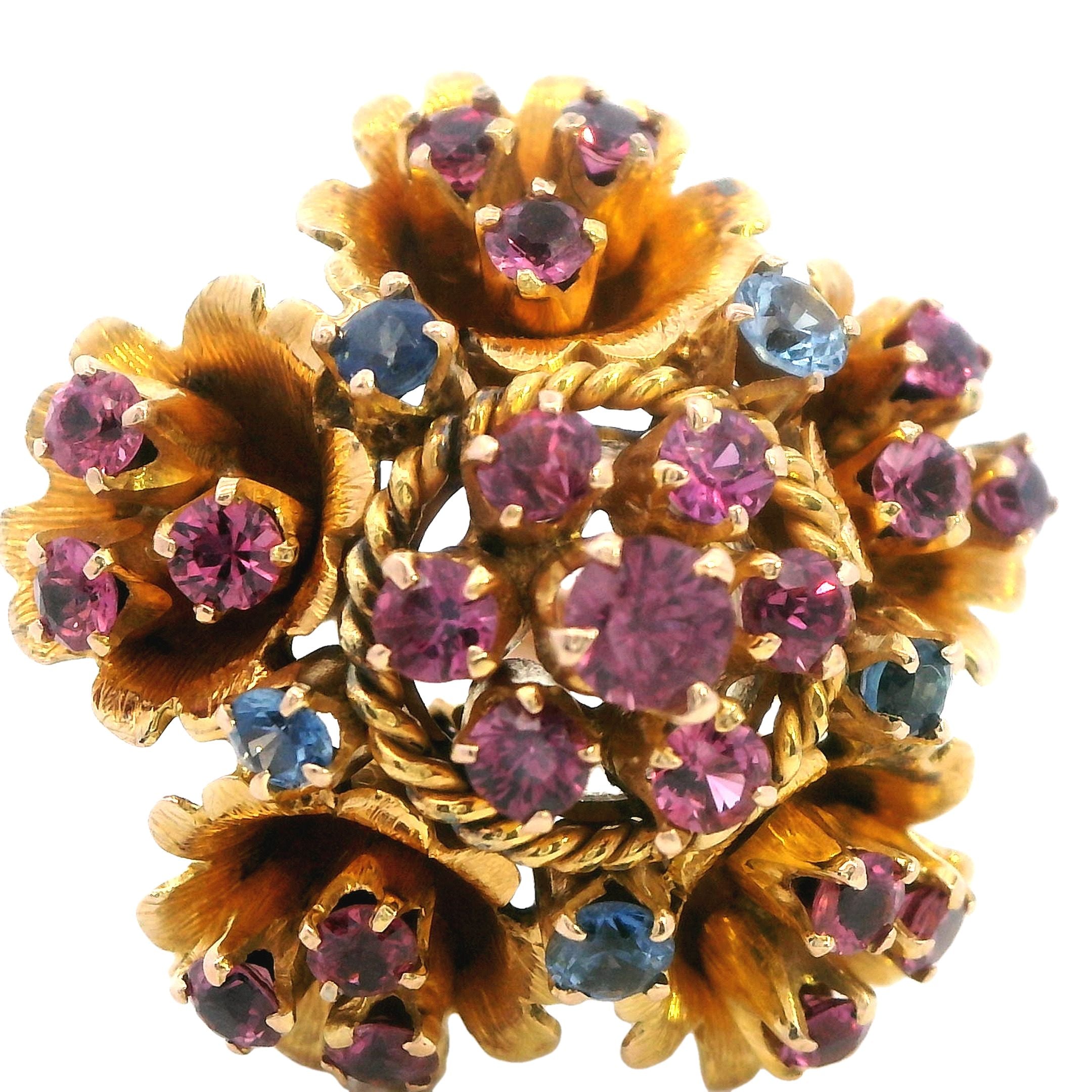This stunning 9ct yellow gold cluster ring showcases a beautiful arrangement of rubies and sapphires, creating a dazzling and unique design. The intricate setting and vibrant gemstones make this ring a perfect choice for adding a touch of elegance and color to any outfit.