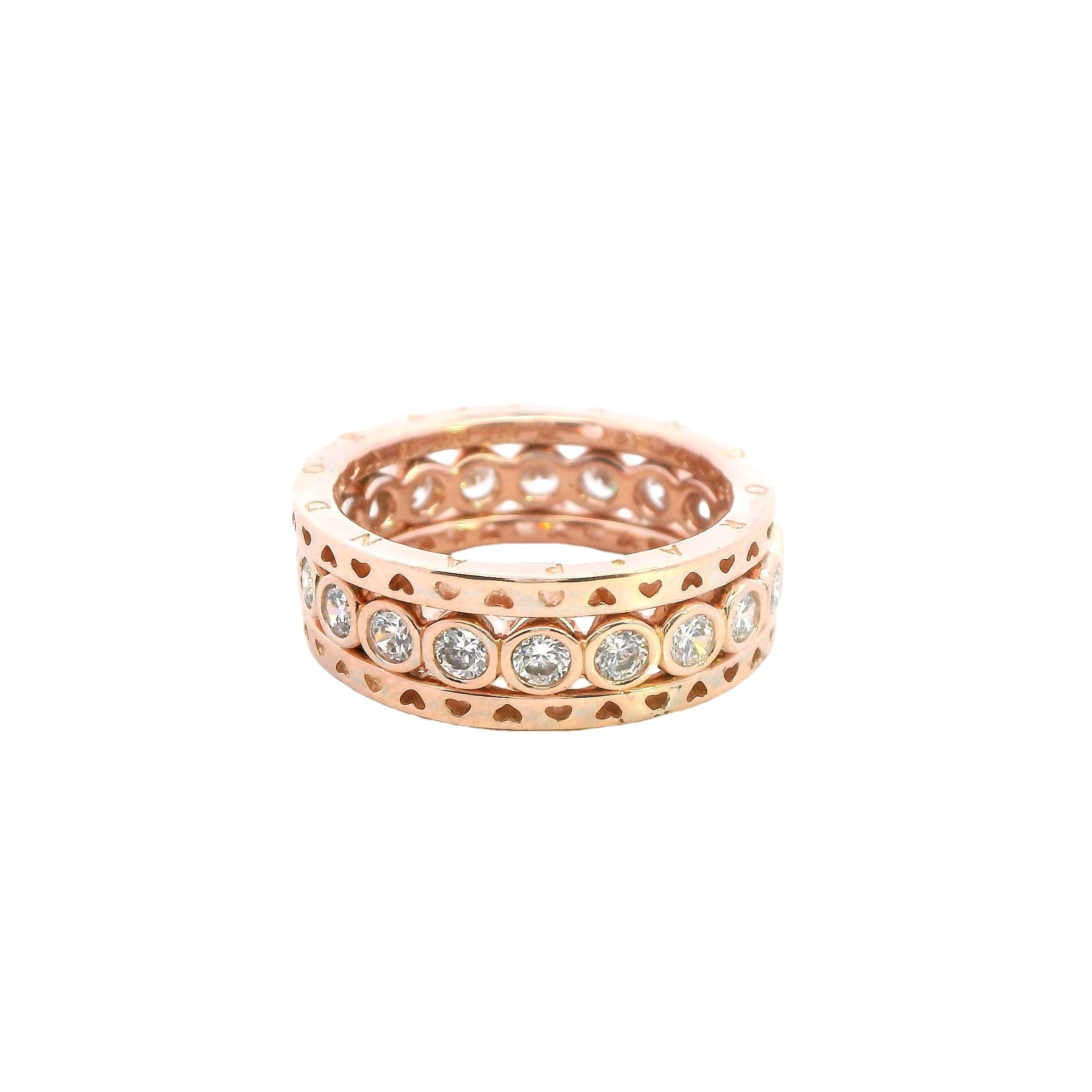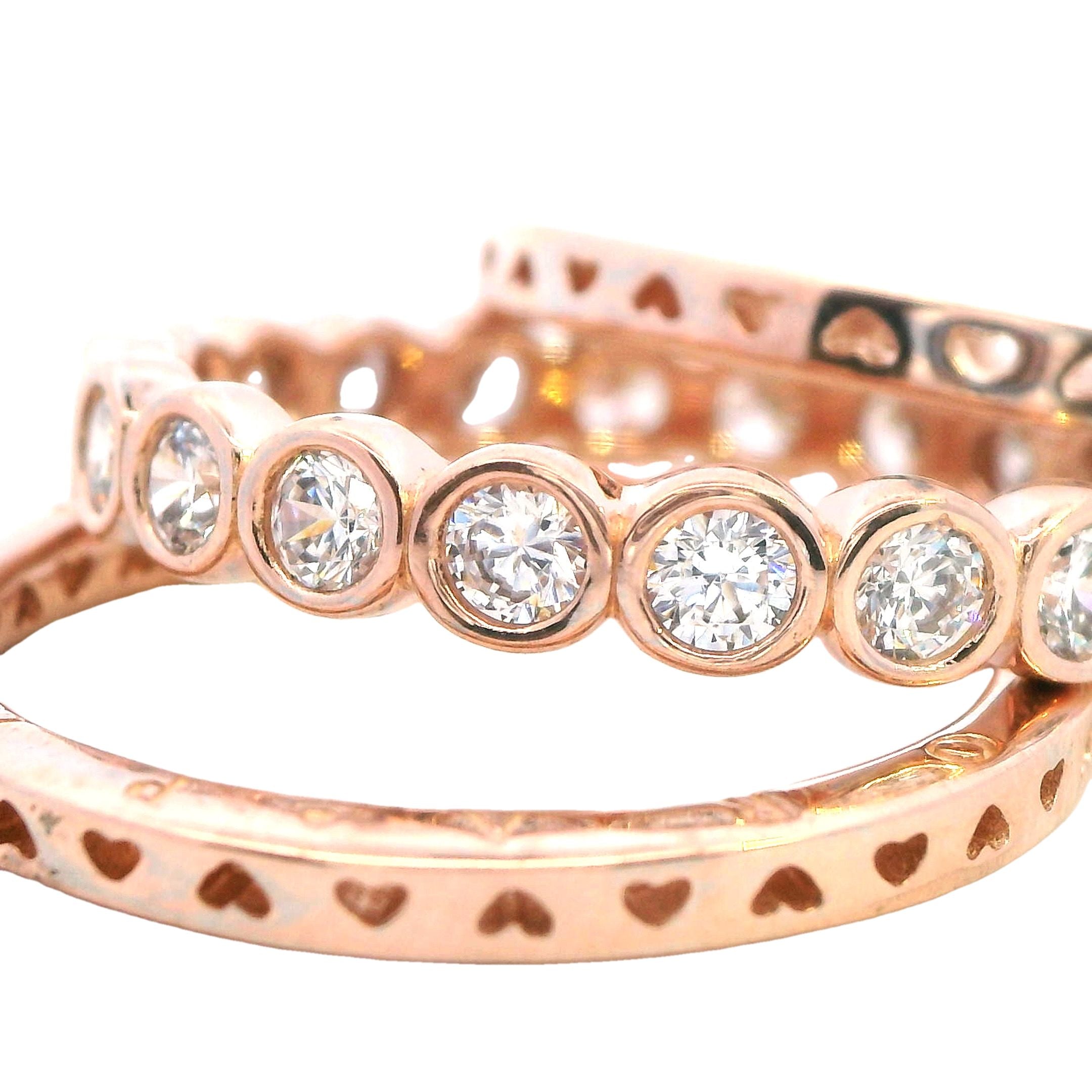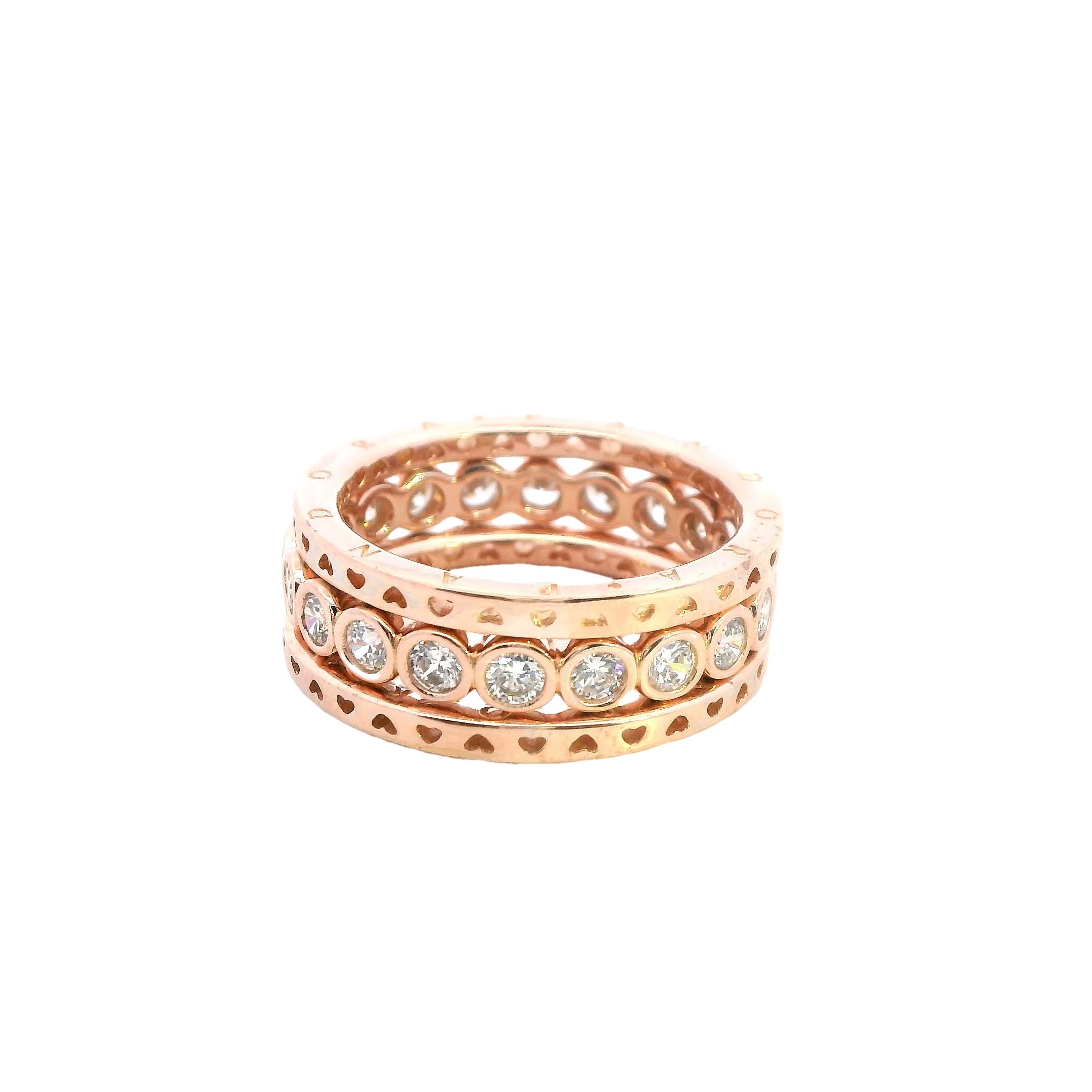 This elegant set of three rose gold plated Pandora rings offers a luxurious and timeless design. The set consists of two simple yet stylish bands, both engraved with "PANDORA" on the top and bottom, stamped with T1 ALE MET58 for authenticity. The third ring is beautifully adorned with 20 cubic zirconias (CZs), adding sparkle and sophistication, and is stamped with ALE 60.