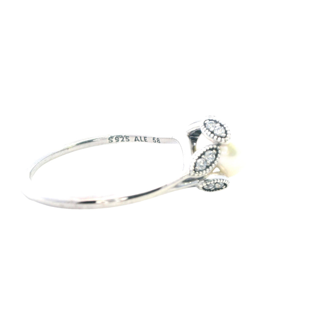 This elegant Pandora silver ring features a beautiful pearl set in sterling silver, marked with S 925 ALE 58, confirming its authenticity and quality. The classic design makes this ring a timeless accessory that can be worn for any occasion, whether casual or formal.