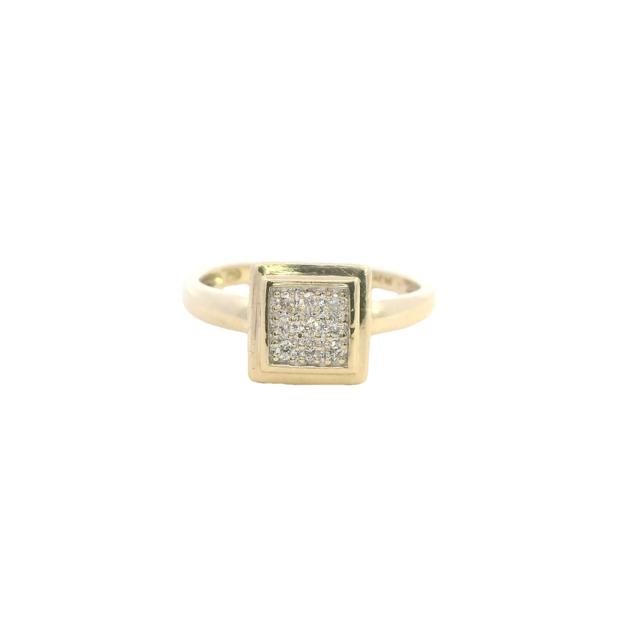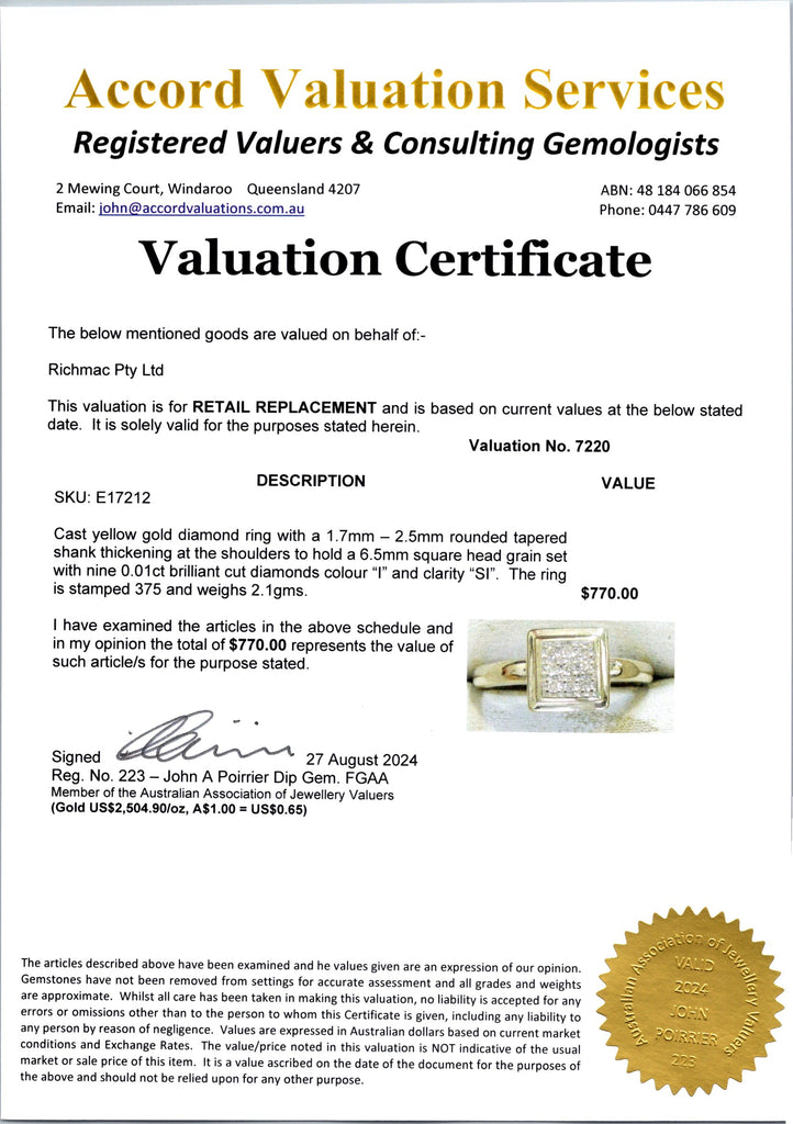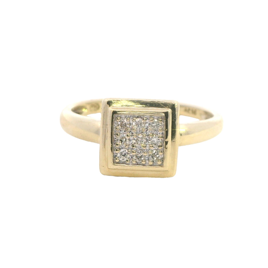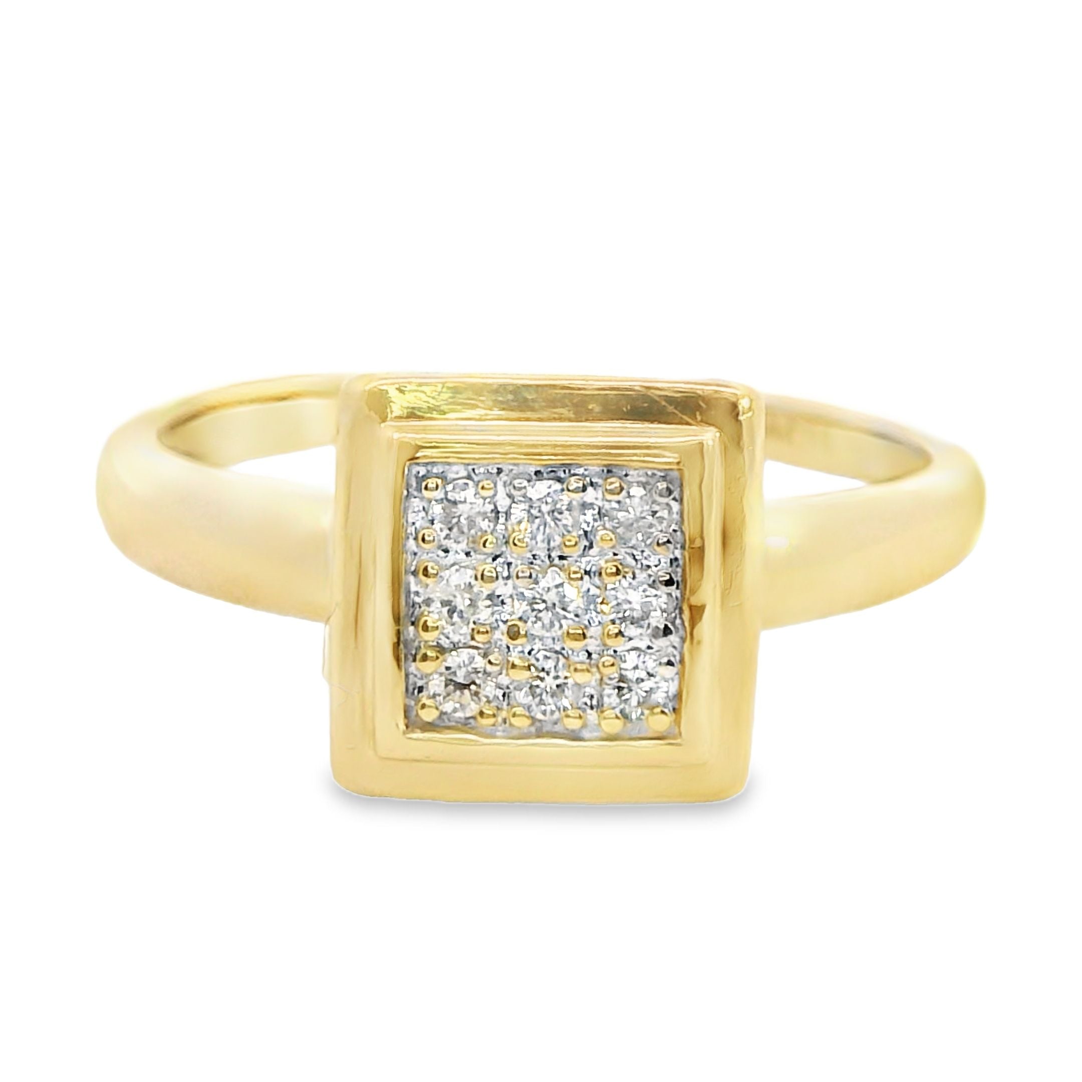 The ring features a 1.7mm - 2.5mm rounded tapered shank that thickens at the shoulders, leading to a beautifully crafted 6.5mm square head. The head is grain-set with nine sparkling 0.01ct brilliant-cut diamonds, creating a dazzling cluster effect that catches the light from every angle. With a total diamond weight of 0.09ct, these diamonds are graded as color "I" and clarity "SI," ensuring a lovely white sparkle and clarity that adds to the ring's overall allure.