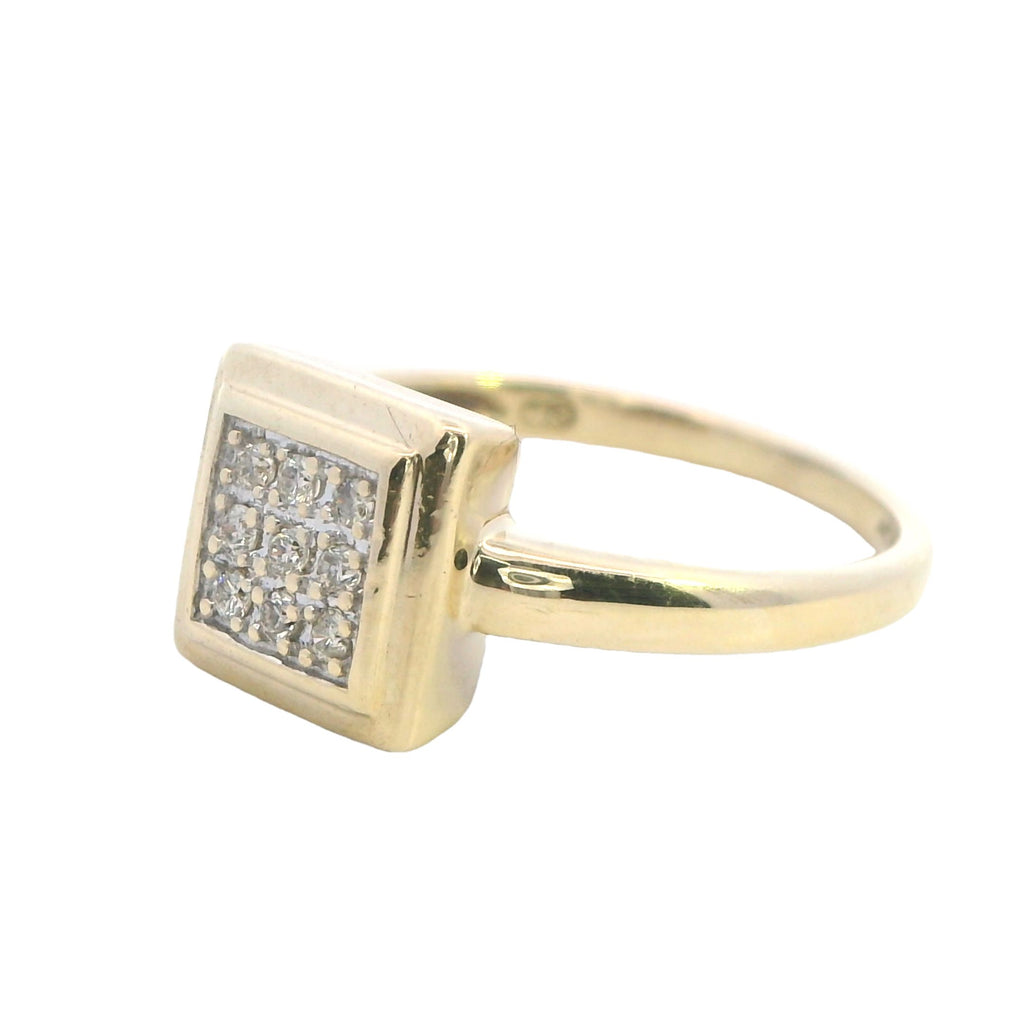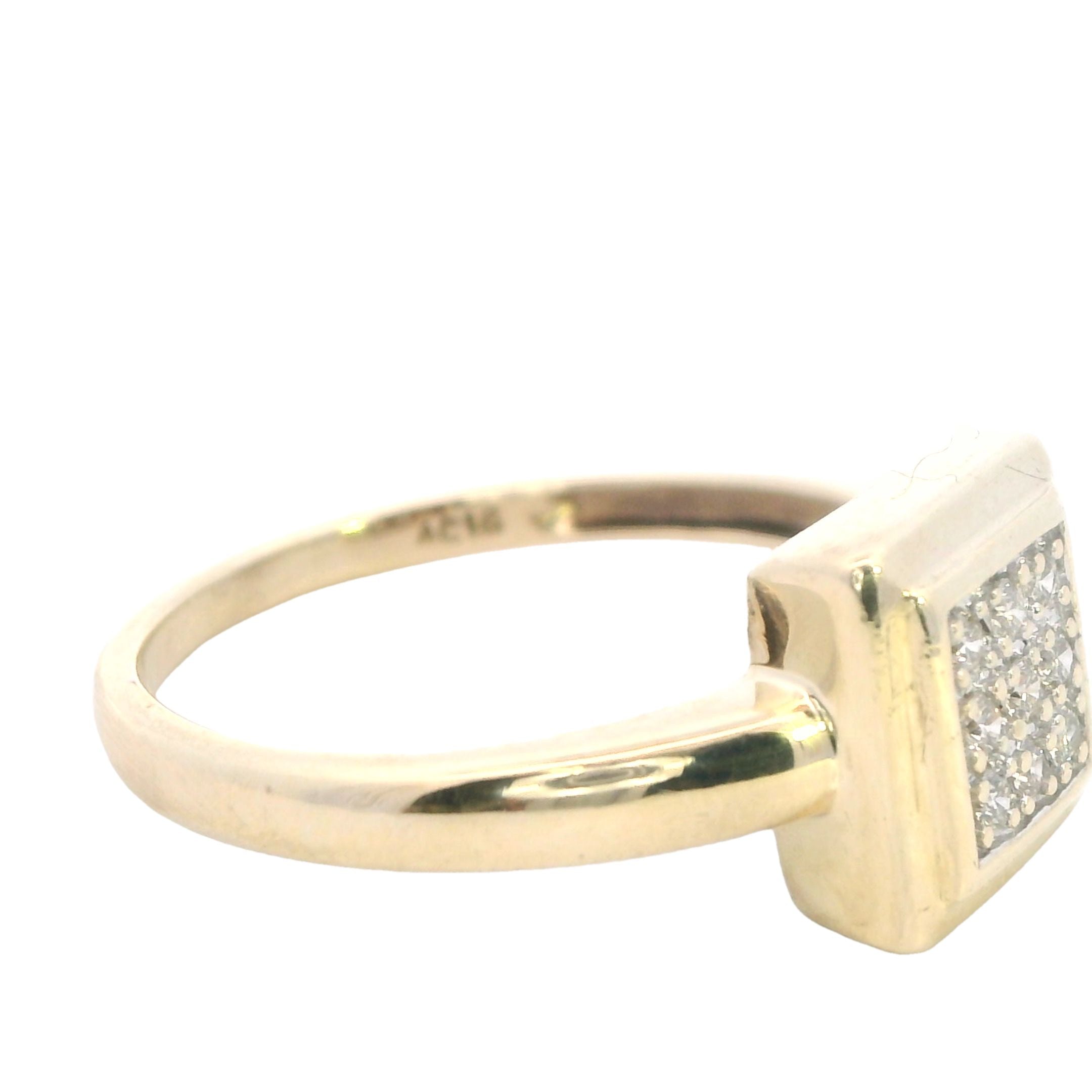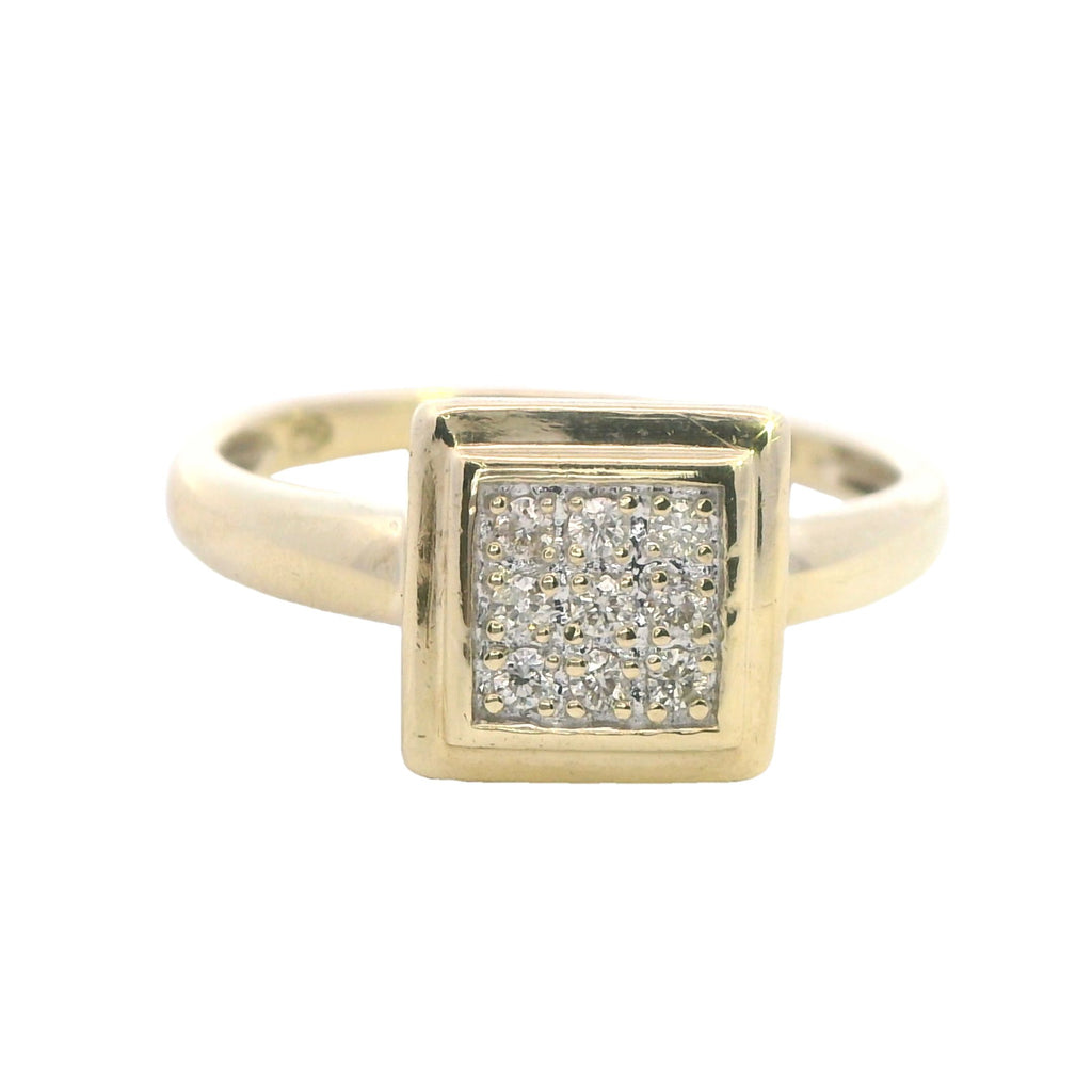 The ring features a 1.7mm - 2.5mm rounded tapered shank that thickens at the shoulders, leading to a beautifully crafted 6.5mm square head. The head is grain-set with nine sparkling 0.01ct brilliant-cut diamonds, creating a dazzling cluster effect that catches the light from every angle. With a total diamond weight of 0.09ct, these diamonds are graded as color "I" and clarity "SI," ensuring a lovely white sparkle and clarity that adds to the ring's overall allure.