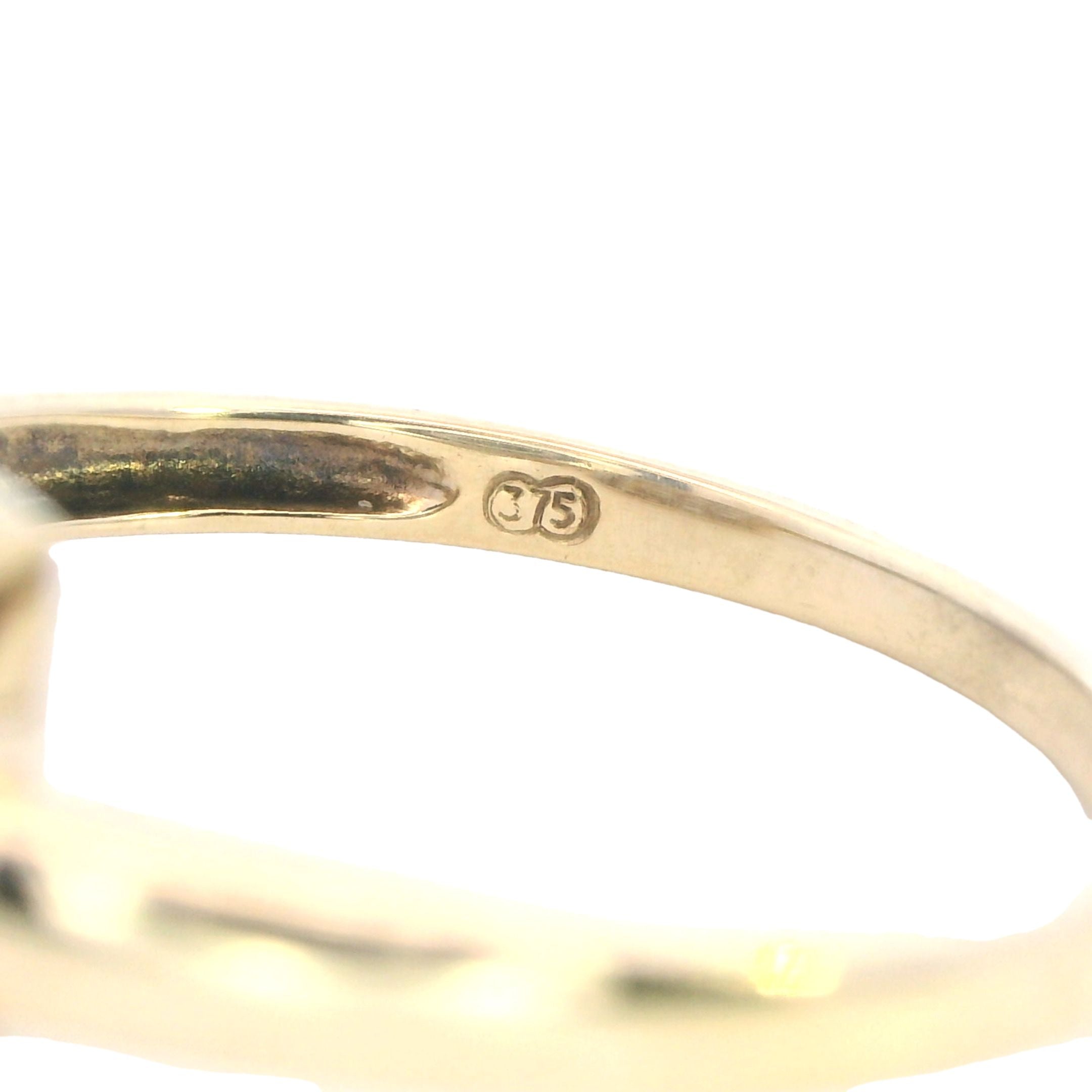 The ring is stamped 375, indicating 9ct gold, and weighs 2.1gms, providing a lightweight yet durable design that is comfortable to wear all day. The warm hue of the yellow gold beautifully complements the shimmer of the diamonds, making this ring a sweet and versatile addition to any jewelry collection.