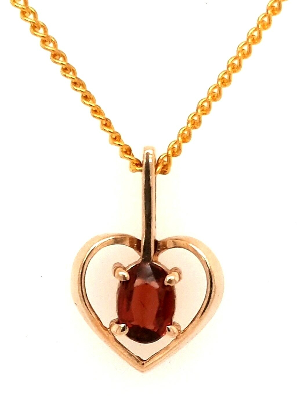 A pretty 9ct yellow gold heart shaped pendant featuring a lovely Garnet claw set in the centre.