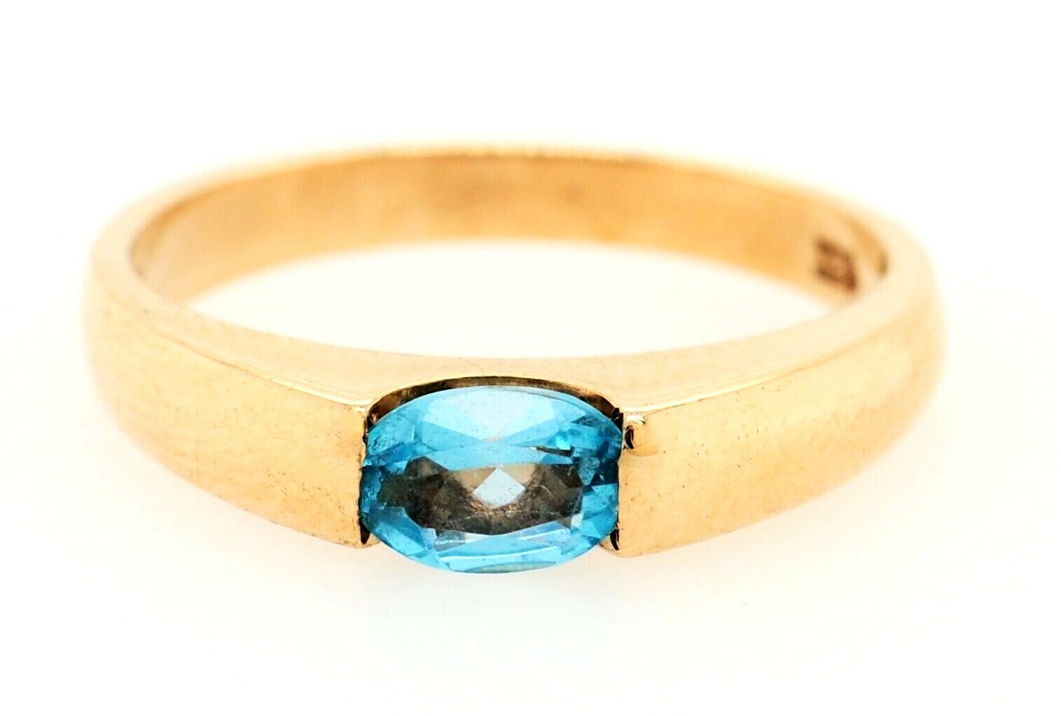 A beautiful 9ct yellow gold ring featuring a single Topaz in the centre.