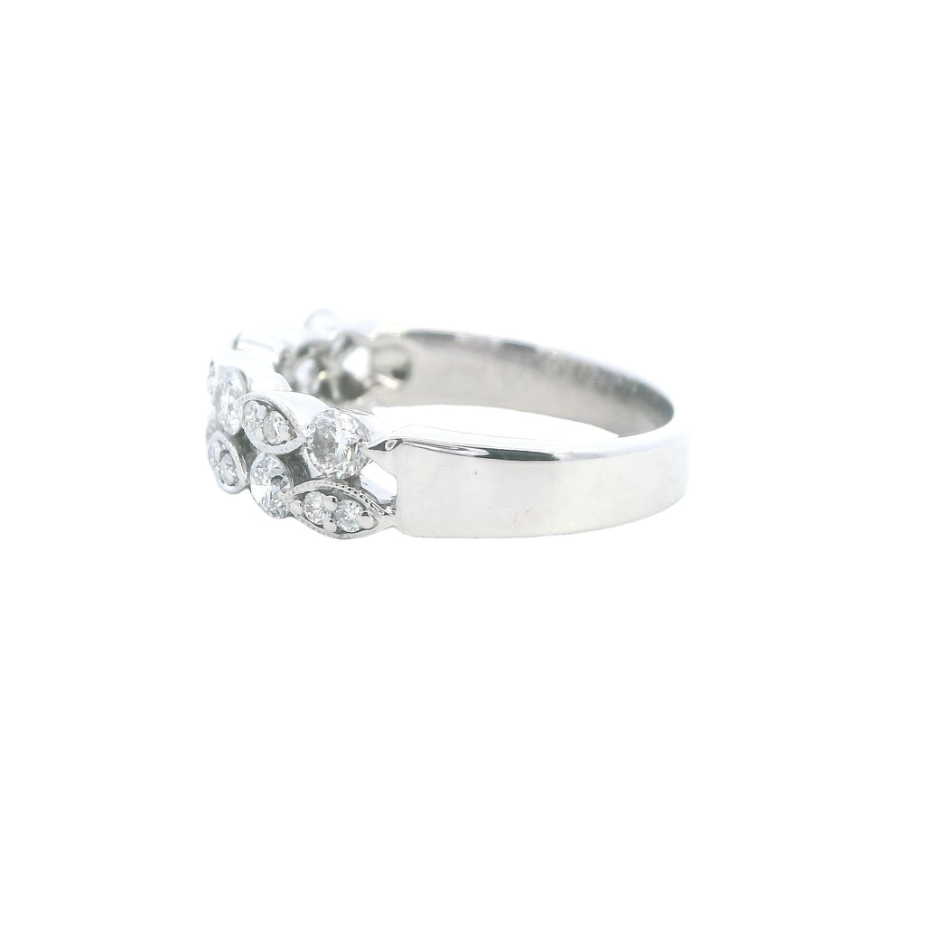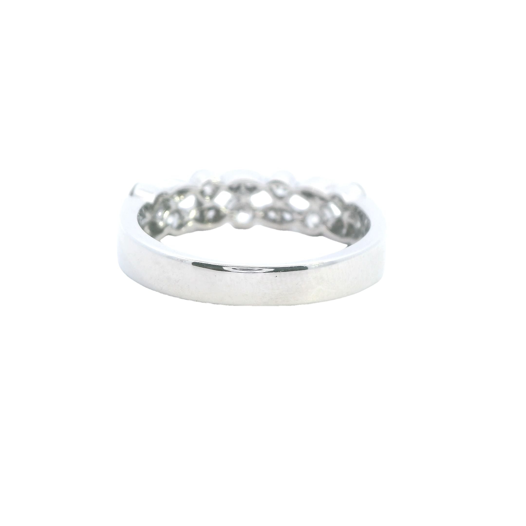Crafted in cast white gold, this ring features a 3.0mm - 3.8mm flat tapered shank that delicately transitions into a beautifully designed 5.0mm wide head. The head of the ring is expertly grain-set with fourteen brilliant diamonds, each measuring 0.005ct, and claw-set with an additional seven diamonds at 0.04ct each. These brilliant-cut diamonds shimmer with exceptional brilliance, making this piece truly radiant.