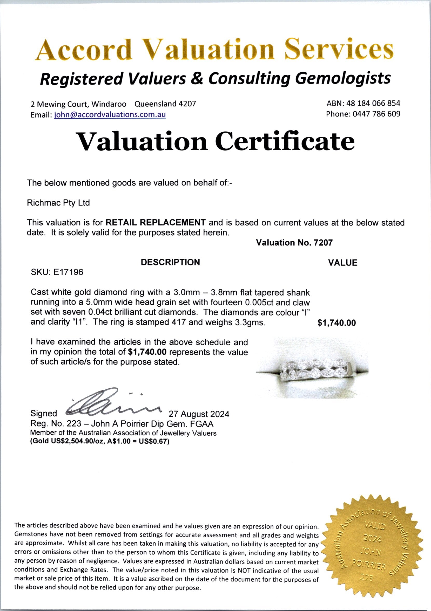 This ring is stamped 417, representing its white gold purity, and weighs a comfortable 3.3gms, ensuring both durability and luxury. The ring has been professionally valued at $1,740, highlighting its exceptional craftsmanship and quality.