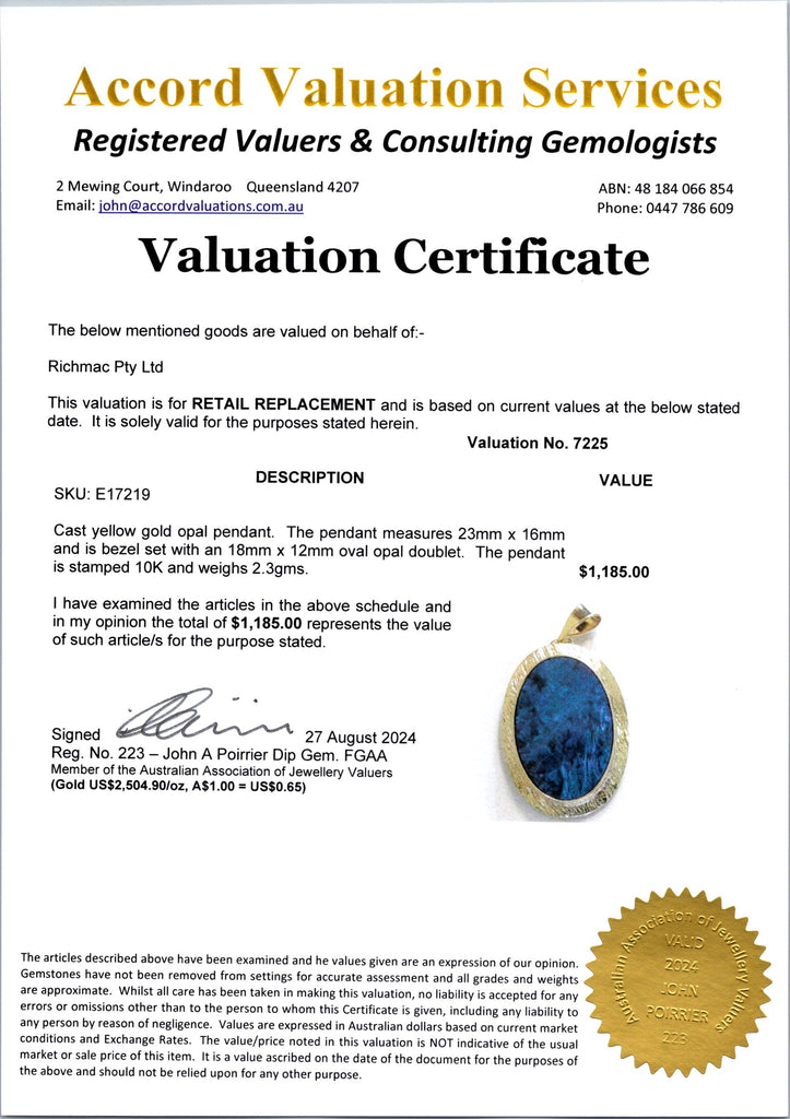 Feel free to reach out with any questions or for more information about this exquisite opal pendant. Secure this beautiful piece today and enjoy the captivating allure of opals in a classic yellow gold setting!