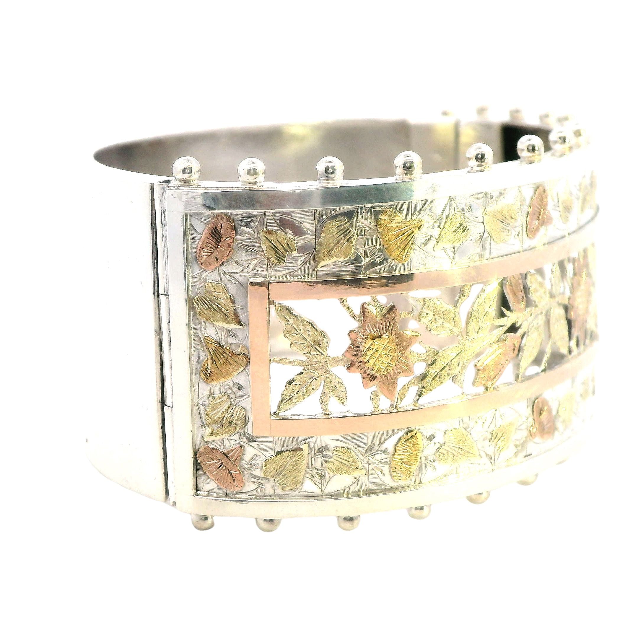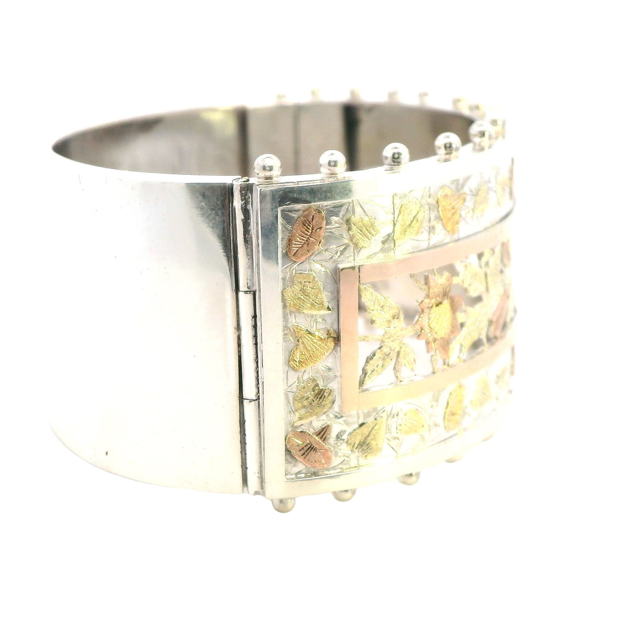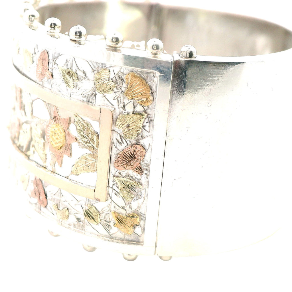 A beautifully crafted antique silver hinged bangle with a gold-plated section in the center. Stamped Birmingham 1890. The bangle measures 35.6mm in width and 58mm in internal diameter, weighing 43.3gms. Valued at $2,450.00. E15776