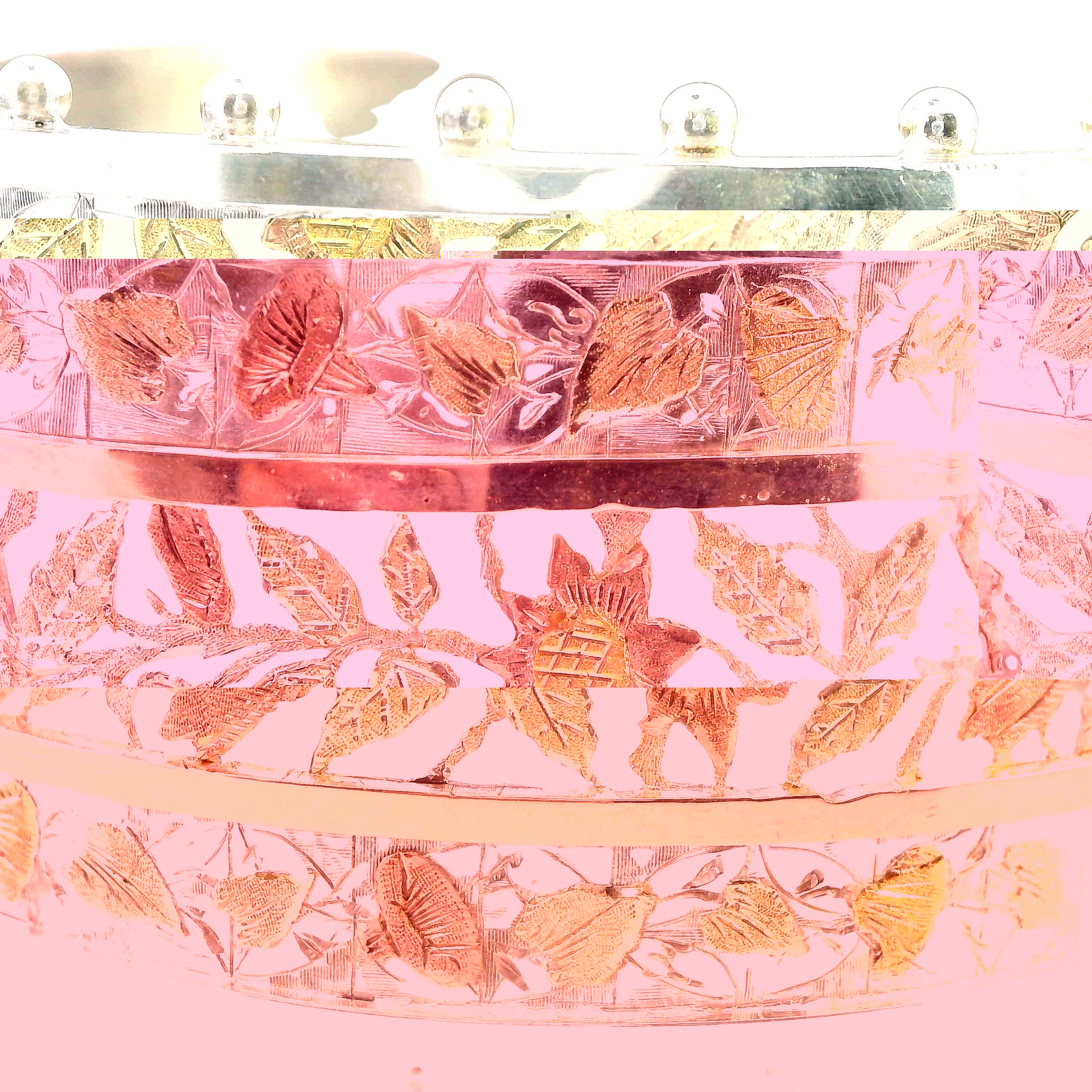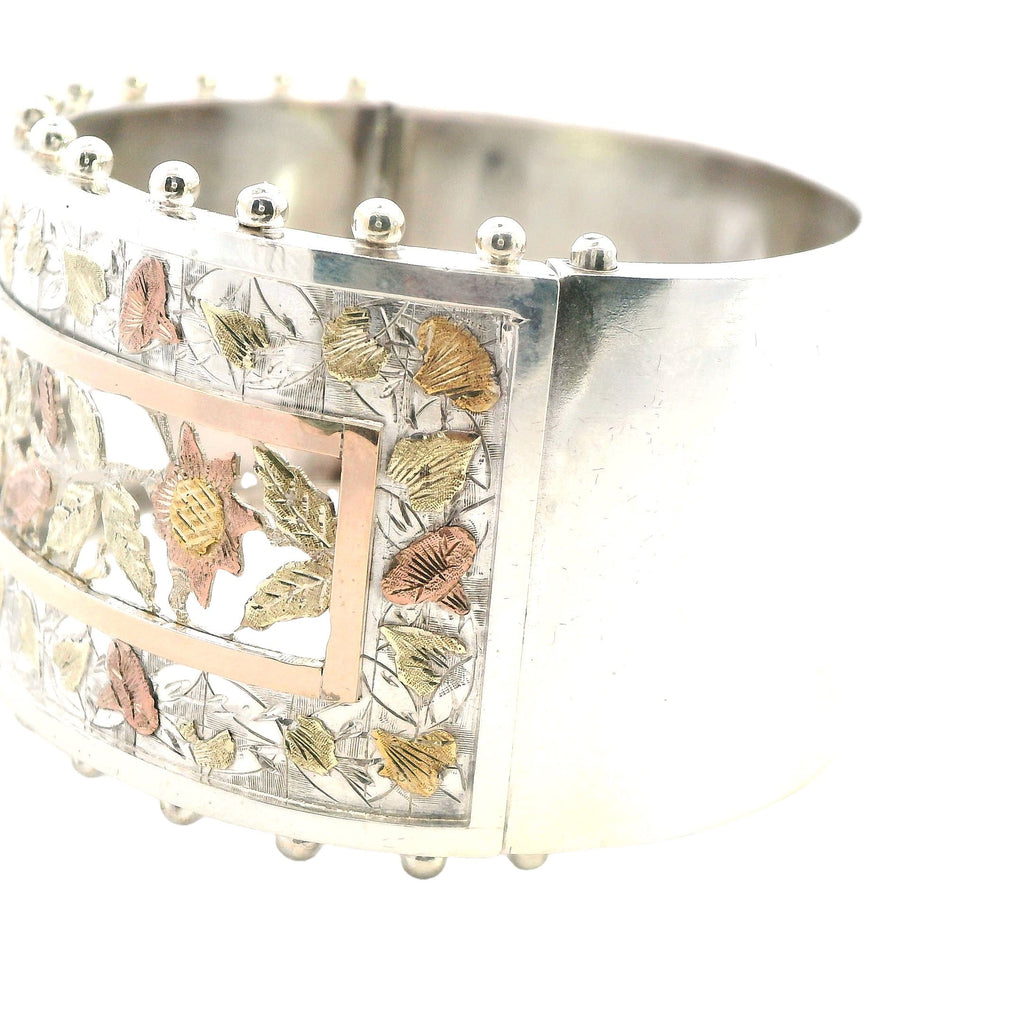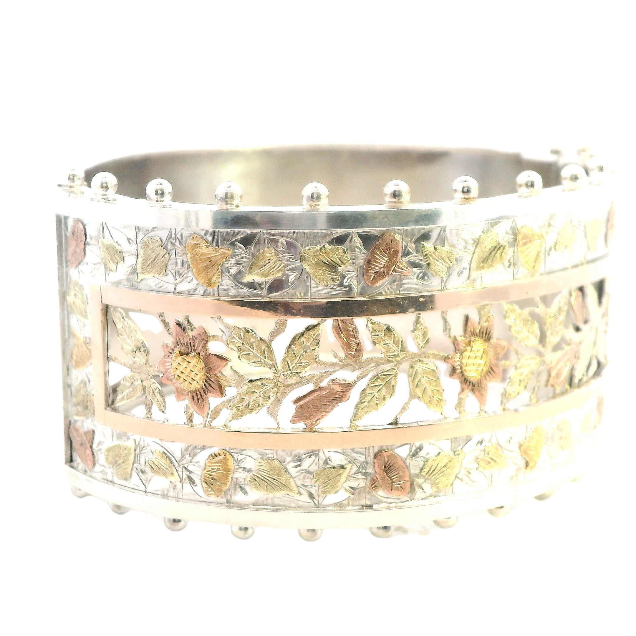 A beautifully crafted antique silver hinged bangle with a gold-plated section in the center. Stamped Birmingham 1890. The bangle measures 35.6mm in width and 58mm in internal diameter, weighing 43.3gms. Valued at $2,450.00. E15776