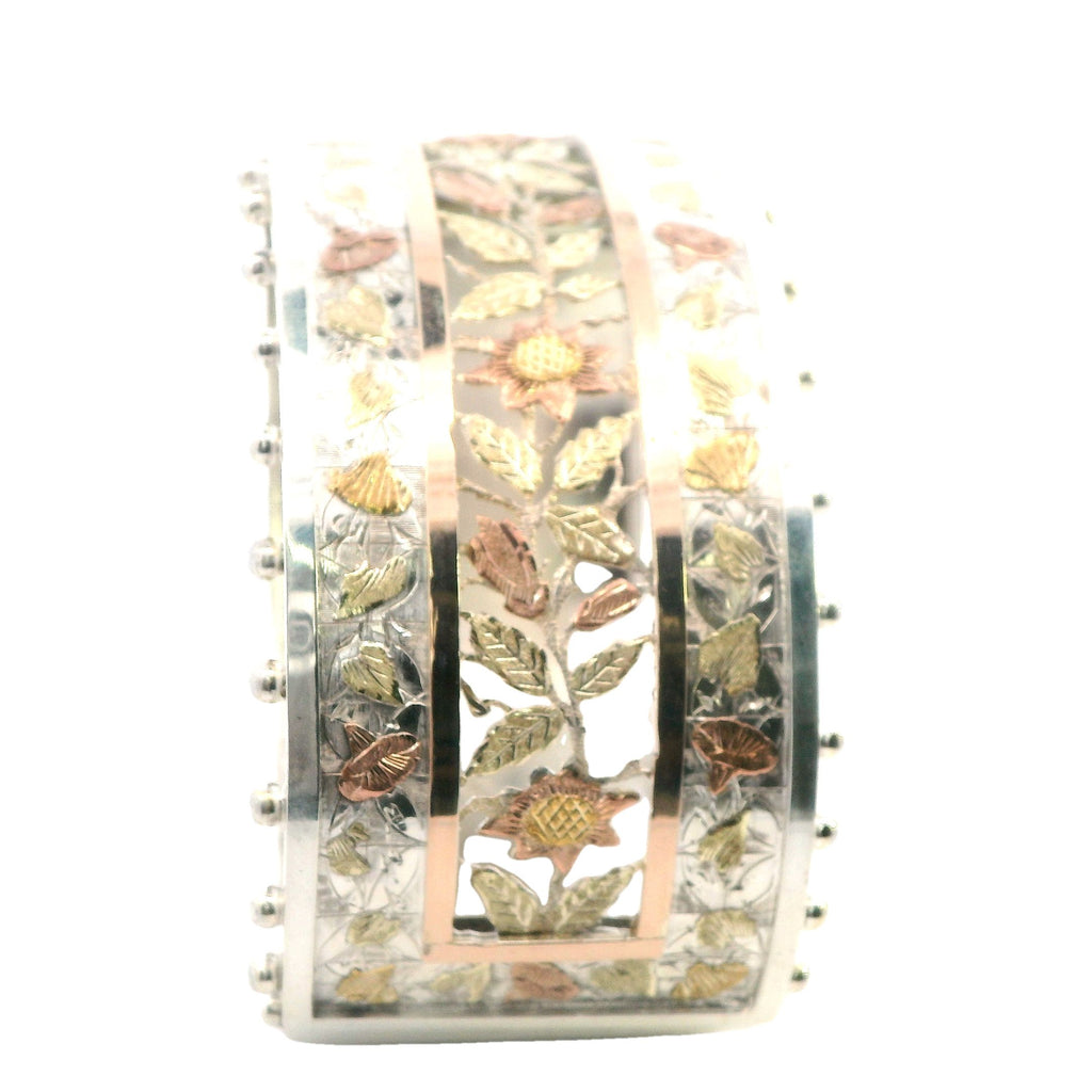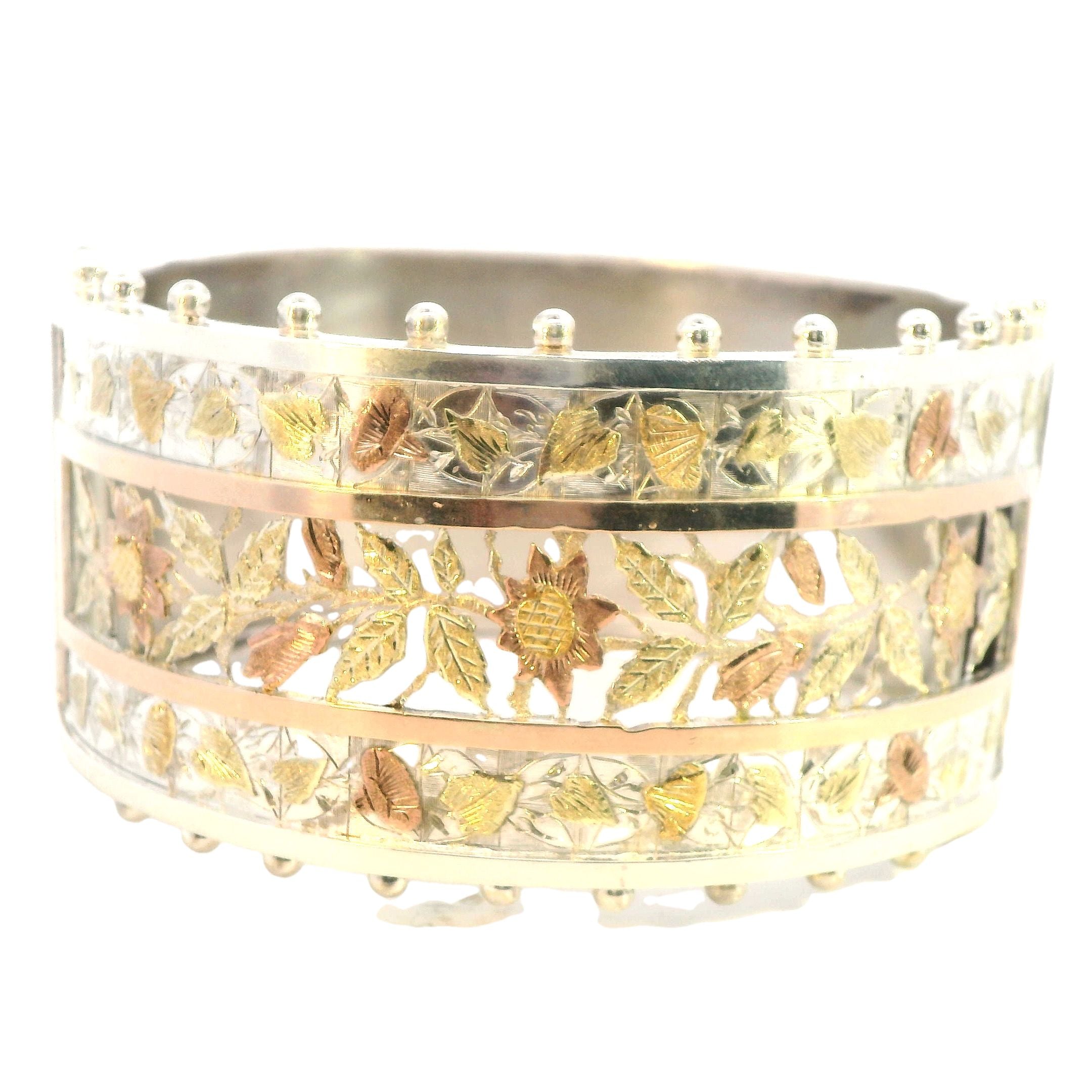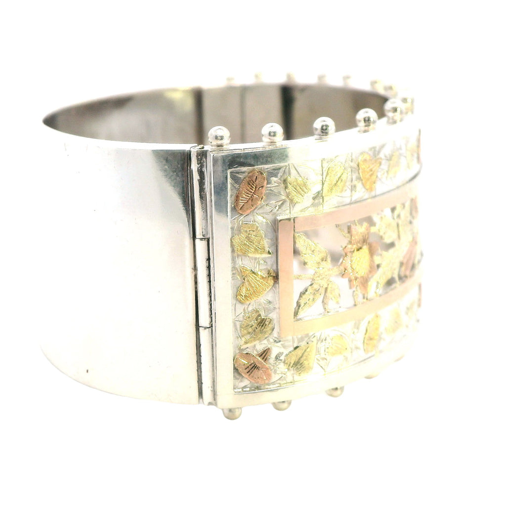 The bangle is cast and assembled in silver, with a striking gold-plated section at the center of the band, adding a touch of contrast and luxury to the design. The bangle's hinge mechanism allows for easy wear while maintaining a secure fit, making it as functional as it is beautiful.