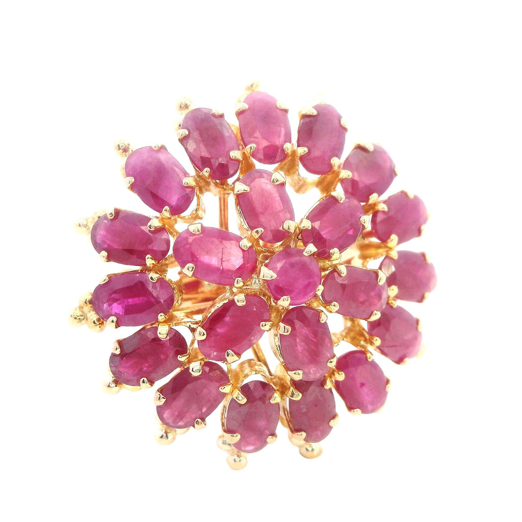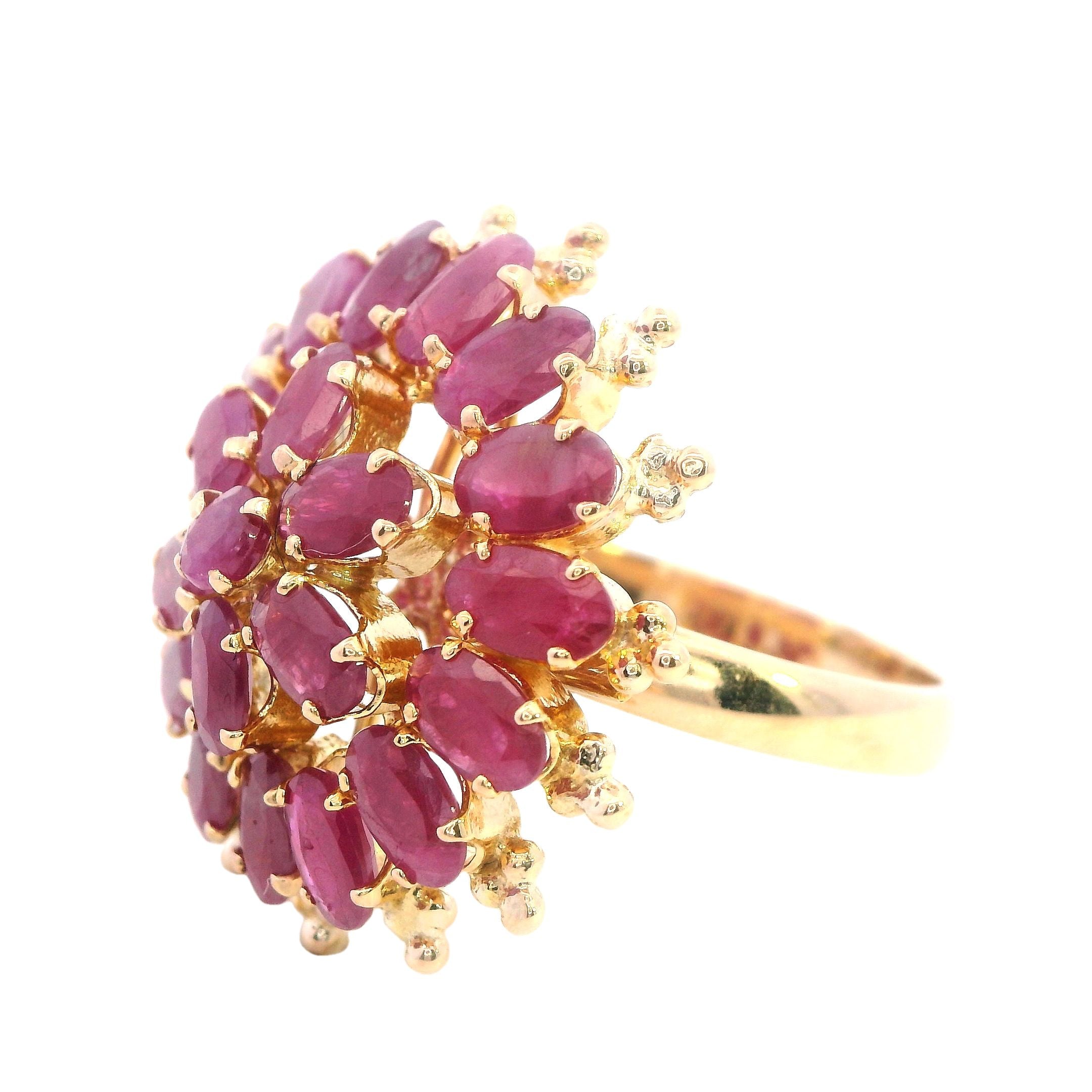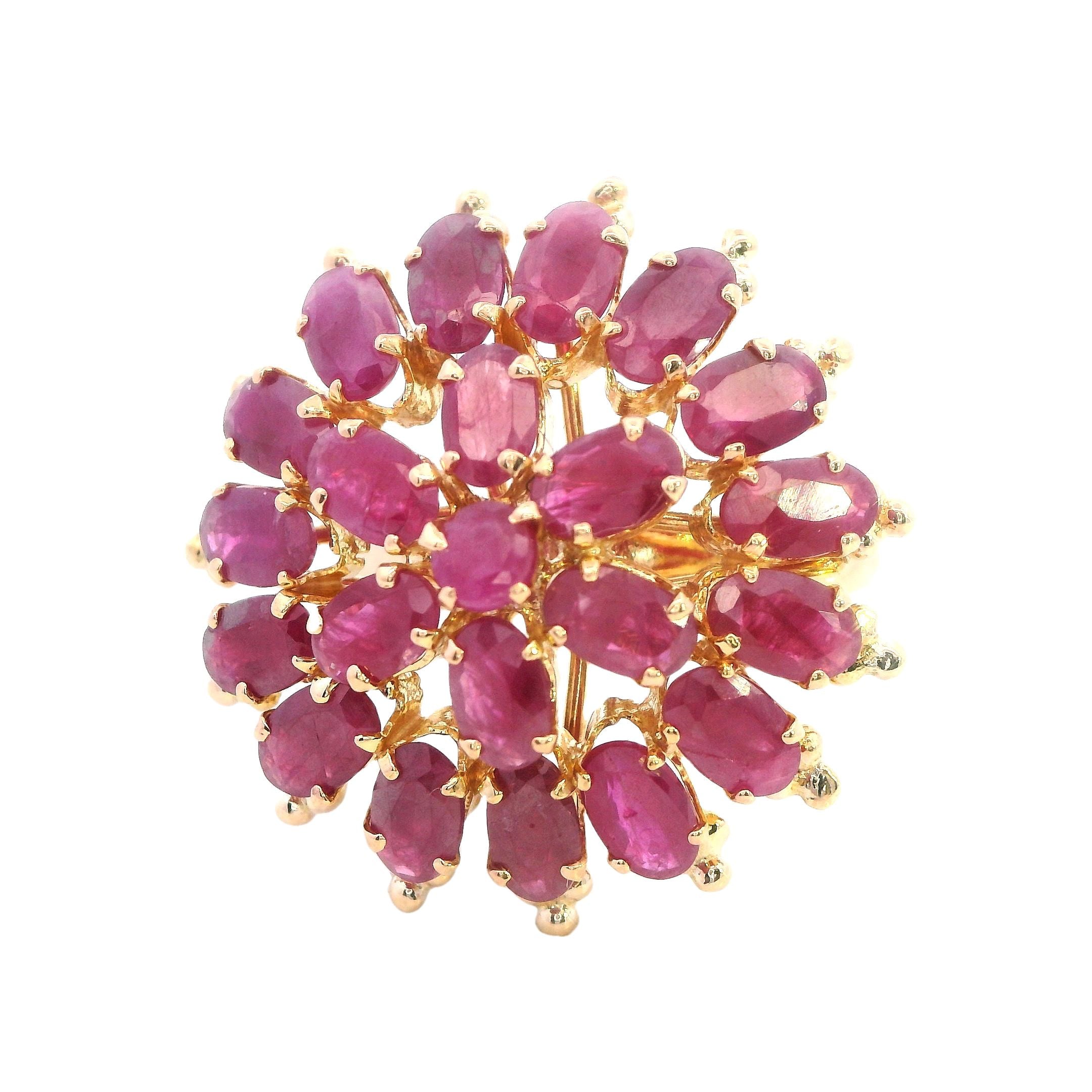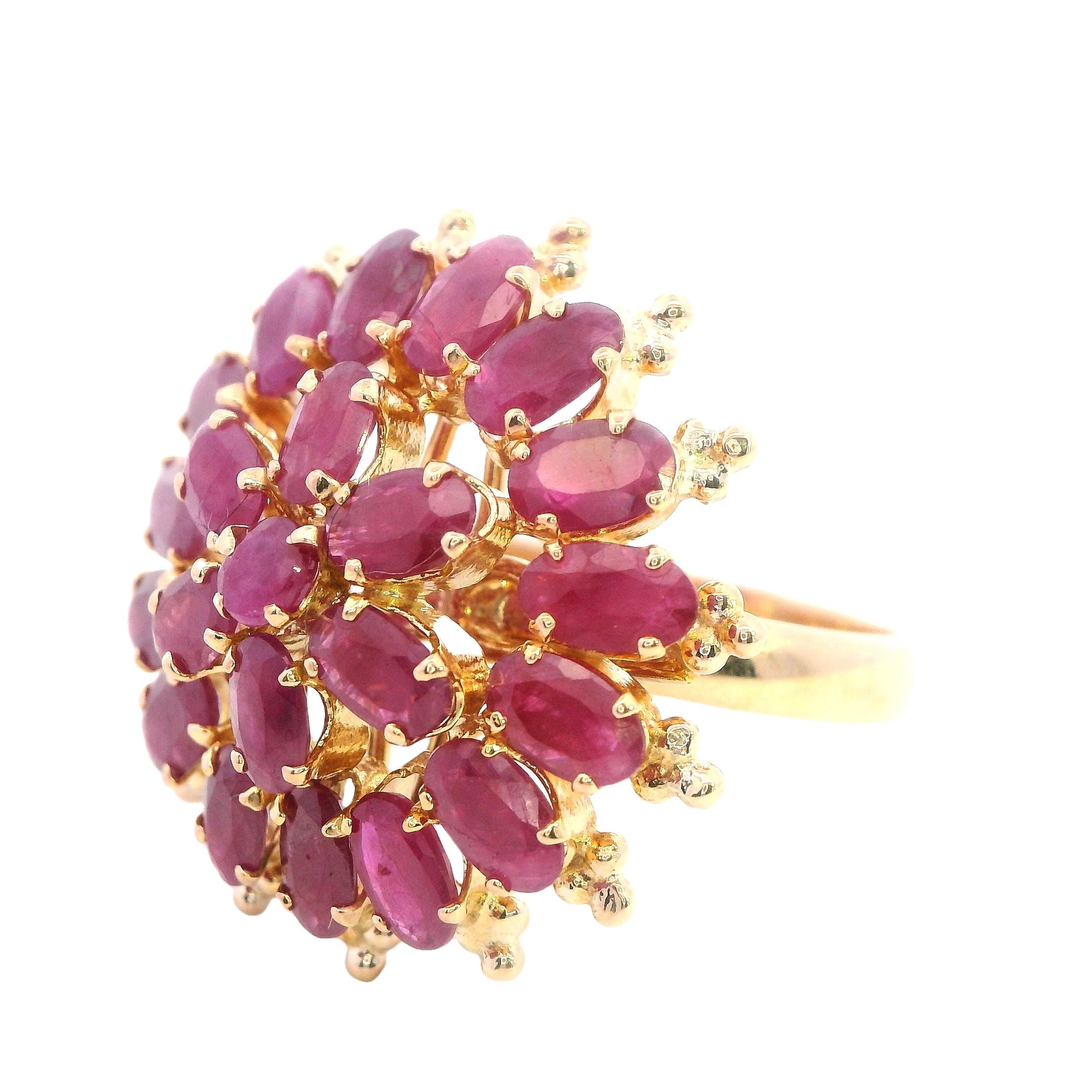 Make a bold statement with this stunning 14K yellow gold ruby cocktail ring. Featuring a tiered head design with a vibrant display of oval and round cut rubies, this ring is perfect for adding a touch of elegance and sophistication to any outfit.