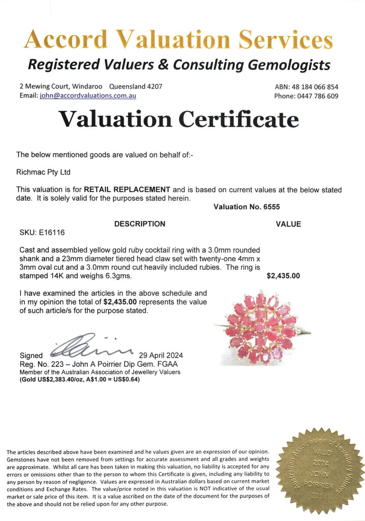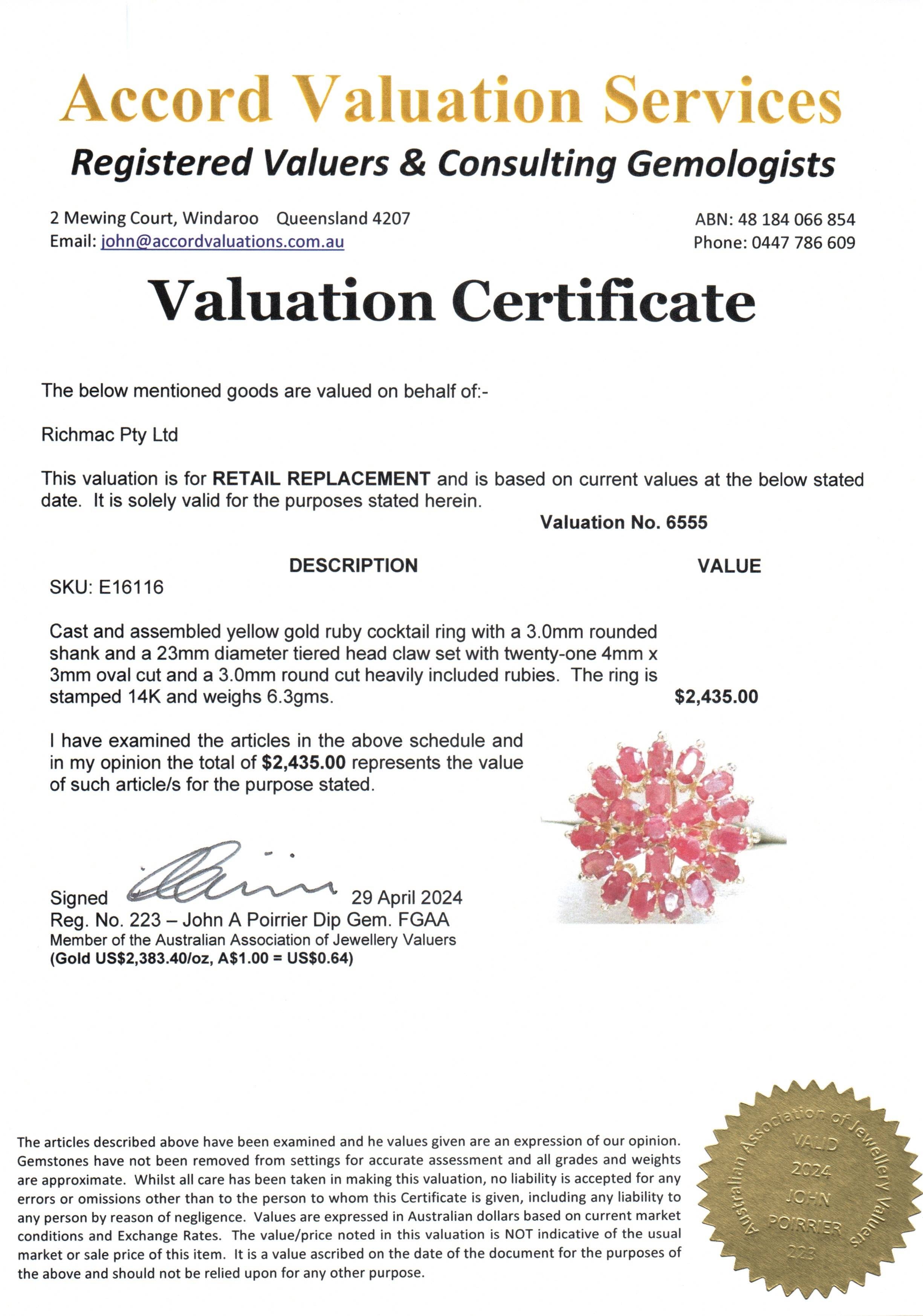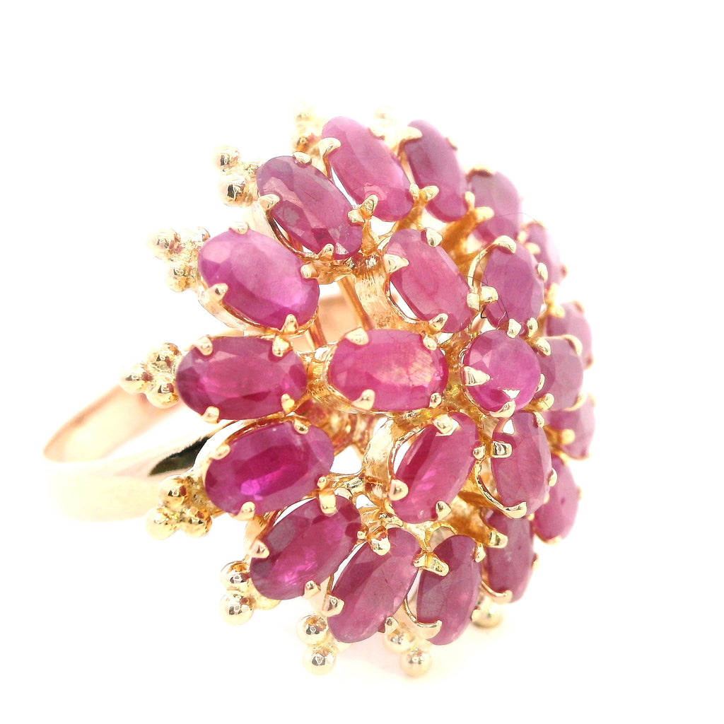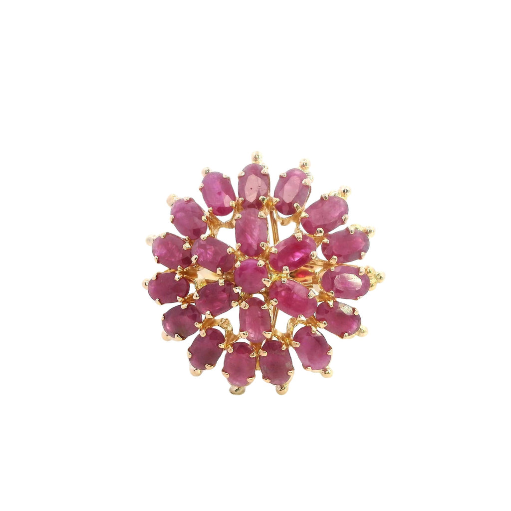 Make a bold statement with this stunning 14K yellow gold ruby cocktail ring. Featuring a tiered head design with a vibrant display of oval and round cut rubies, this ring is perfect for adding a touch of elegance and sophistication to any outfit.