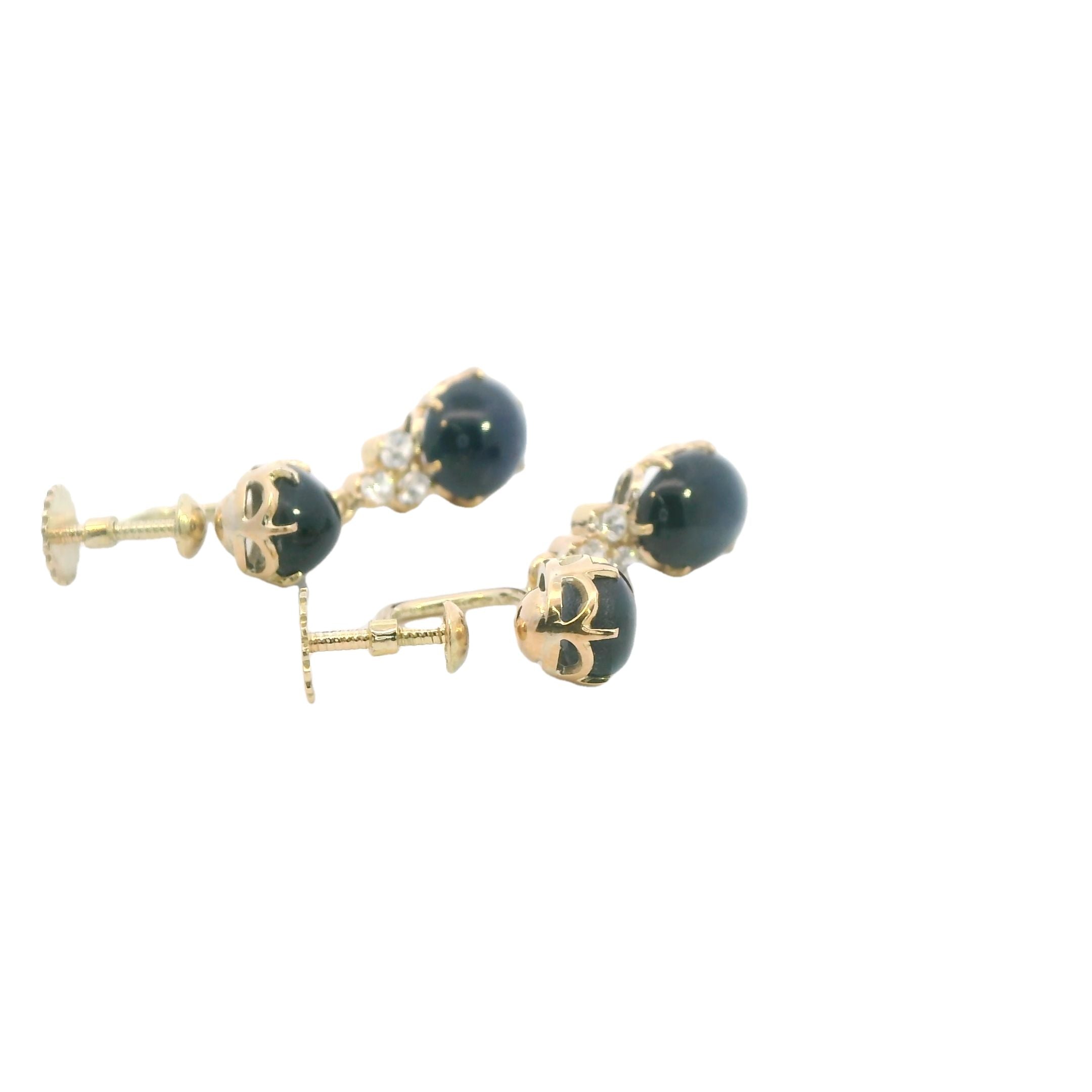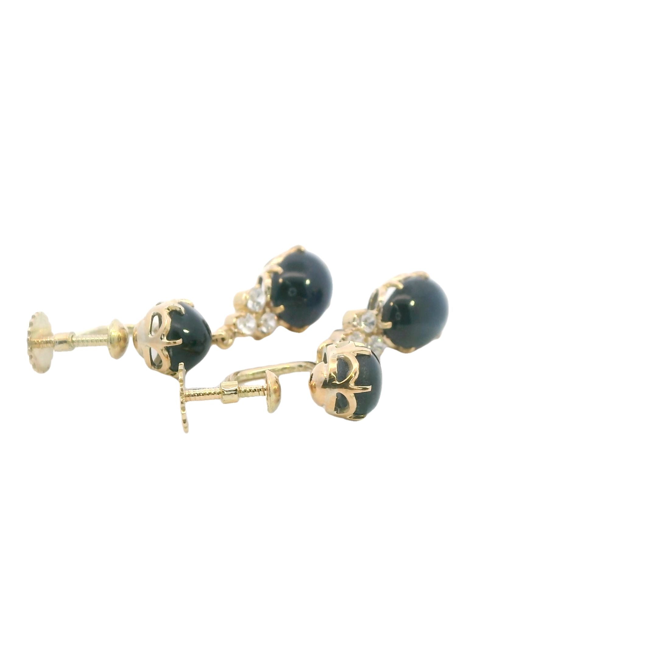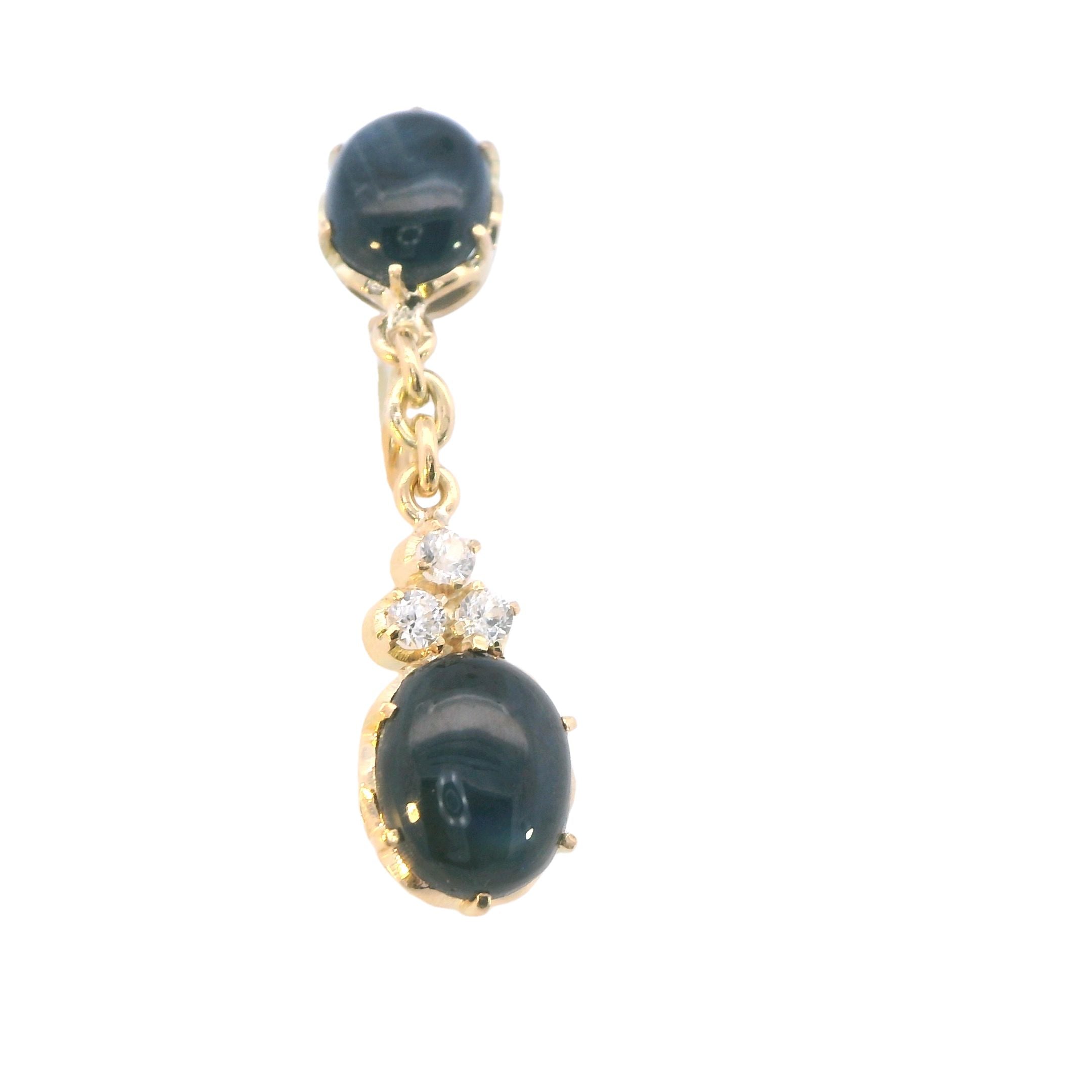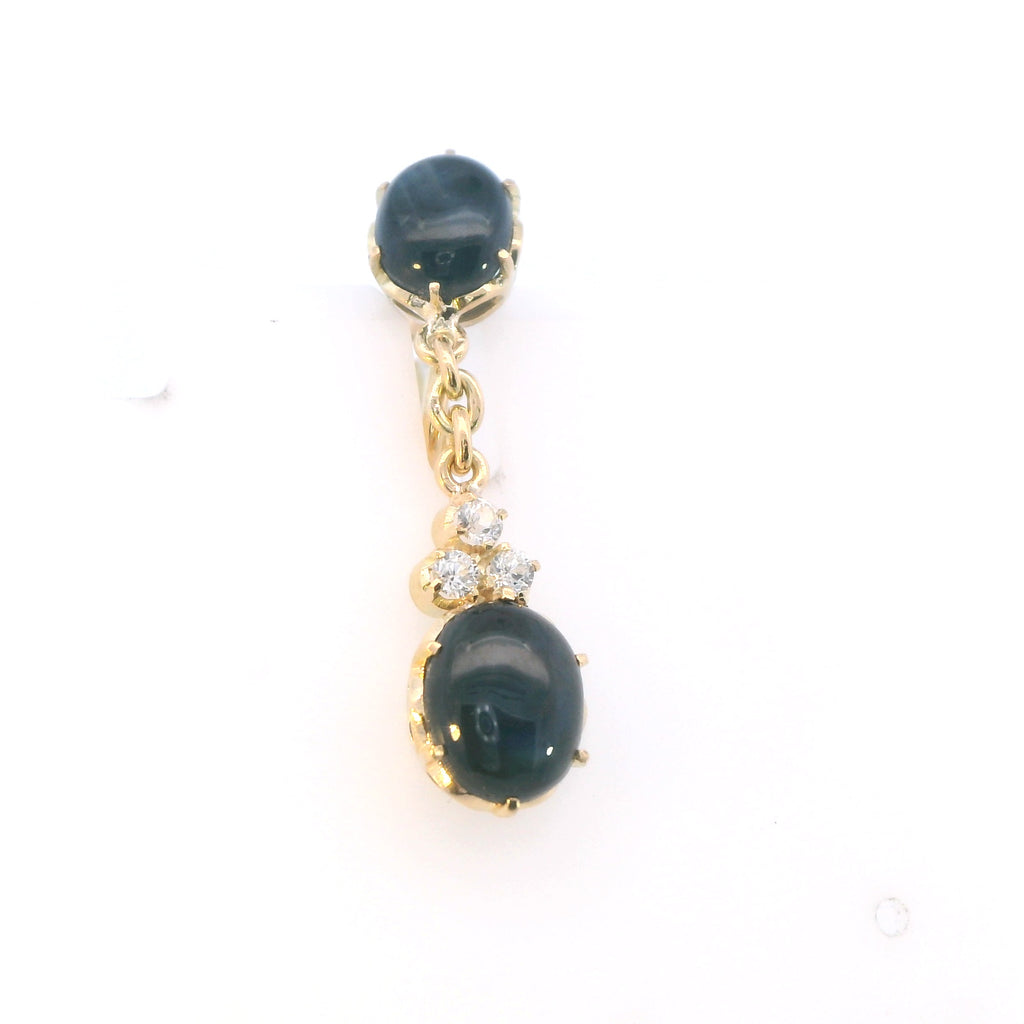 This stunning pair of yellow gold sapphire and diamond drop stud earrings is a true testament to elegance and craftsmanship. Each earring is set with two mesmerizing oval star sapphire cabochons, known for their enchanting star-like reflection caused by light interacting with the stone’s internal structure. These captivating gemstones, one measuring 8mm x 7mm and the other 7mm x 6mm, bring a unique and mystical allure to the earrings.