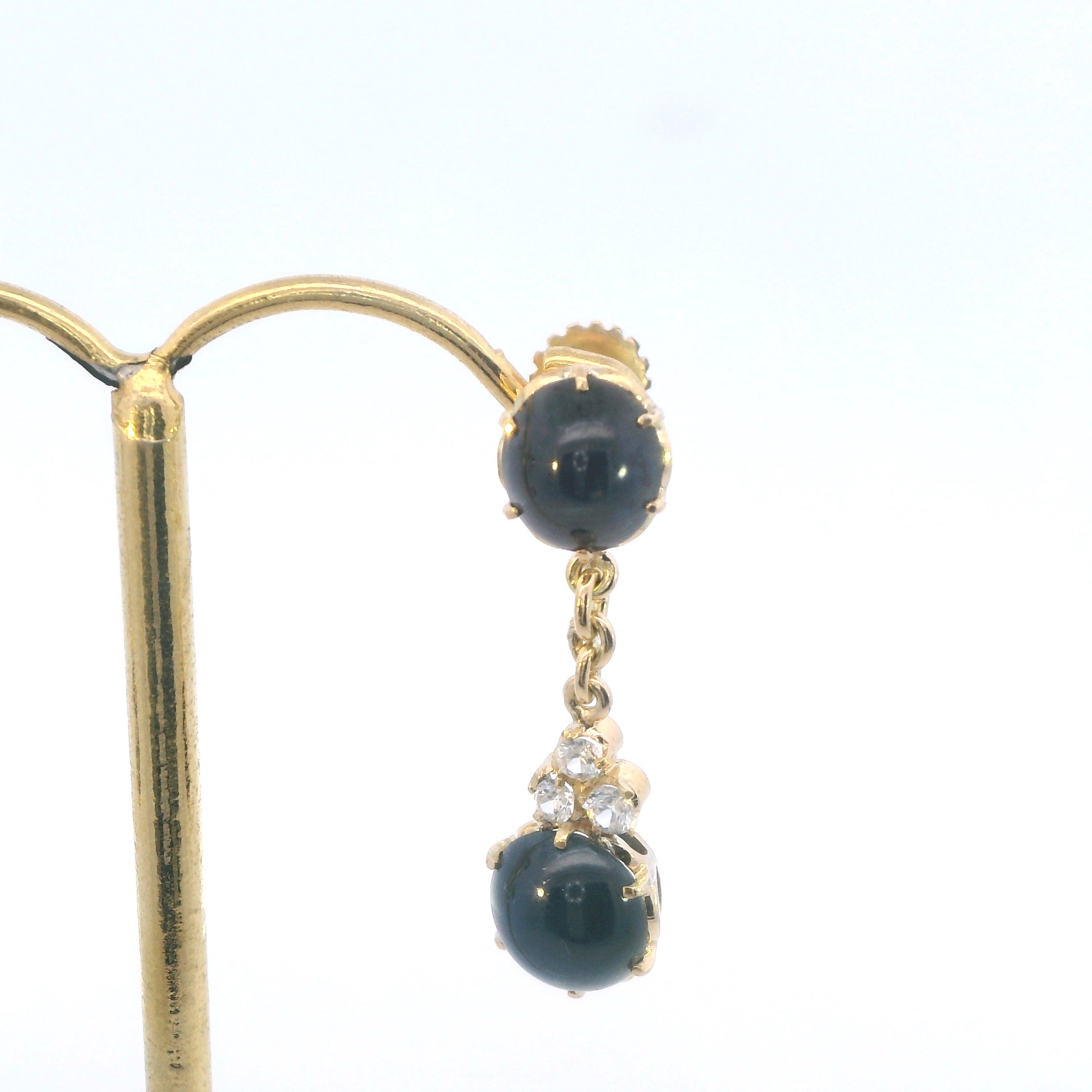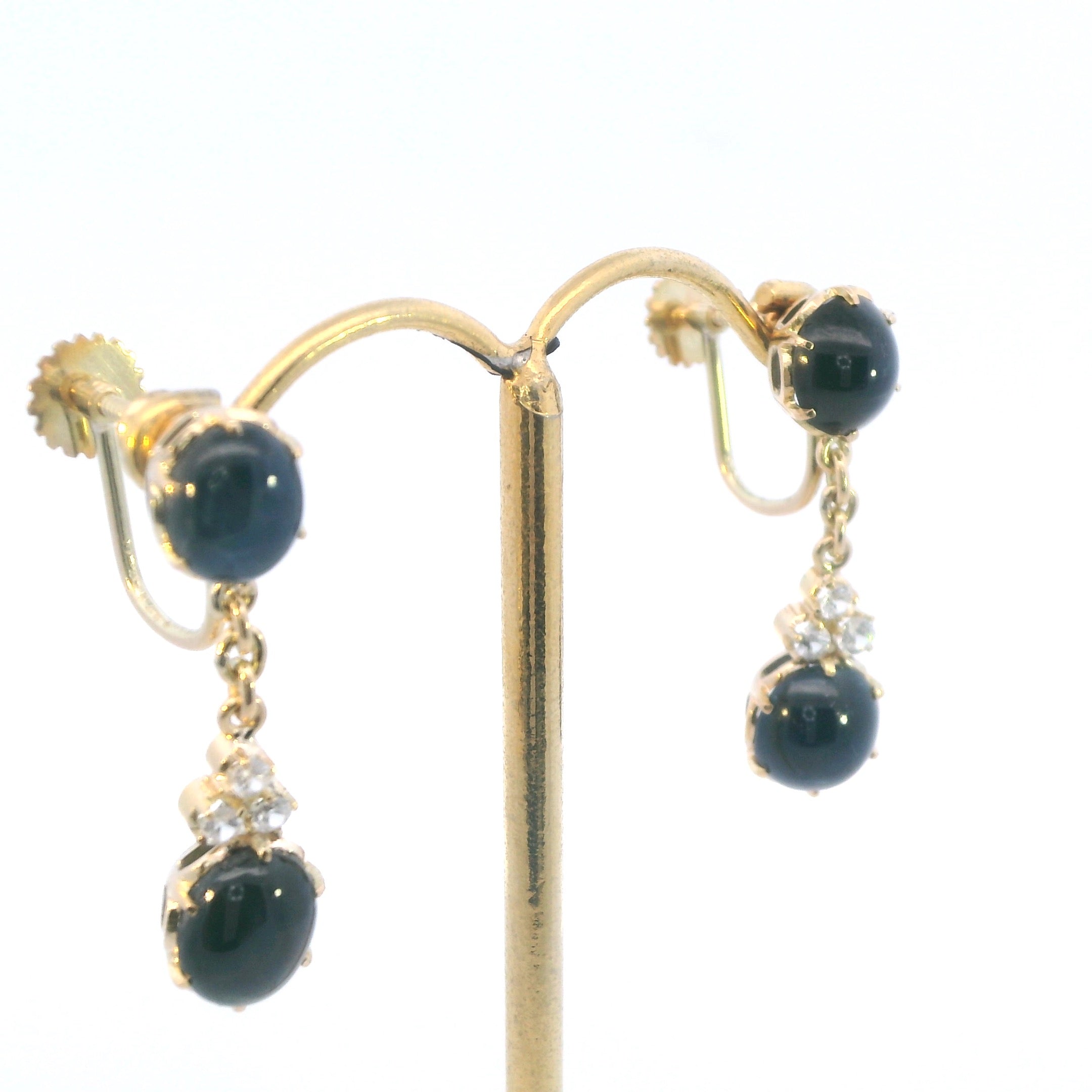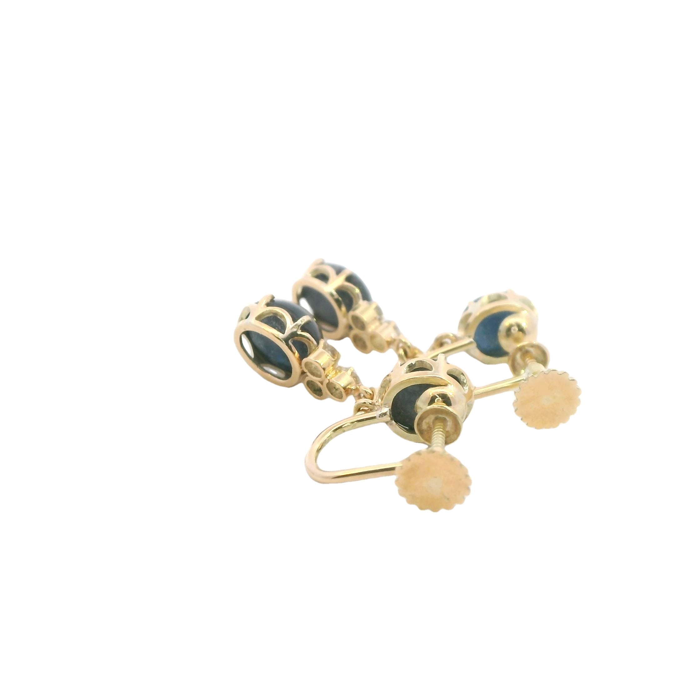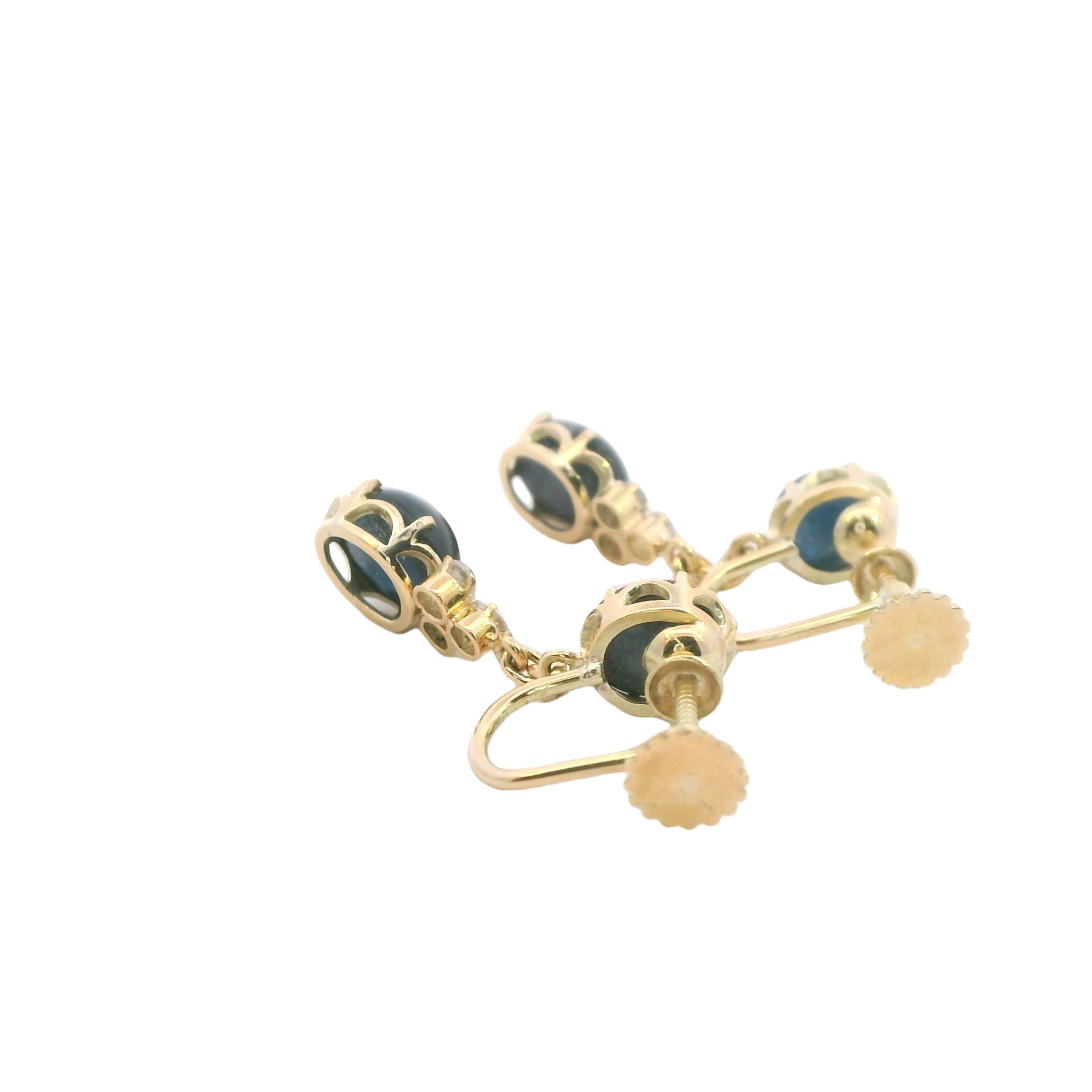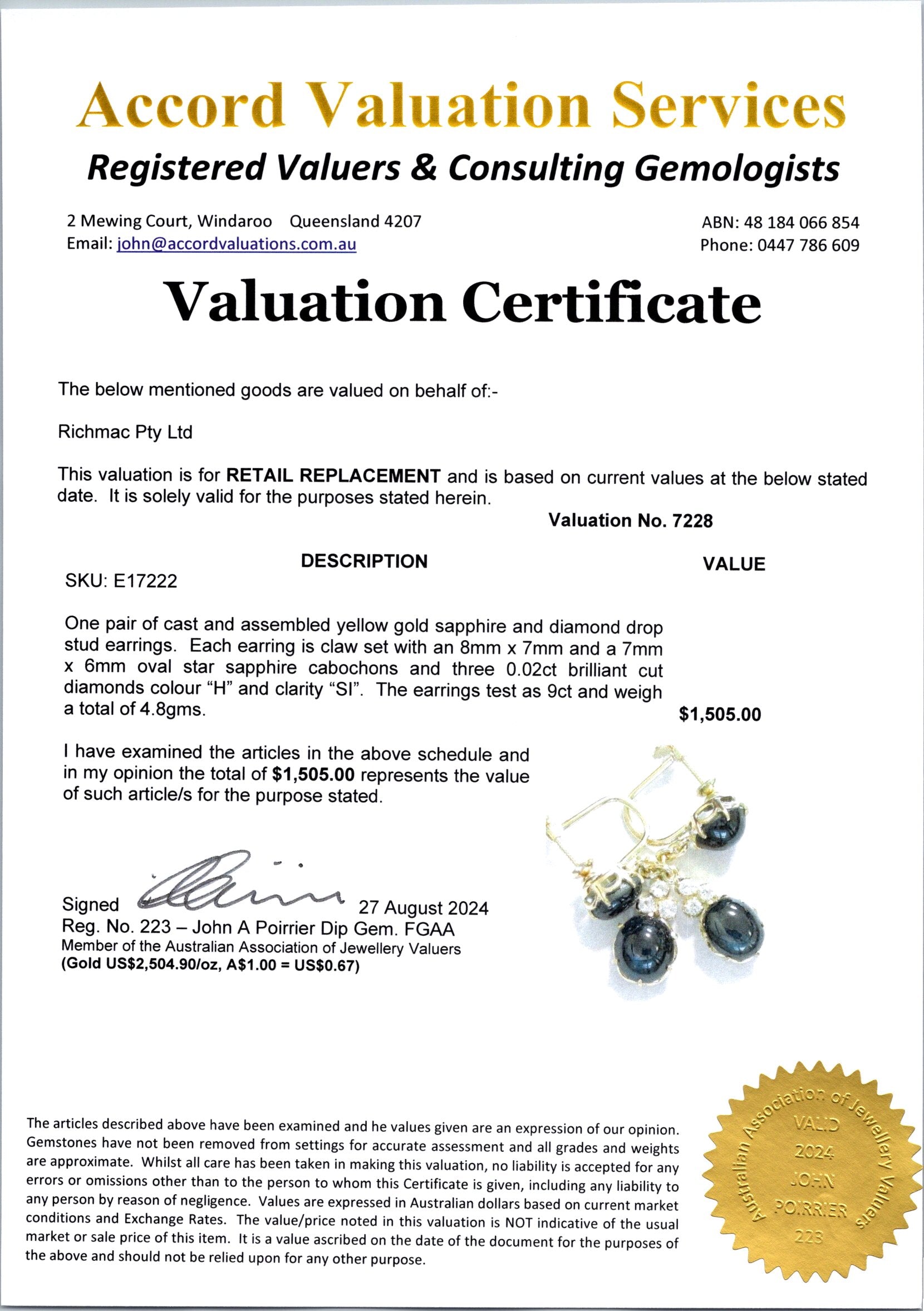 This stunning pair of yellow gold sapphire and diamond drop stud earrings is a true testament to elegance and craftsmanship. Each earring is set with two mesmerizing oval star sapphire cabochons, known for their enchanting star-like reflection caused by light interacting with the stone’s internal structure. These captivating gemstones, one measuring 8mm x 7mm and the other 7mm x 6mm, bring a unique and mystical allure to the earrings.